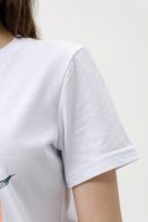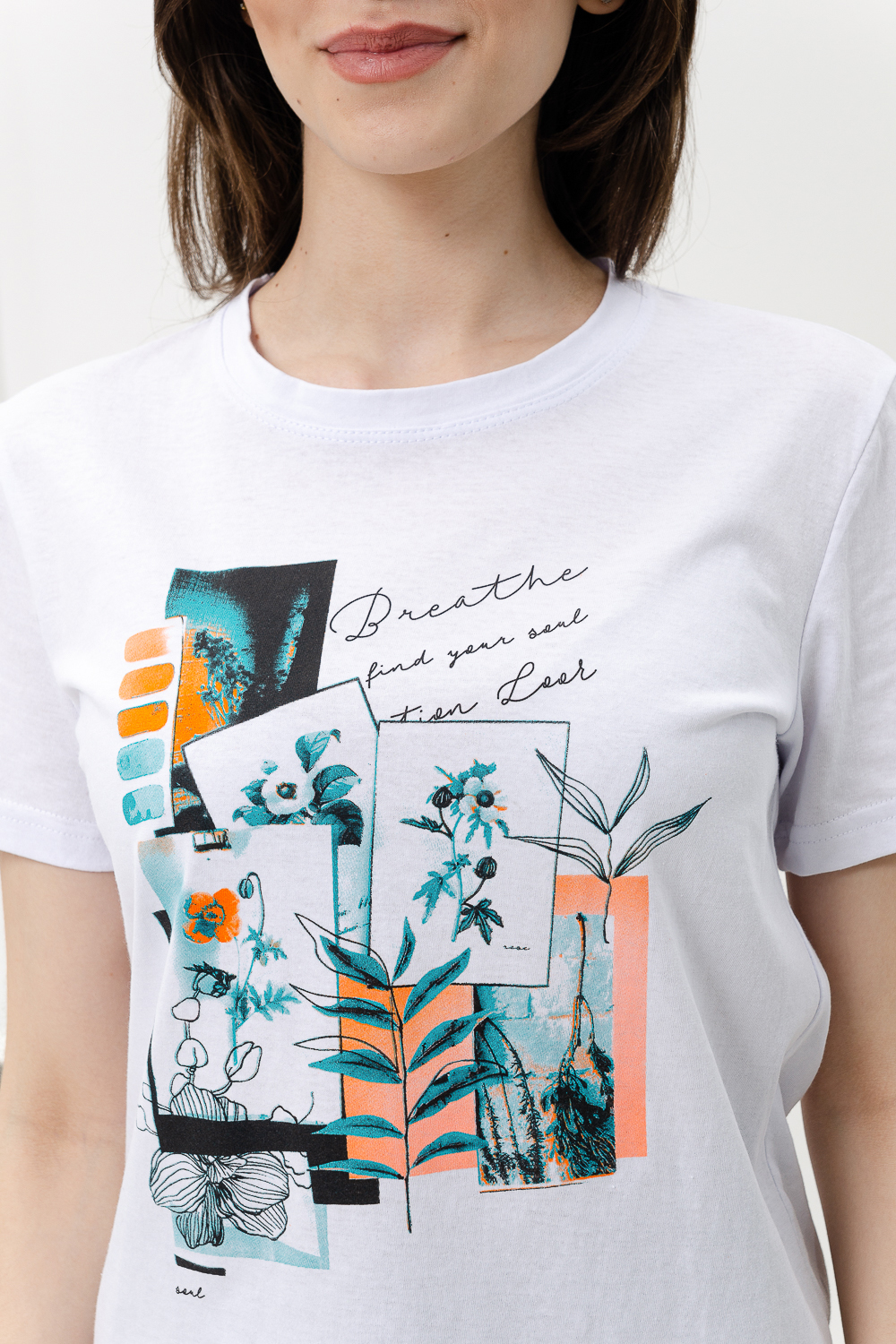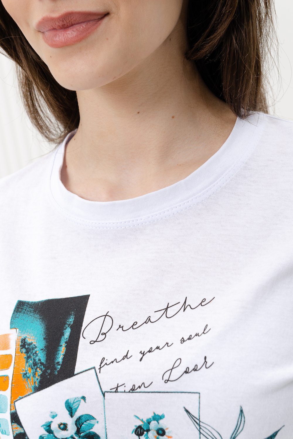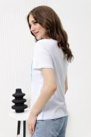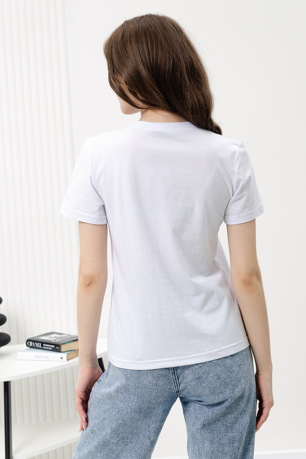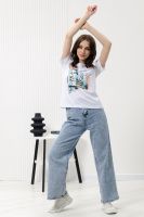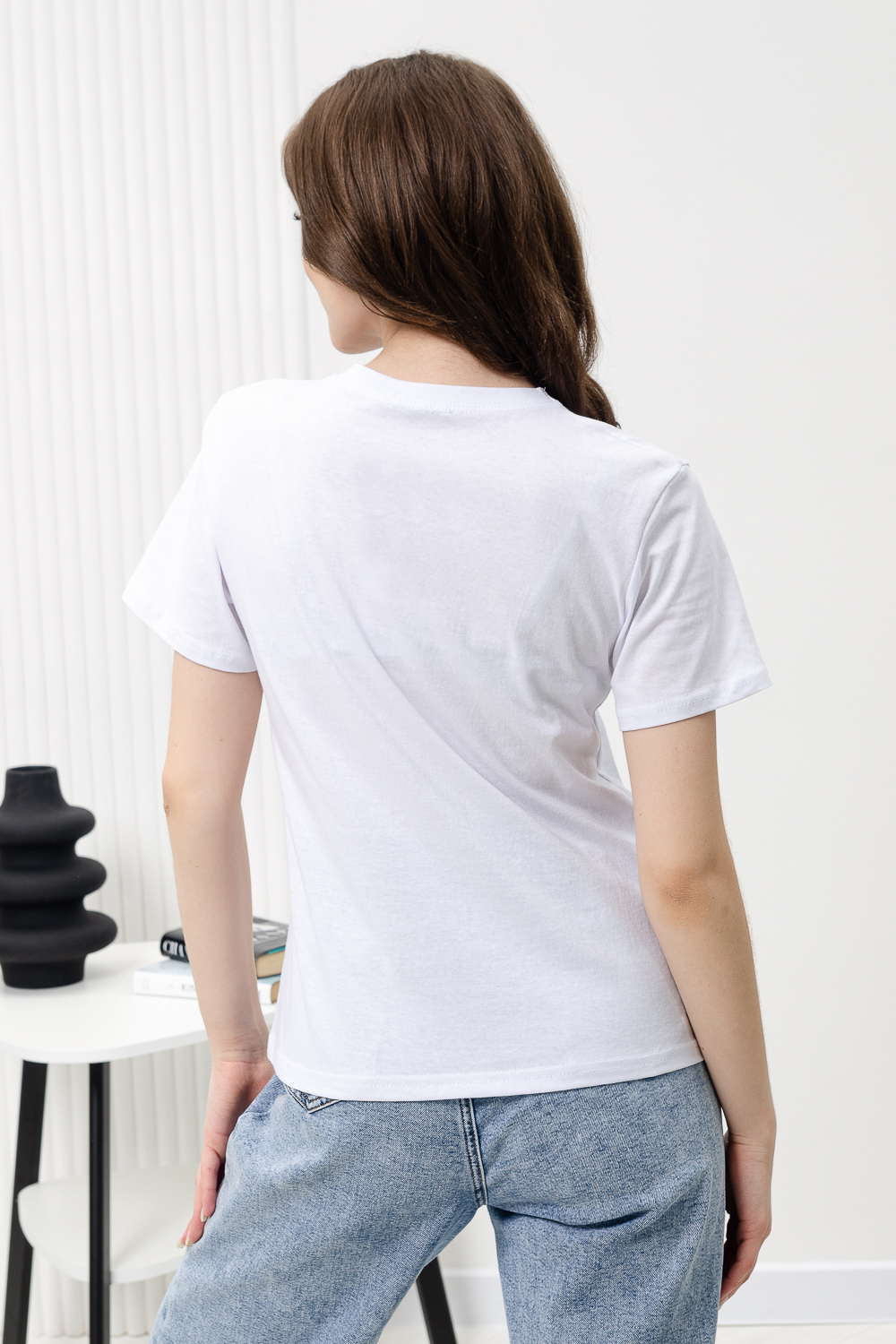 Футболка женская - это классика женского гардероба любой девушки. Это базовая модель с ярким принтом отлично смотрится с джинсами, юбками, брюками. Прямой силуэт, втачной рукав, горловина округлой формы обработана обтачкой из основного полотна.