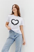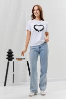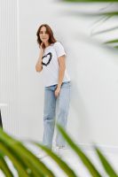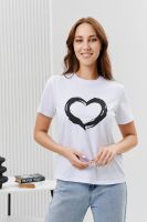 Футболка женская - это классика женского гардероба любой девушки. Это базовая модель с ярким принтом отлично смотрится с джинсами, юбками, брюками. Прямой силуэт, втачной рукав, горловина округлой формы обработана обтачкой из основного полотна.