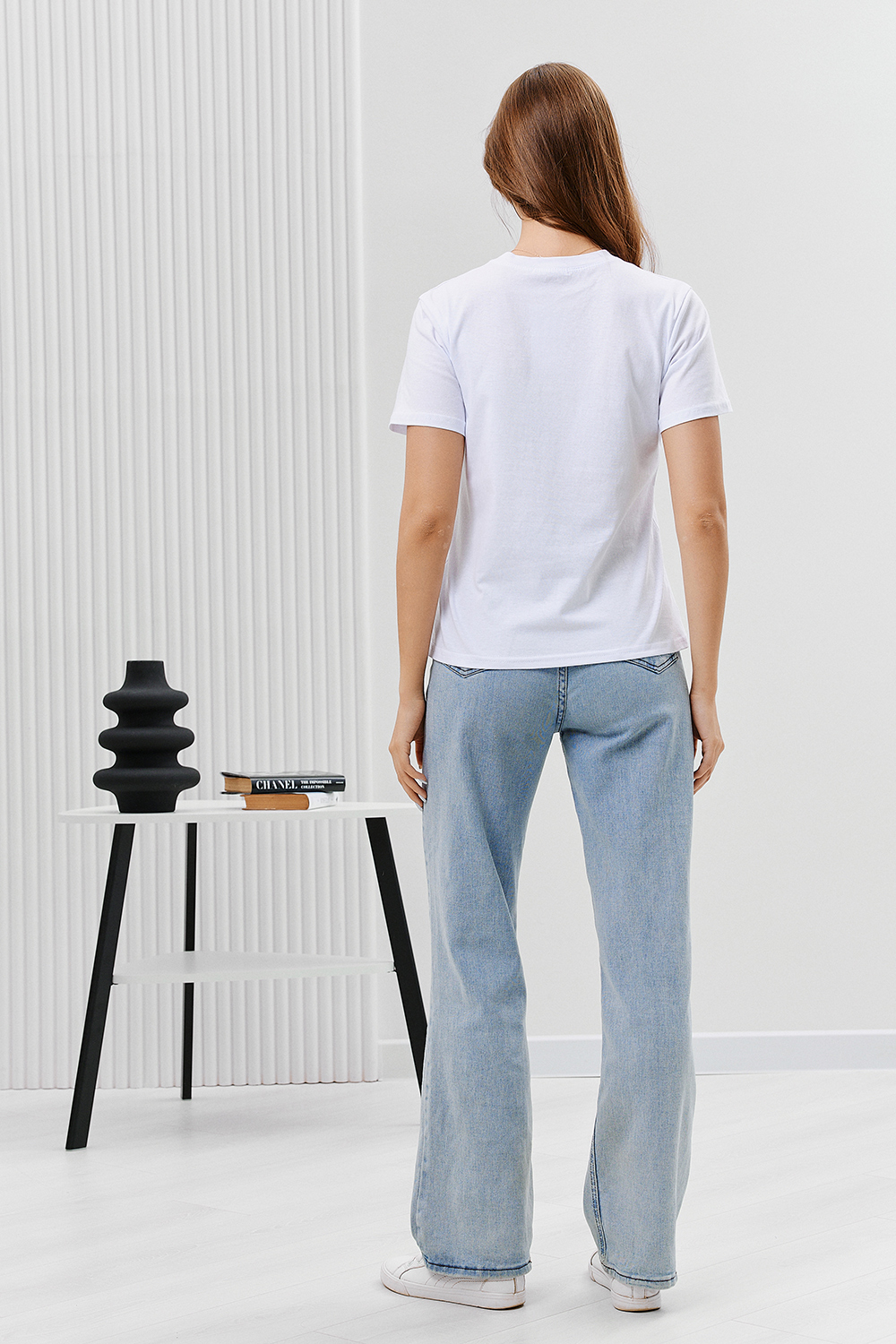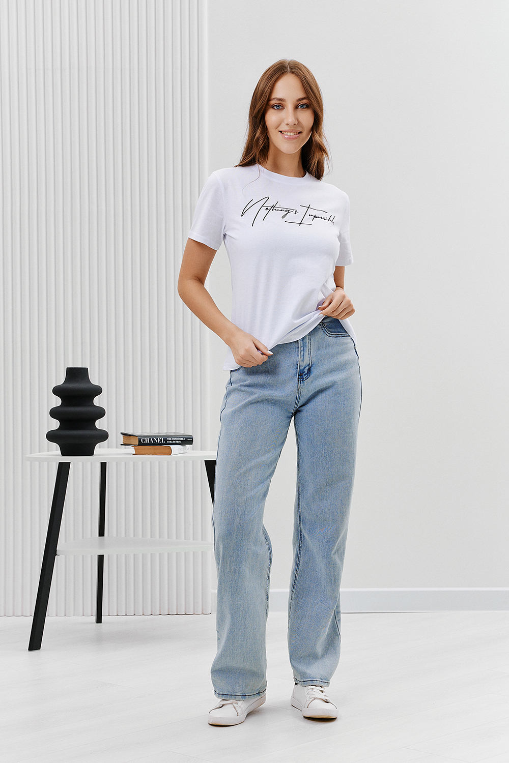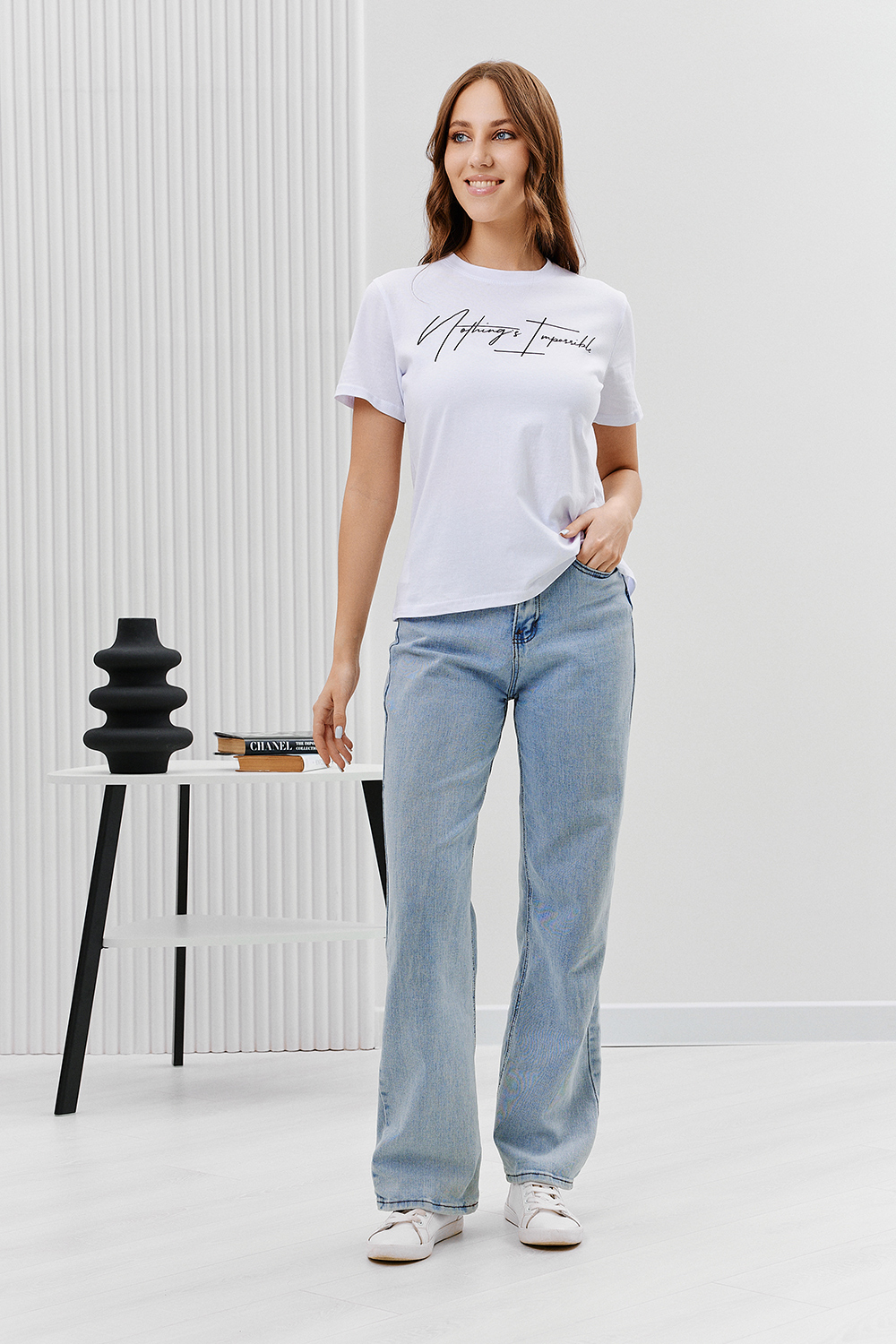 Футболка женская - это классика женского гардероба любой девушки. Это базовая модель с ярким принтом отлично смотрится с джинсами, юбками, брюками. Прямой силуэт, втачной рукав, горловина округлой формы обработана обтачкой из основного полотна.