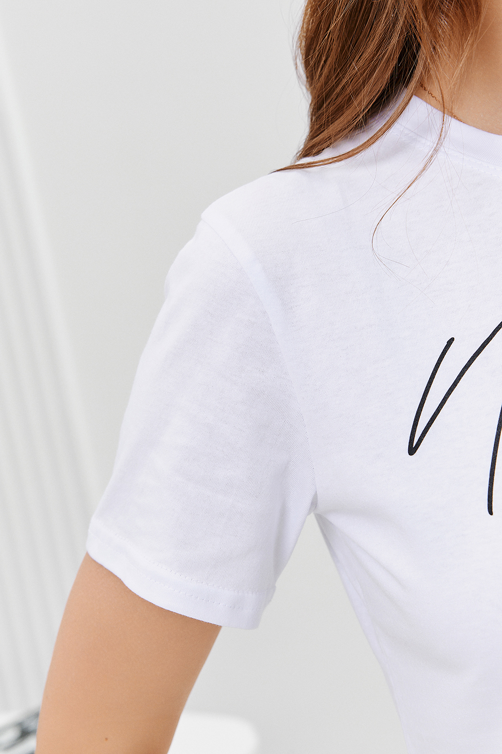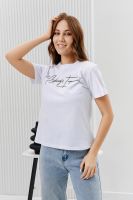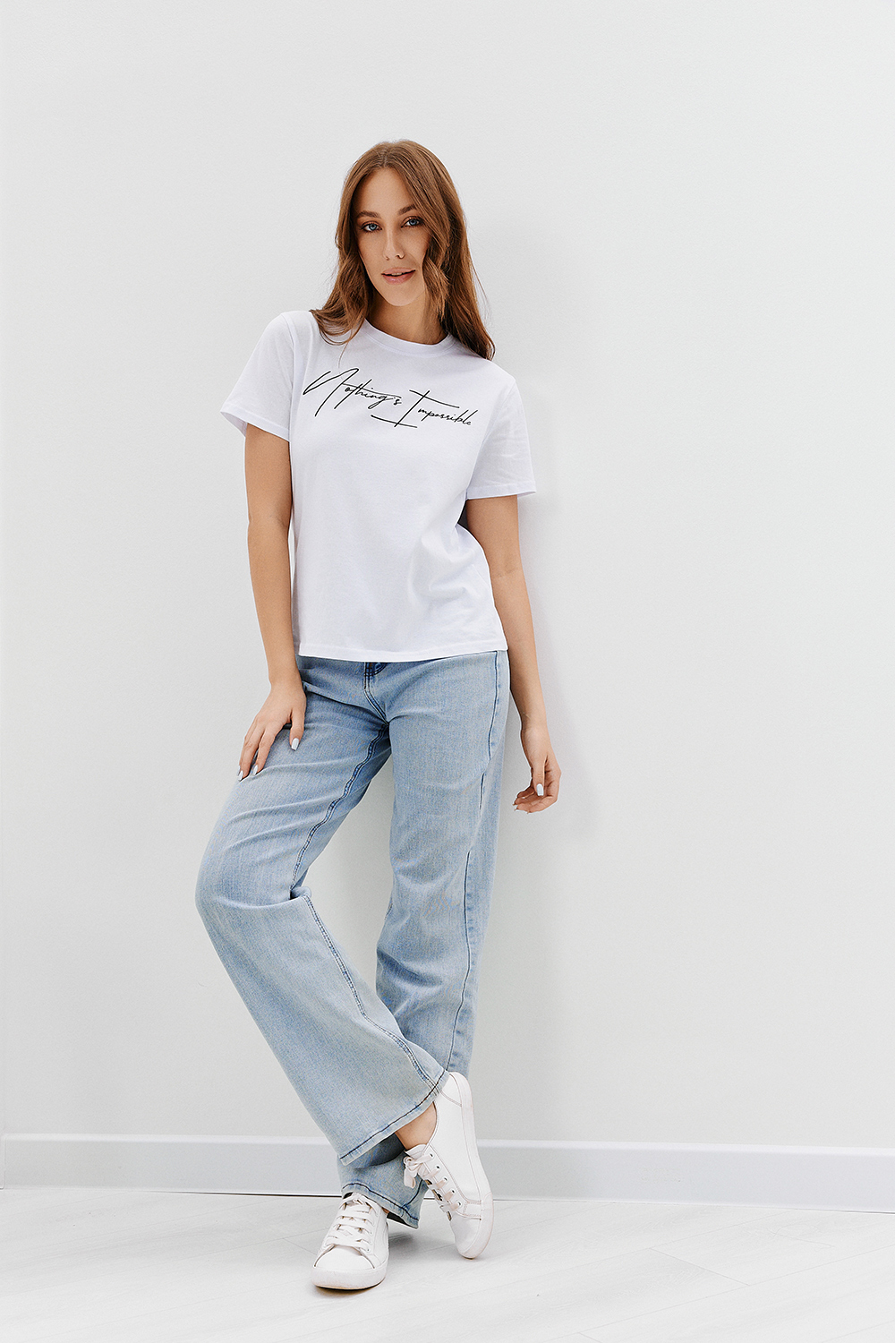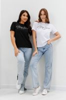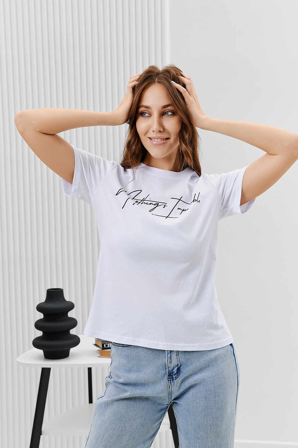 Футболка женская - это классика женского гардероба любой девушки. Это базовая модель с ярким принтом отлично смотрится с джинсами, юбками, брюками. Прямой силуэт, втачной рукав, горловина округлой формы обработана обтачкой из основного полотна.