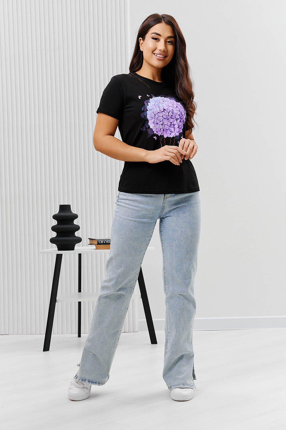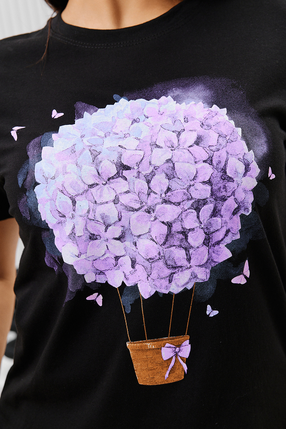 Футболка женская - это классика женского гардероба любой девушки. Это базовая модель с ярким принтом отлично смотрится с джинсами, юбками, брюками. Прямой силуэт, втачной рукав, горловина округлой формы обработана обтачкой из основного полотна.