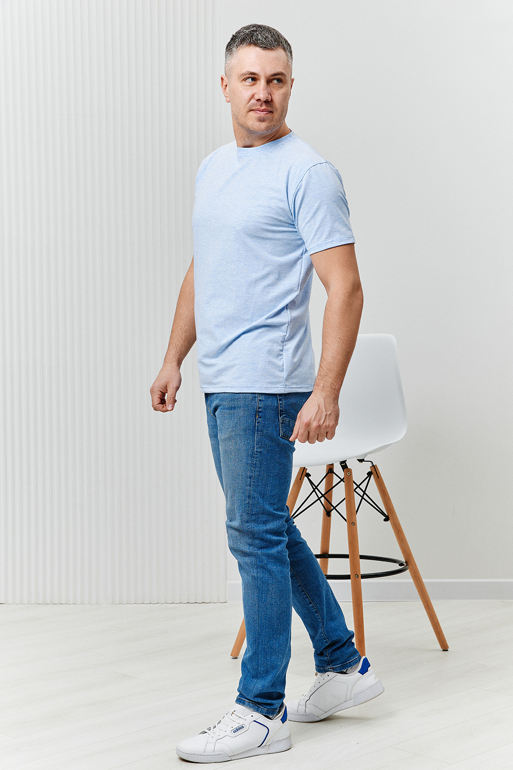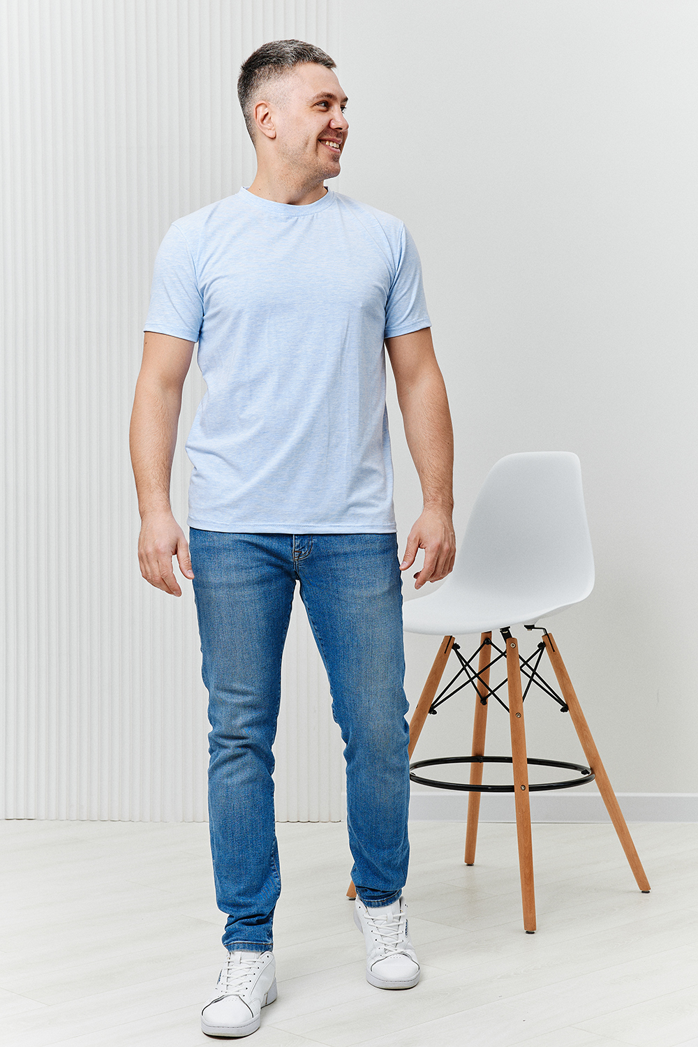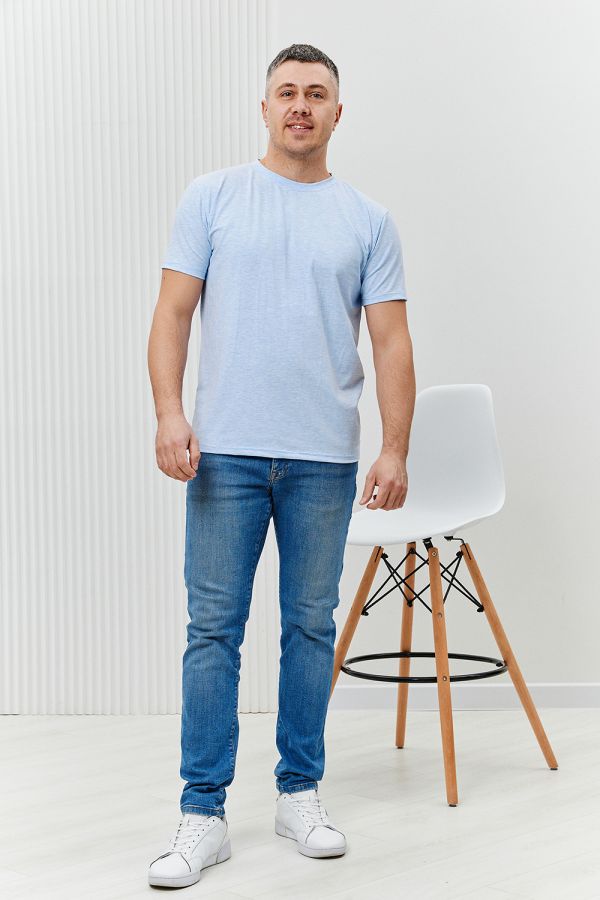 Футболка мужская из кулирки с лайкрой с круглым вырезом. Горловина обработана бейкой из основной ткани, рукав подшит. Футболка очень комфортная, прекрасно подойдет как для дома, так и для отдыха и прогулок.