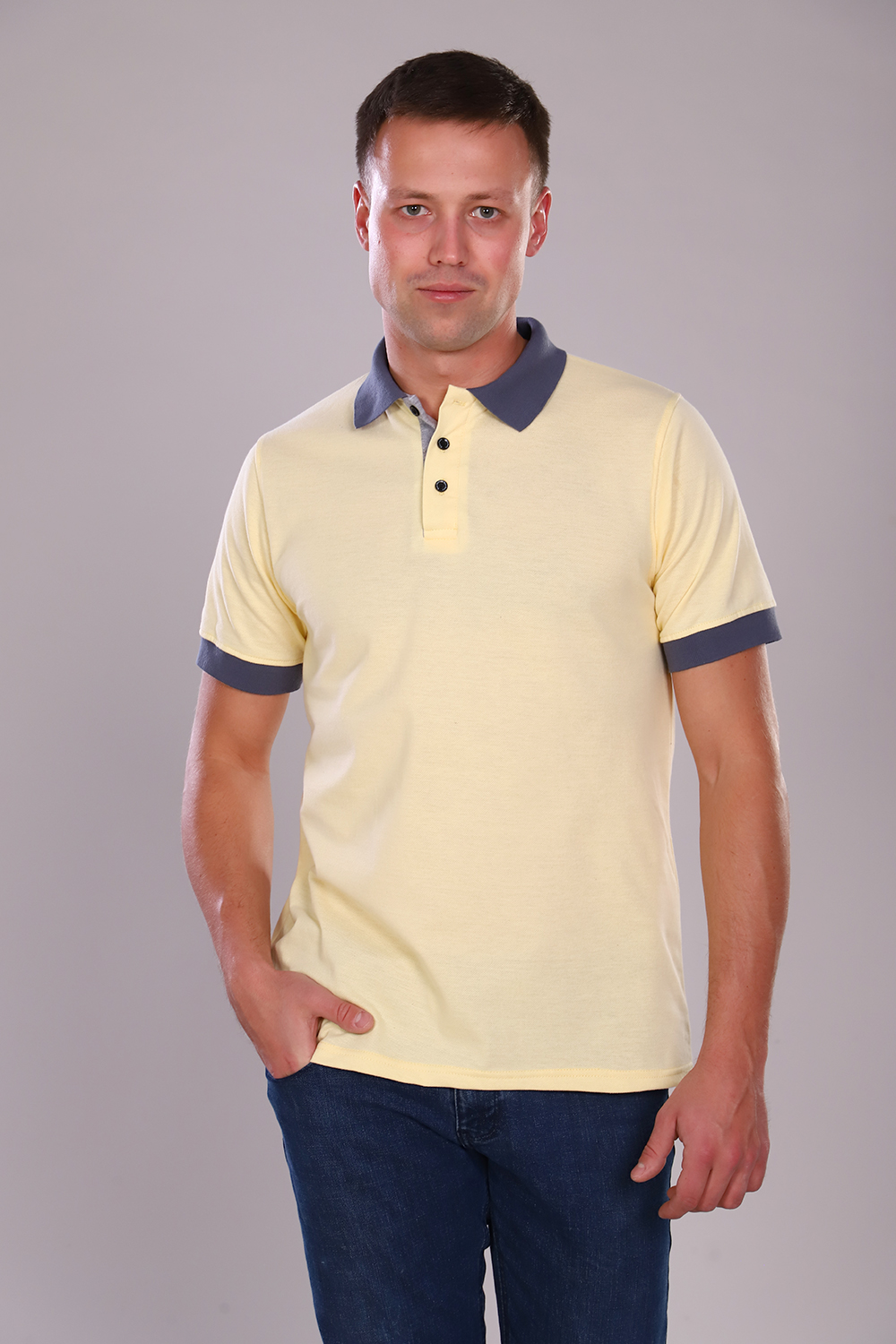 Футболка поло мужская из ткани лакост пике 100% хлопок. Вязаный воротник и манжеты в контрастном сером цвете. Планка выполнена на трех пуговицах с выделенным цветом нижней планки. Футболка очень удобна и комфортна в носке. Подойдет для дома, отдыха и прогулок. Сохраняет цвет и форму после стирки