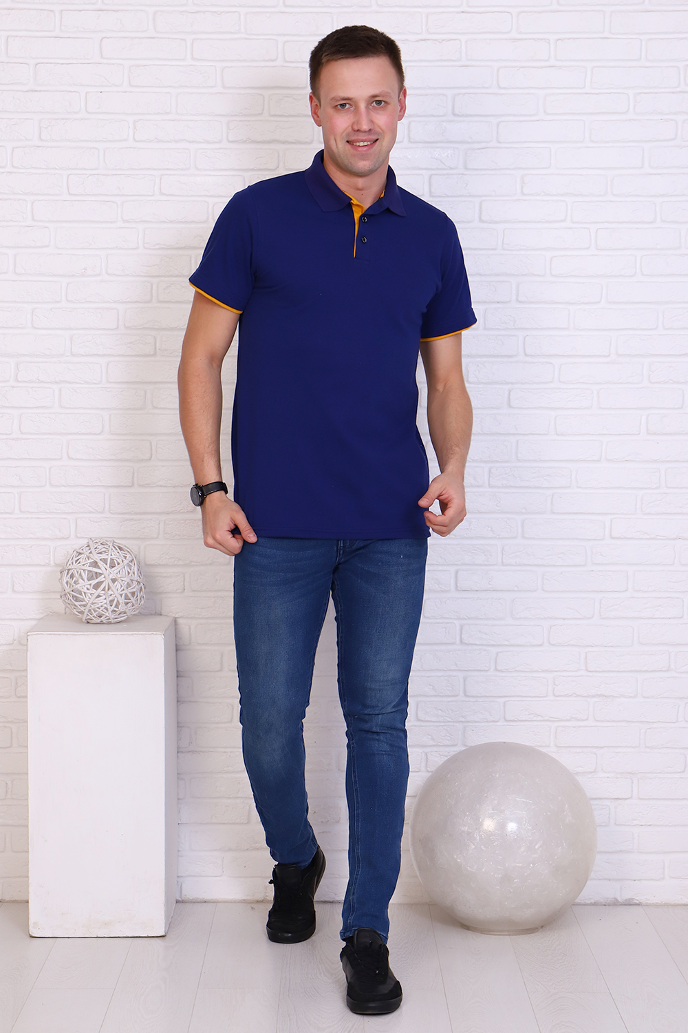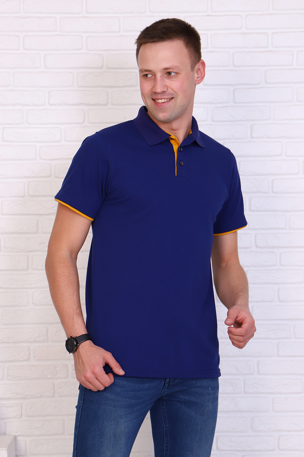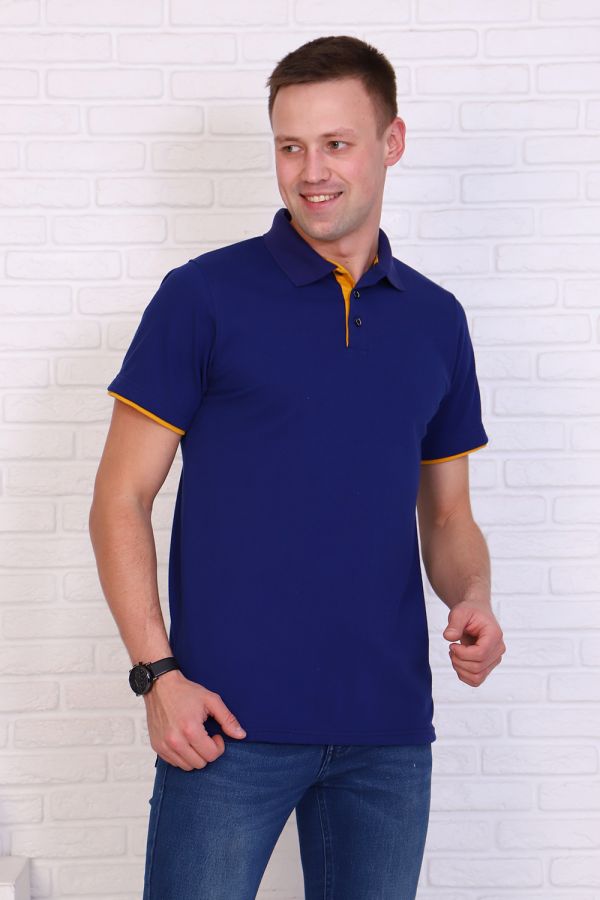 Футболка поло мужская из ткани лакост пенье 100% хлопок насыщенного синего цвета. Воротник вязаный в цвет футболки, отделка на рукаве и планка яркого контрастного цвета, по бокам разрезы. Планка застегивается на 3 пуговицы. Футболка удобная и комфортная, подойдет для повседневной носки, прогулок и отдыха, после стирки сохраняет цвет и форму.