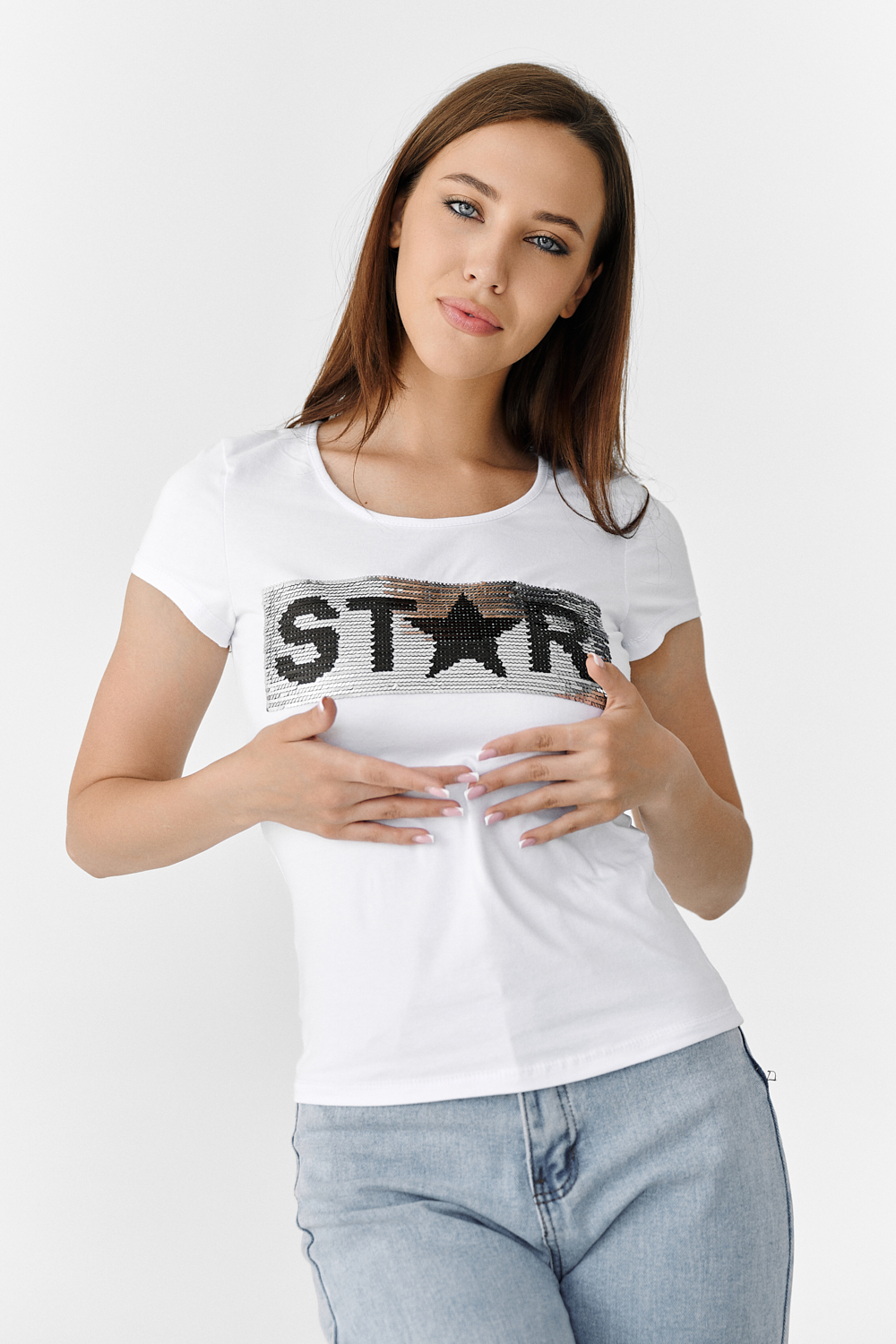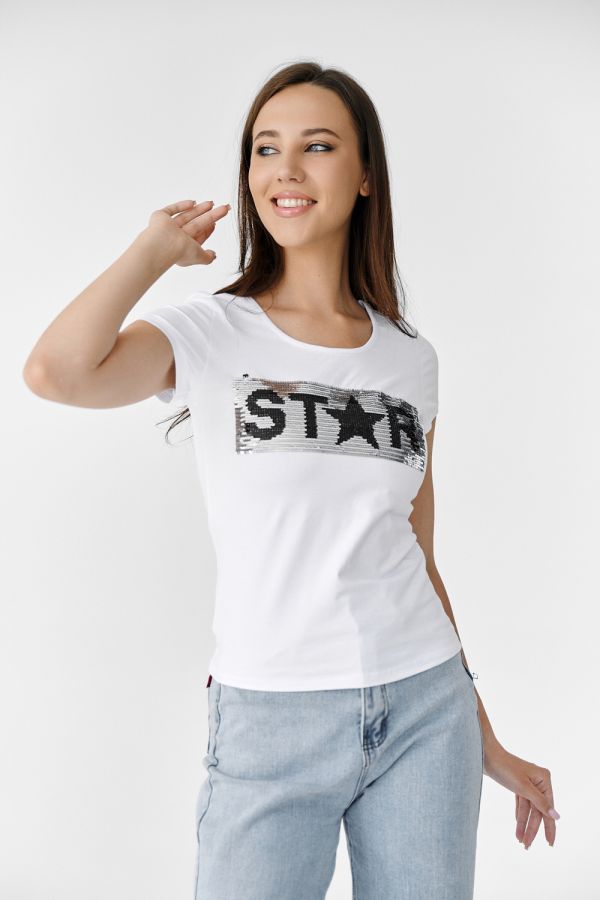 Футболка полуприлегающего силуэта, с округлой горловиной, длиной до середины бедра. Рукав втачной короткий. Горловина обработана бейкой из основного полотна. Пайетки двусторонние