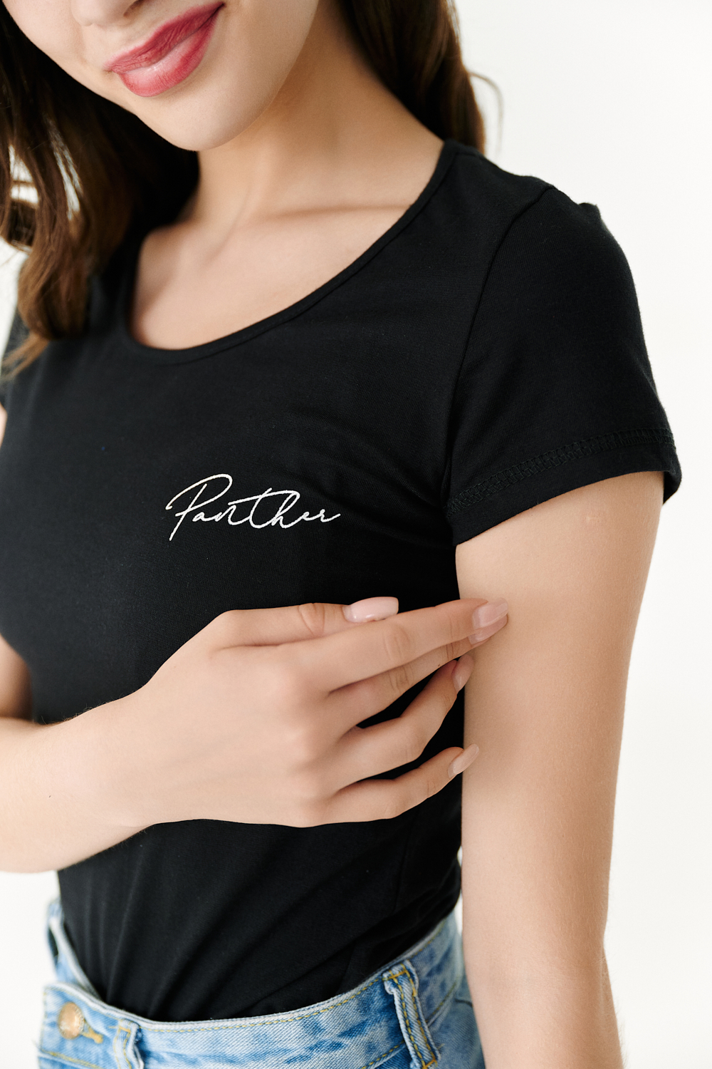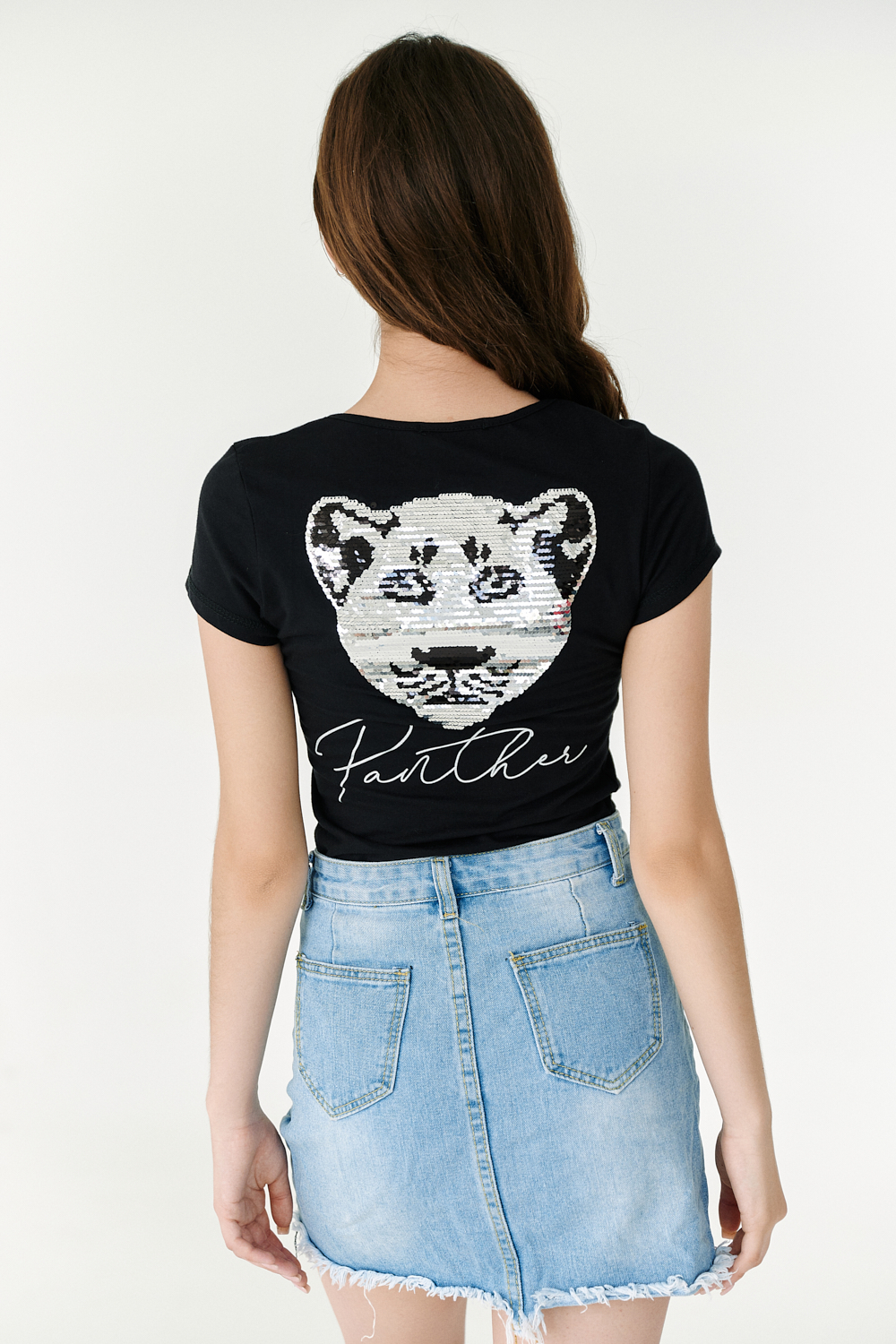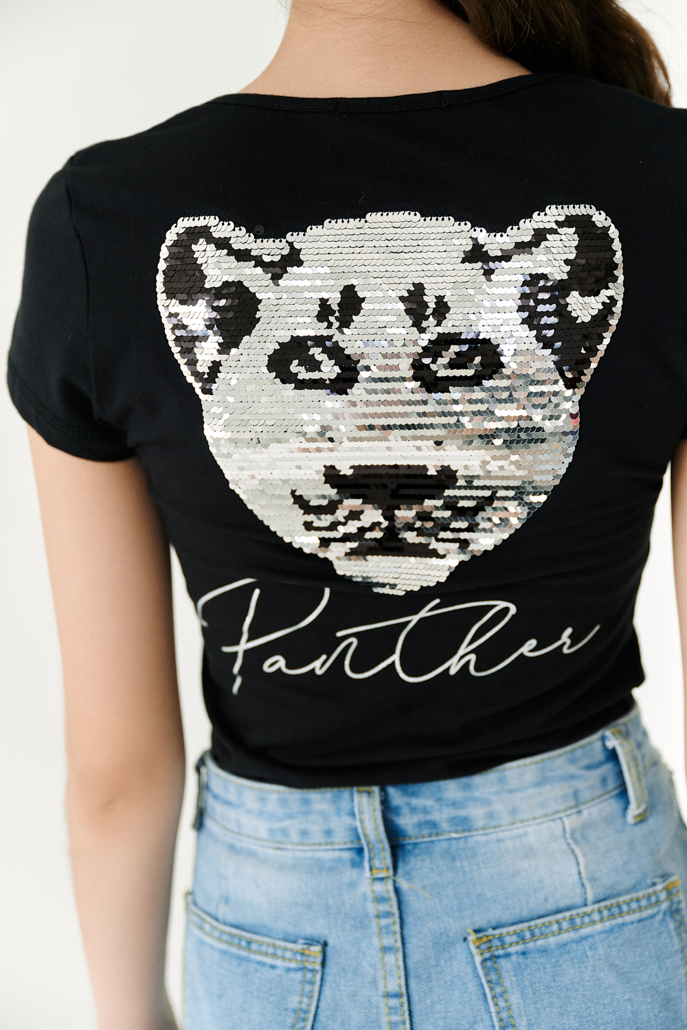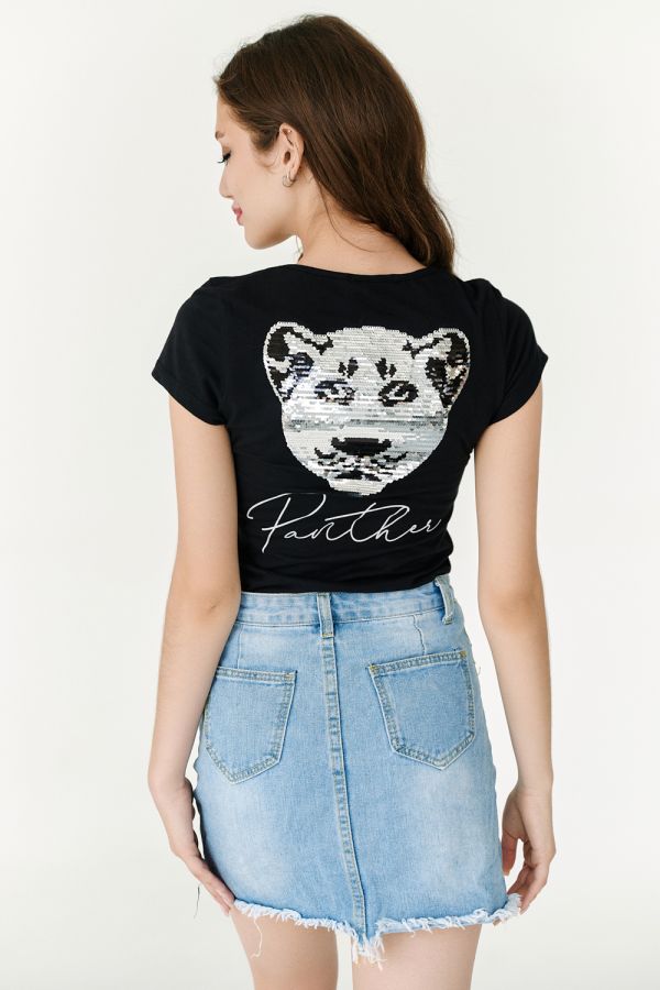 Футболка полуприлегающего силуэта, с округлой горловиной, длиной до середины бедра. Рукав втачной короткий. Горловина обработана бейкой из основного полотна. На спине большая аппликация из пайеток в виде головы пантеры и печать-надпись серебряным глиттером. На передней полочке небольшая печать.