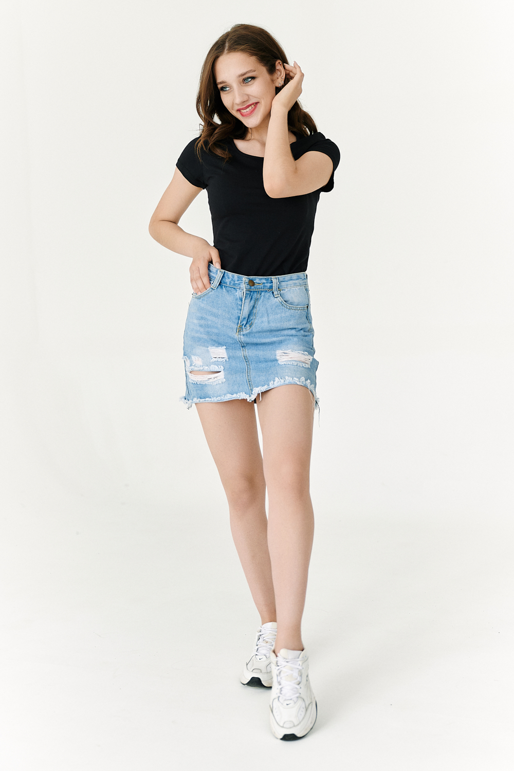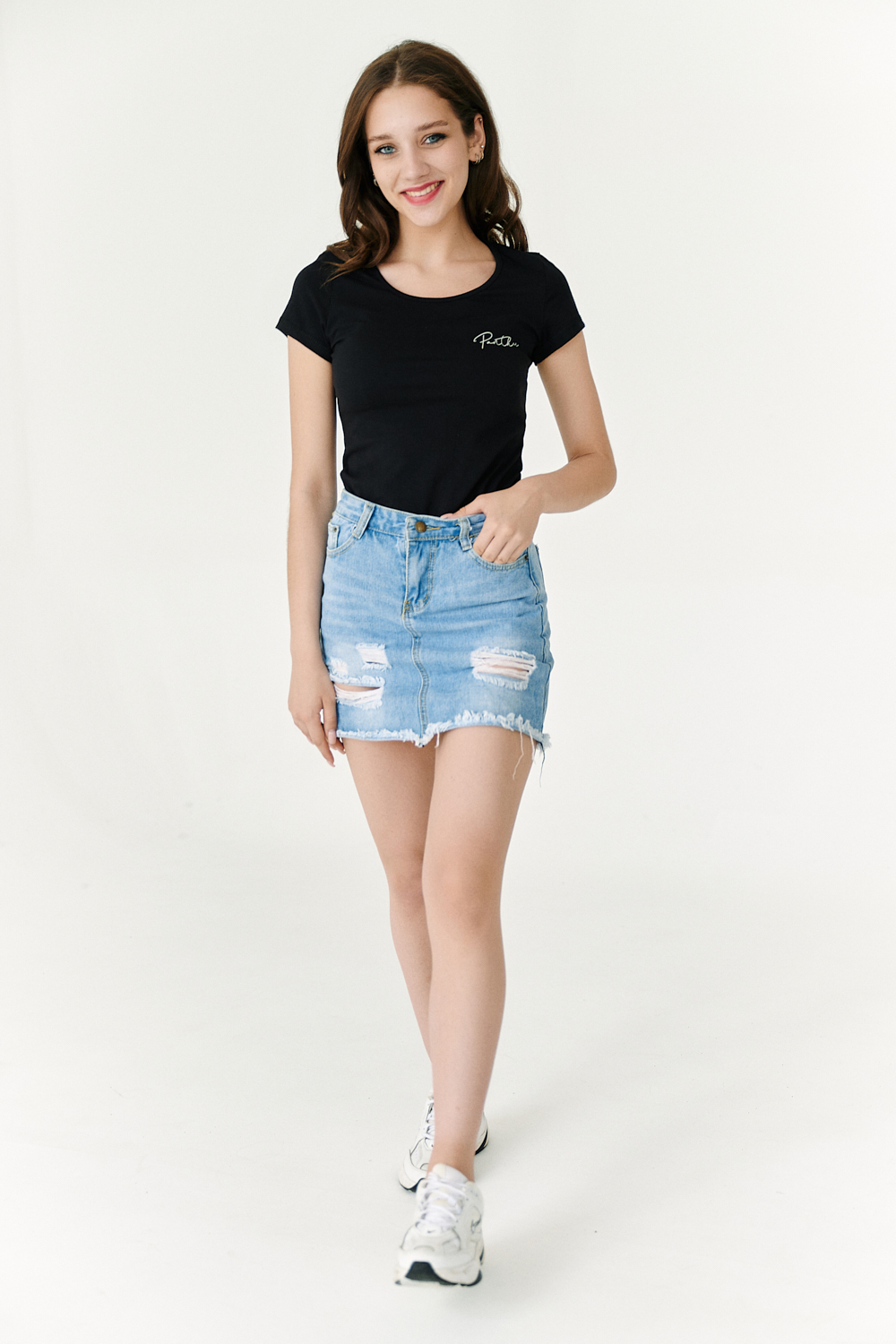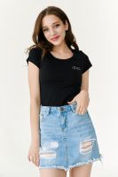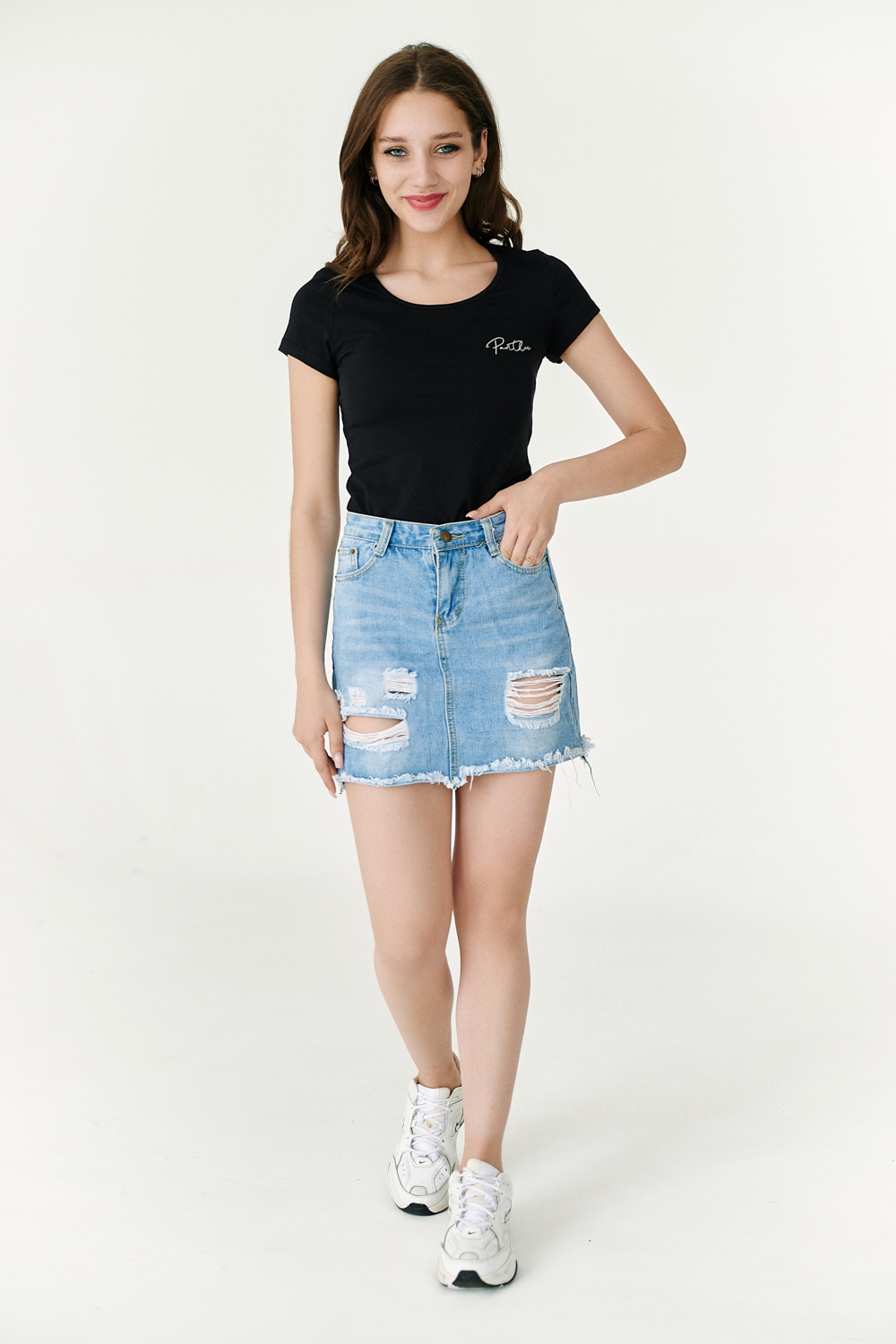 Футболка полуприлегающего силуэта, с округлой горловиной, длиной до середины бедра. Рукав втачной короткий. Горловина обработана бейкой из основного полотна. На спине большая аппликация из пайеток в виде головы пантеры и печать-надпись серебряным глиттером. На передней полочке небольшая печать.
