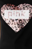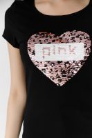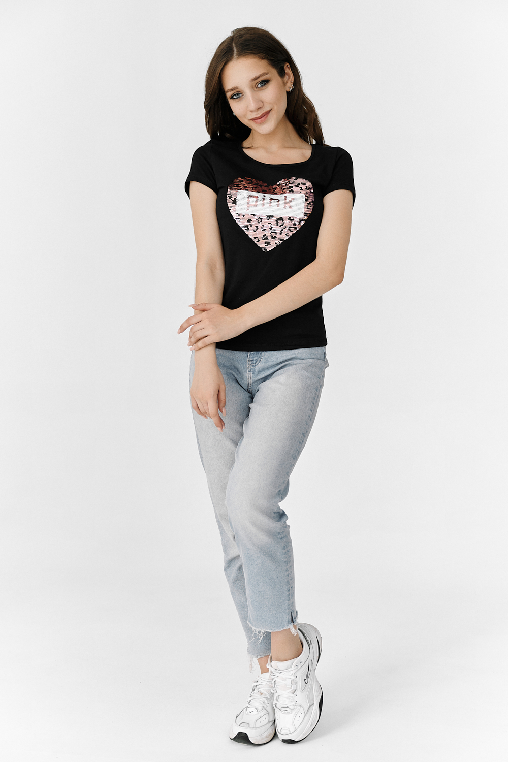Футболка полуприлегающего силуэта, с округлой горловиной, длиной до середины бедра. Рукав втачной короткий. Горловина обработана бейкой из основного полотна.