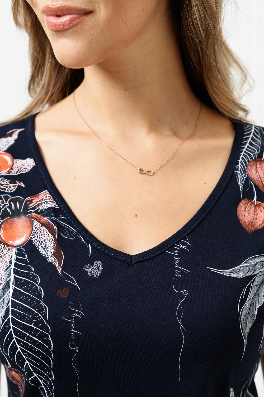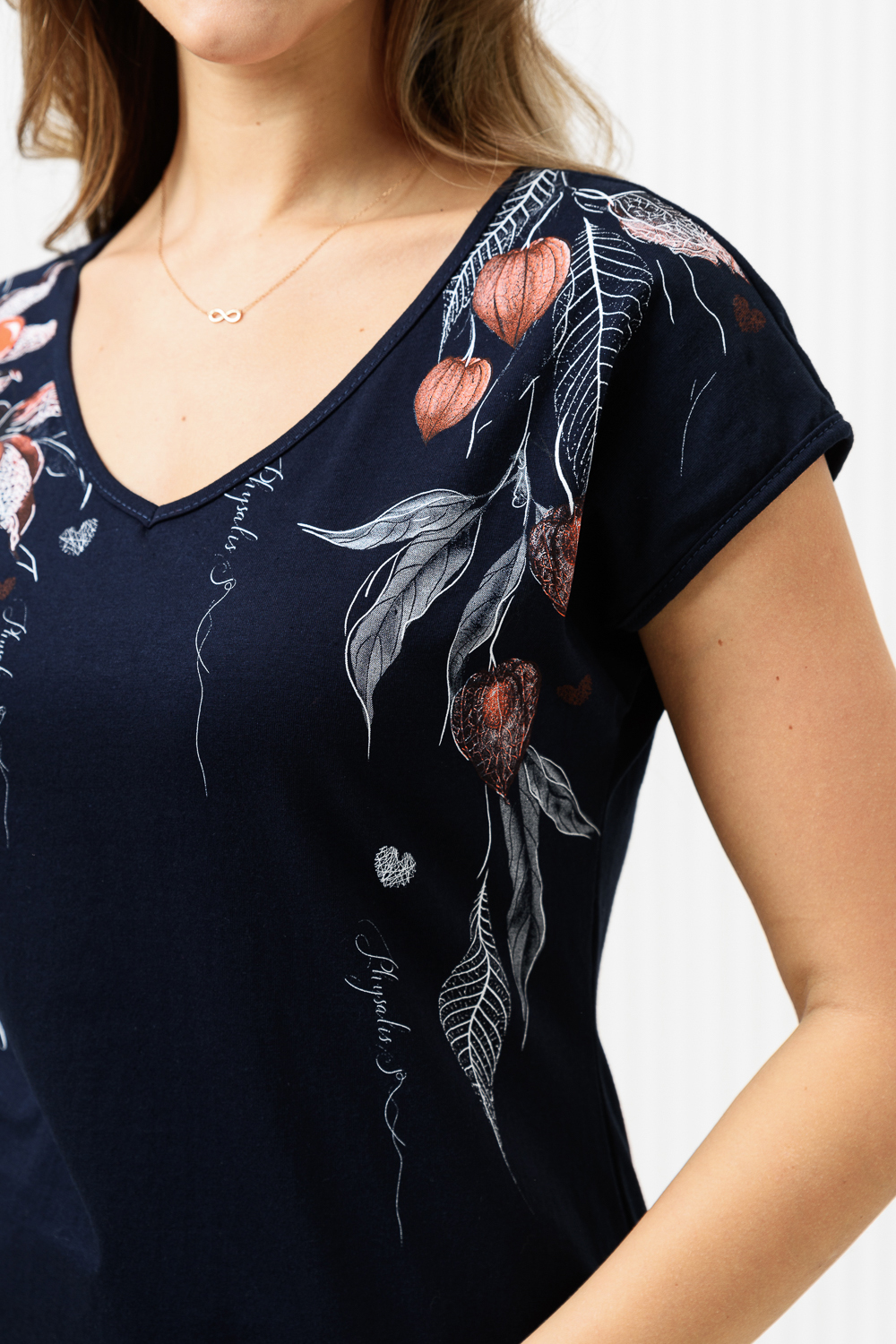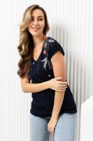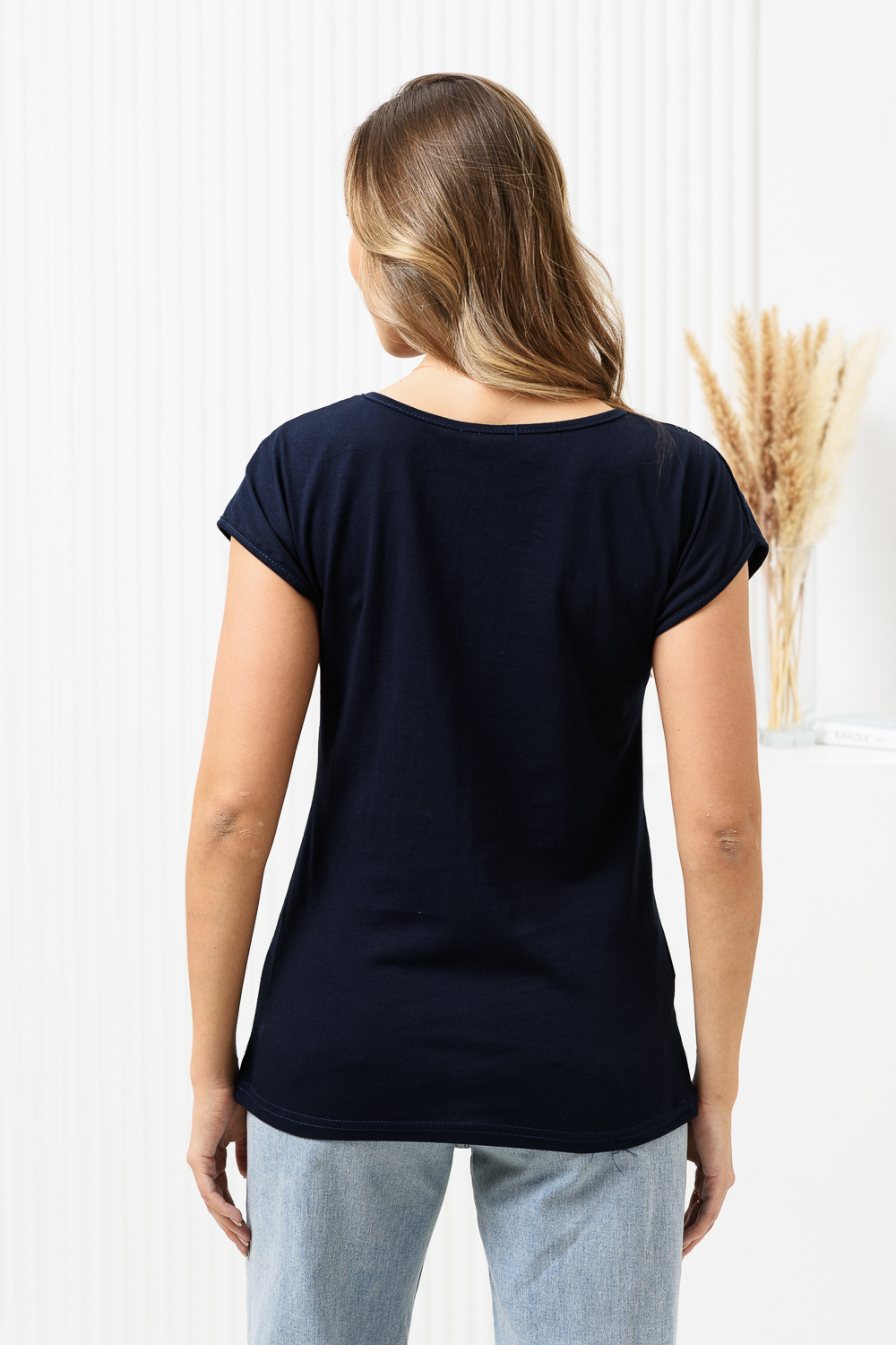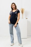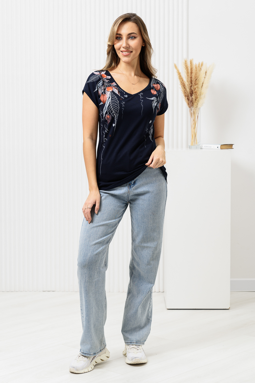 Футболка полуприлегающего силуэта, средней длины, с V-образной горловиной. Рукав цельнокроеный, короткий. Горловина и пройма обработаны бейкой из основного полотна.