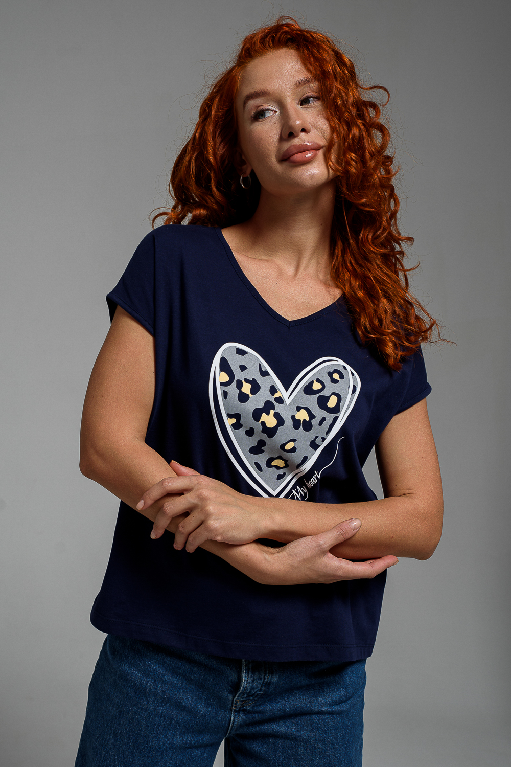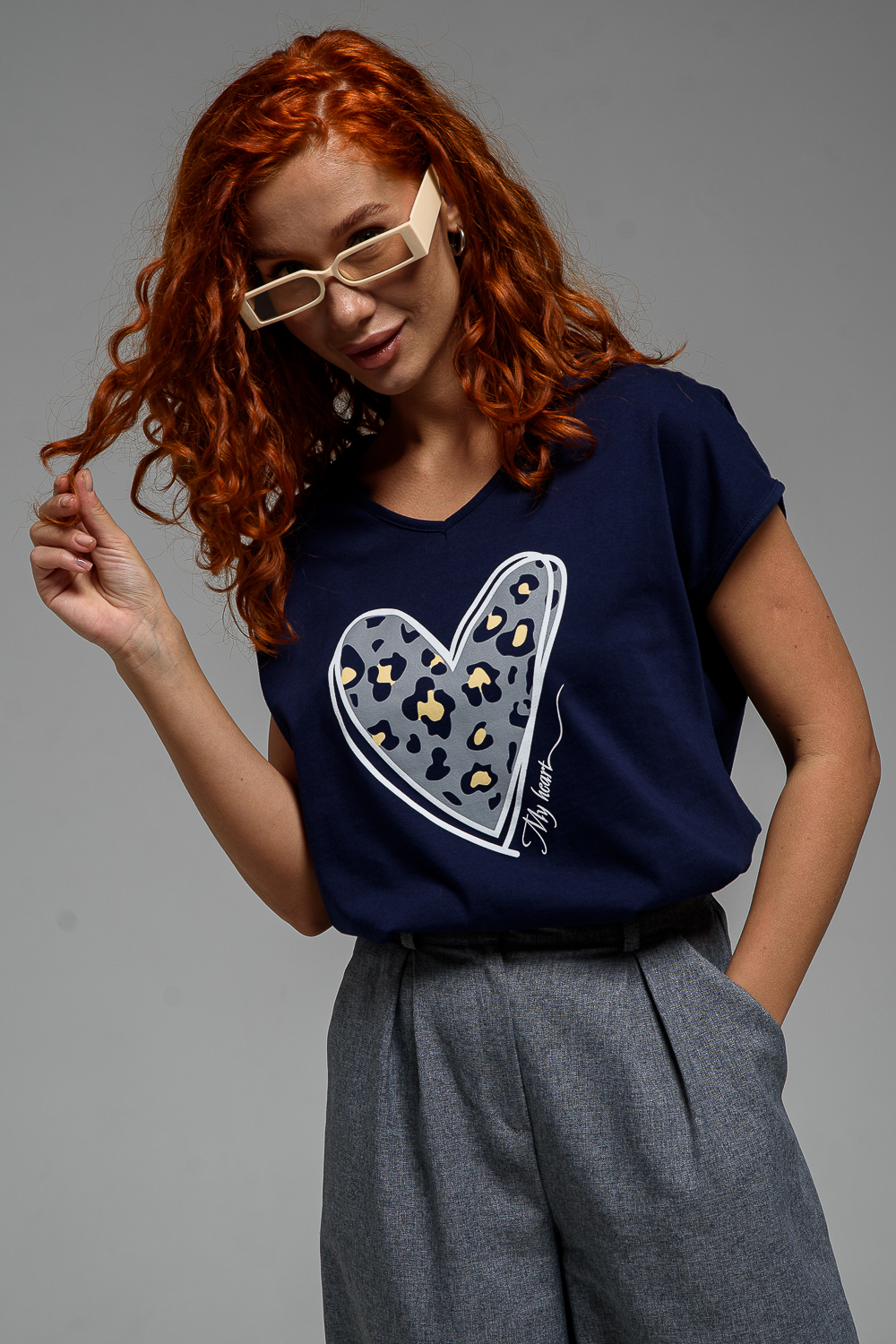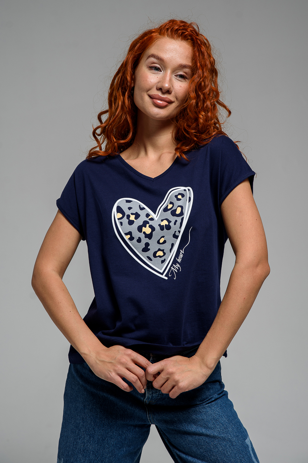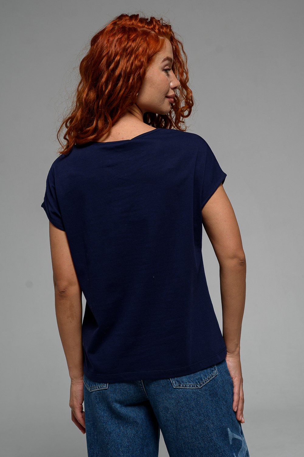 Футболка полуприлегающего силуэта, средней длины, с V-образной горловиной. Рукав цельнокроеный, короткий. Горловина и пройма обработаны бейкой из основного полотна.