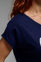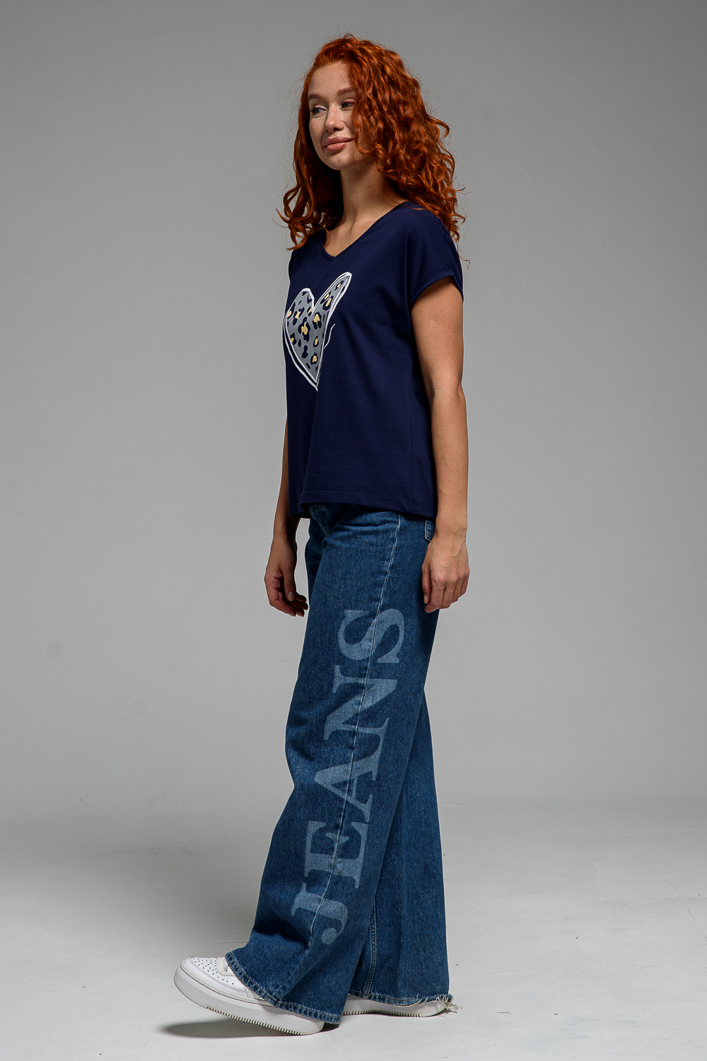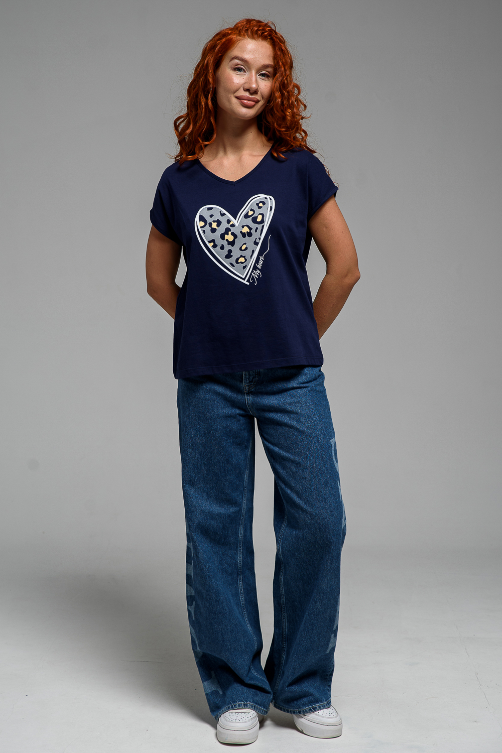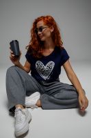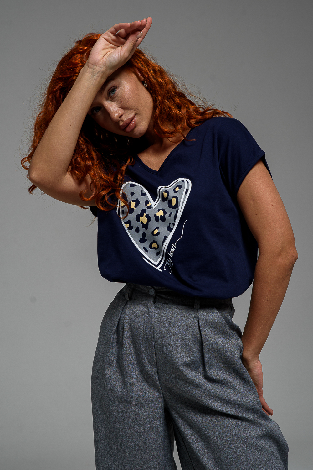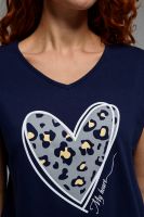 Футболка полуприлегающего силуэта, средней длины, с V-образной горловиной. Рукав цельнокроеный, короткий. Горловина и пройма обработаны бейкой из основного полотна.