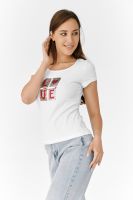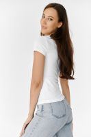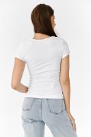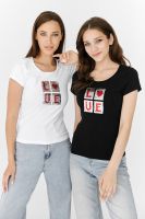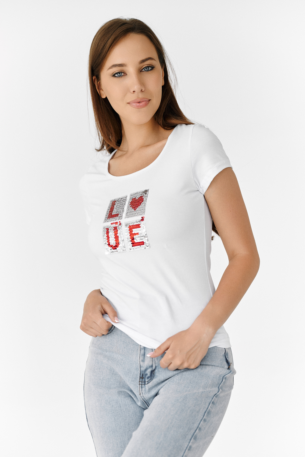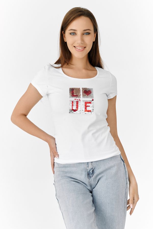 Футболка полуприлегающего силуэта, с округлой горловиной, длиной до середины бедра. Рукав втачной короткий. Горловина обработана бейкой из основного полотна. На полочке аппликация из пайеток