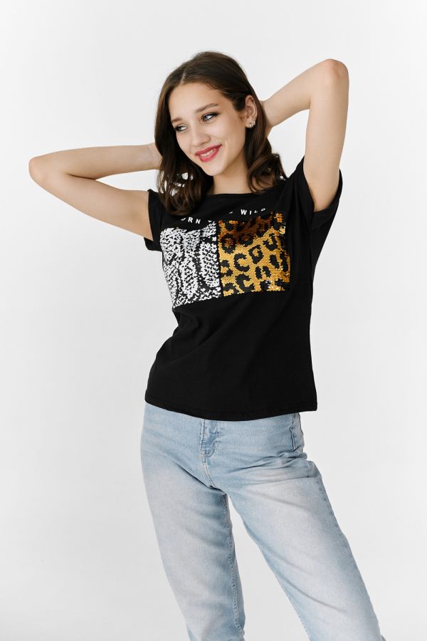 Футболка полуприлегающего силуэта, средней длины, с округлой горловиной. Рукав цельнокроеный, короткий, на манжете с отворотом.