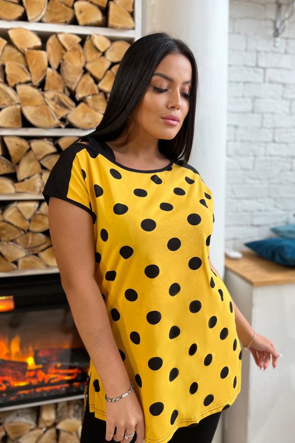 Футболка женская полуприлегающего силуэта, асимметричного кроя. Рукава цельнокроеные короткие. Спинка удлиненная. Одно плечо изделия фиксируется бретелью, в боковых швах разрезы.