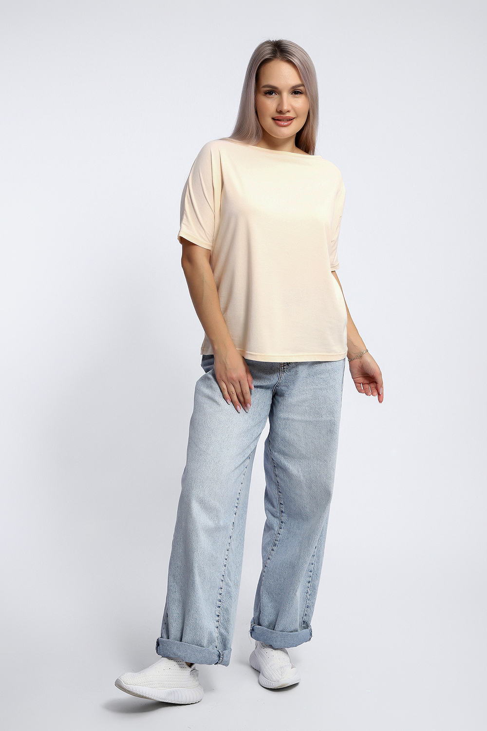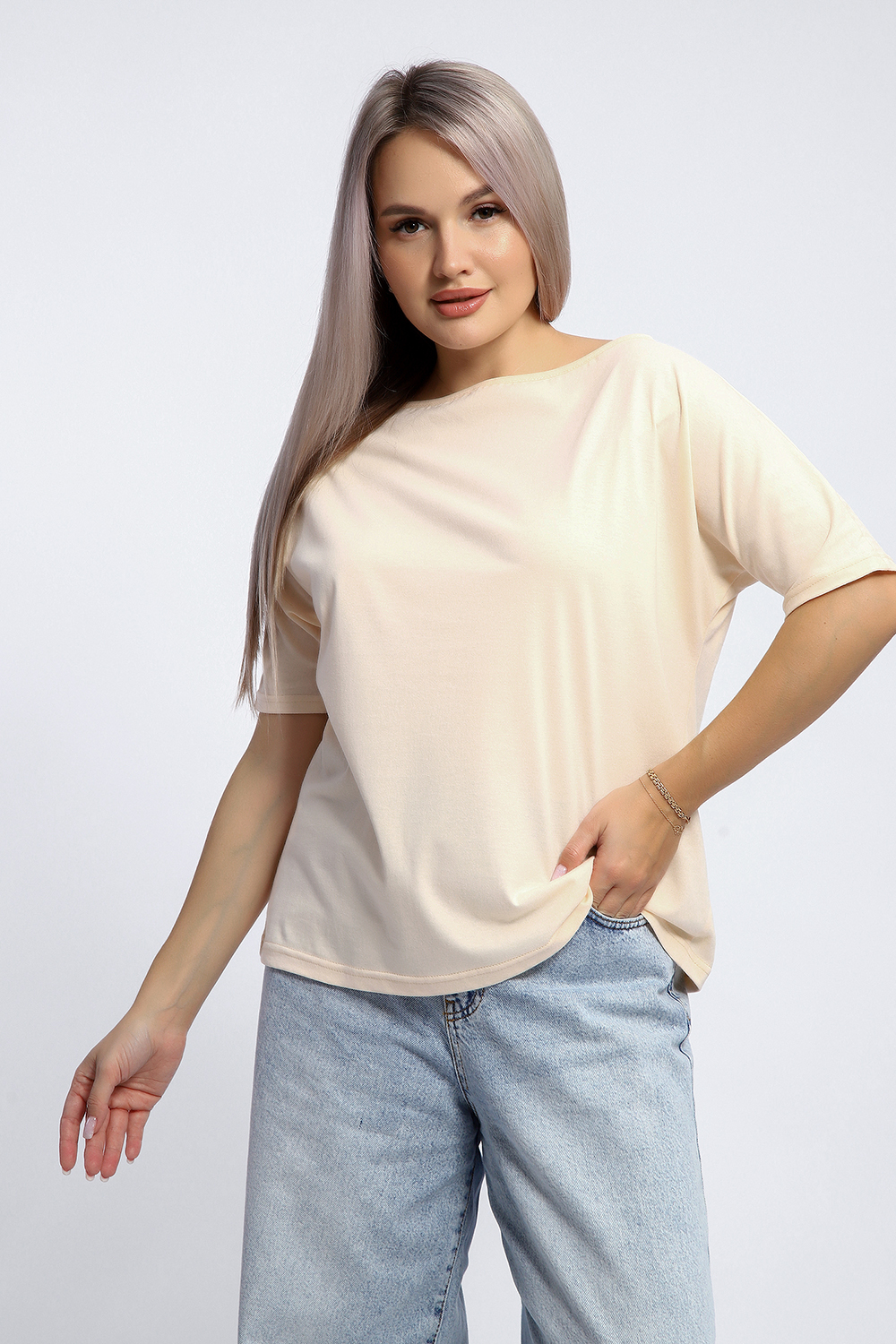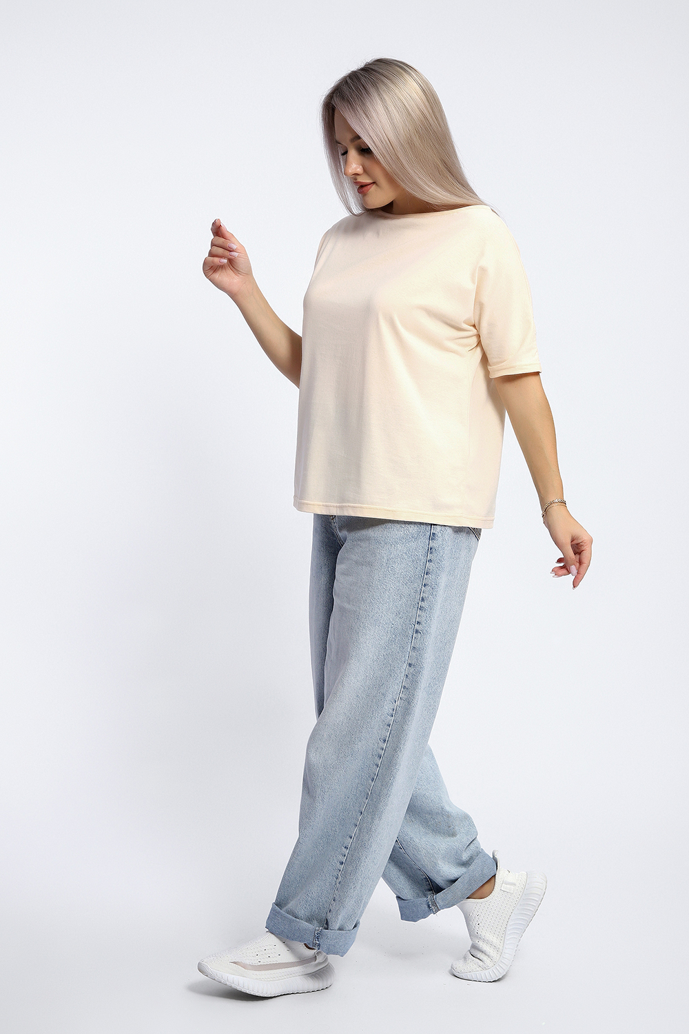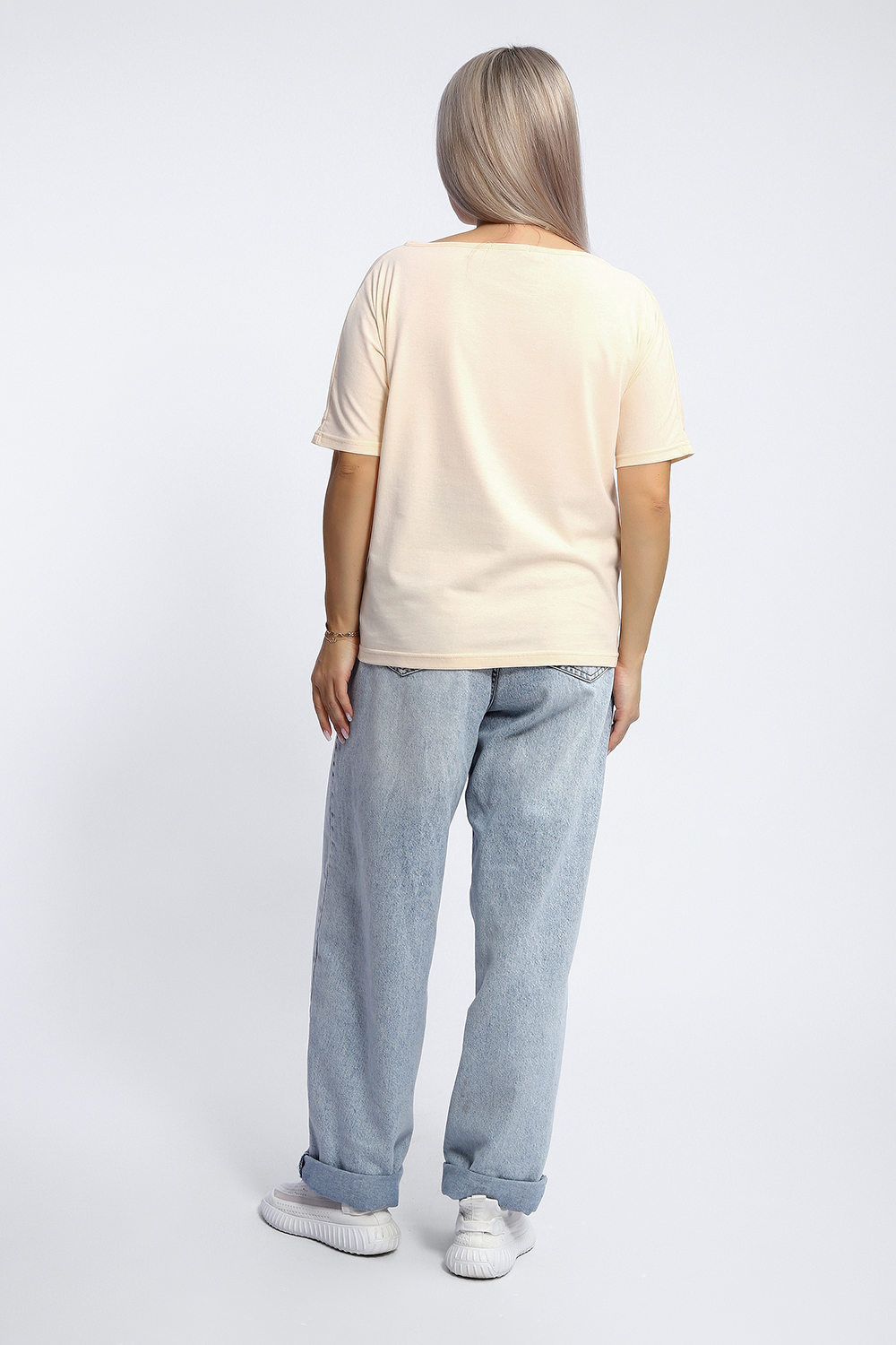 Футболка женская выполнена из мягкой хлопковой ткани. Модель со спущенной линией плеча, горловина обработана однотонным кантом. Цвет ткани нежно-персиковый, фото плохо передает.