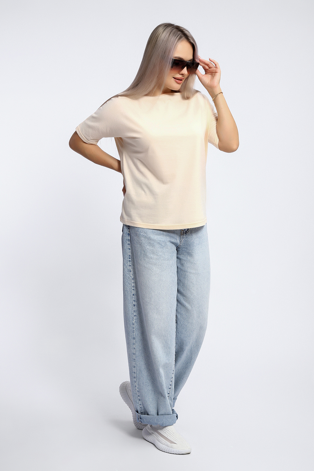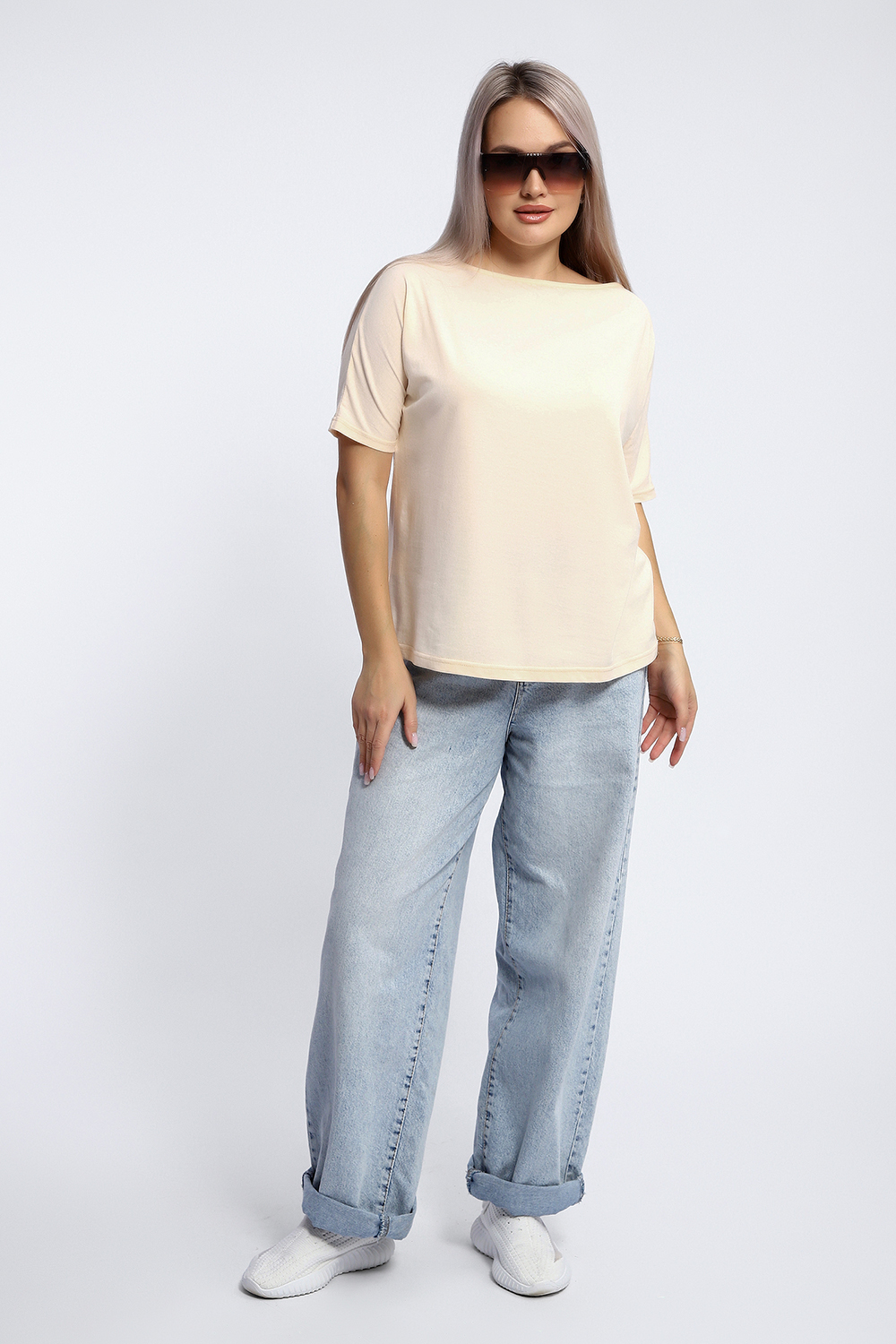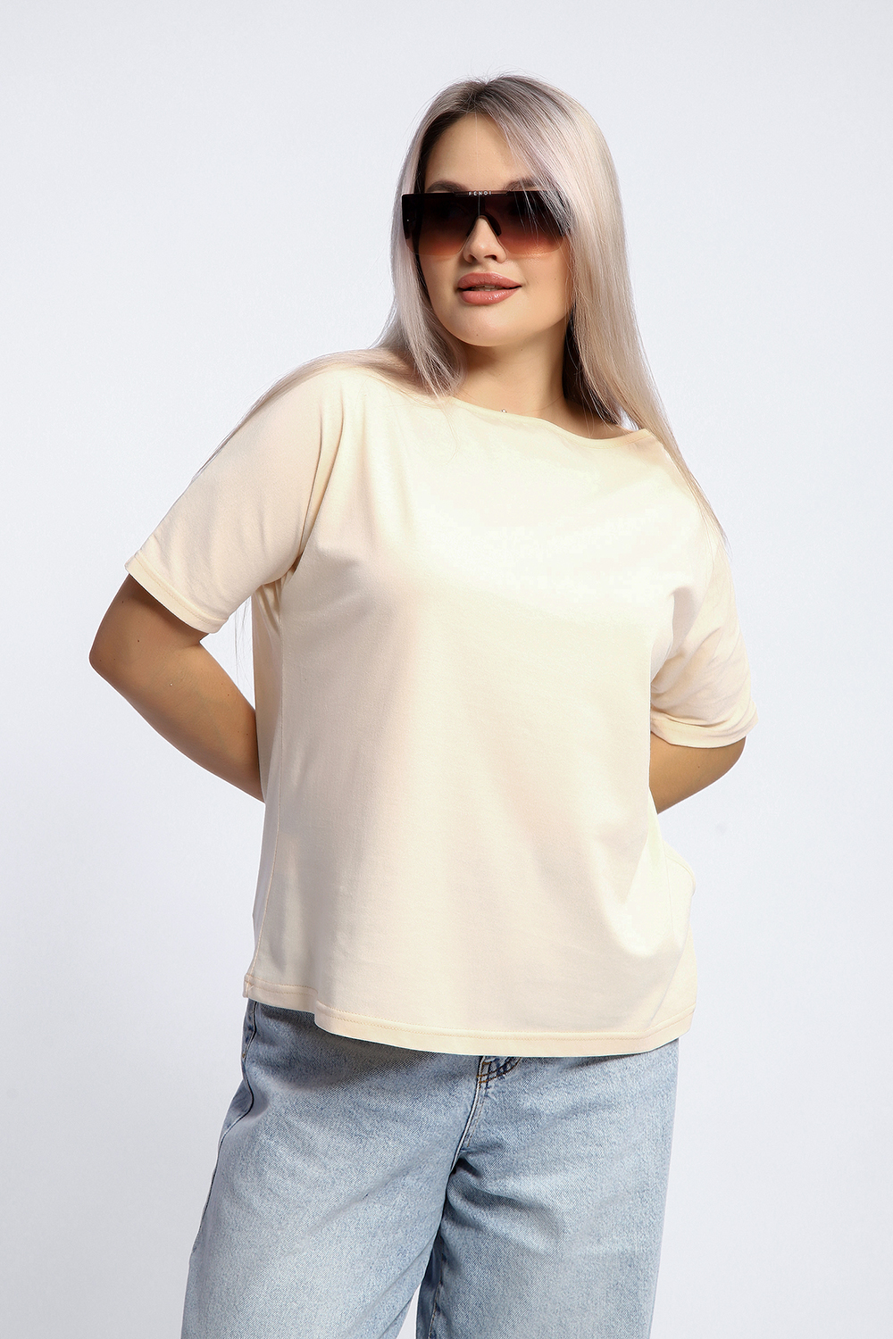 Футболка женская выполнена из мягкой хлопковой ткани. Модель со спущенной линией плеча, горловина обработана однотонным кантом. Цвет ткани нежно-персиковый, фото плохо передает.