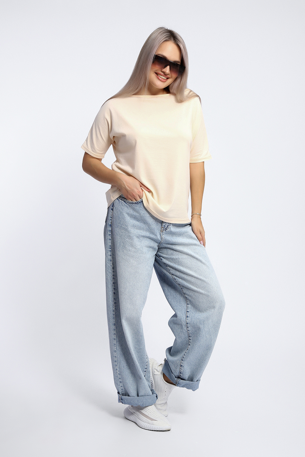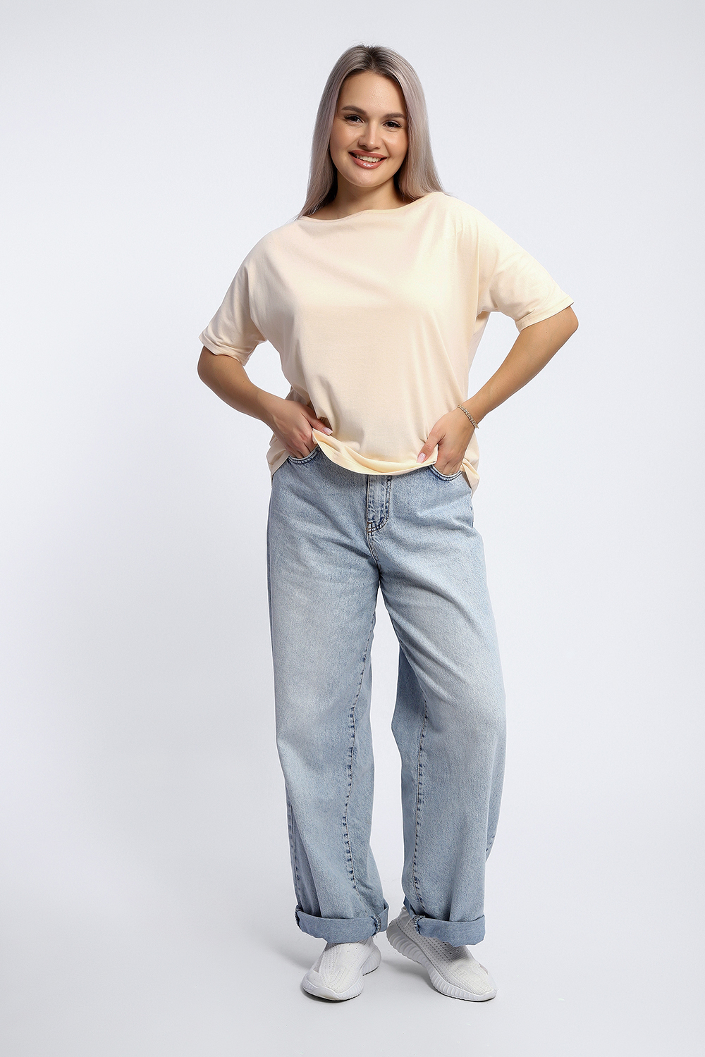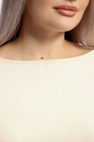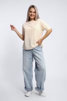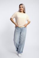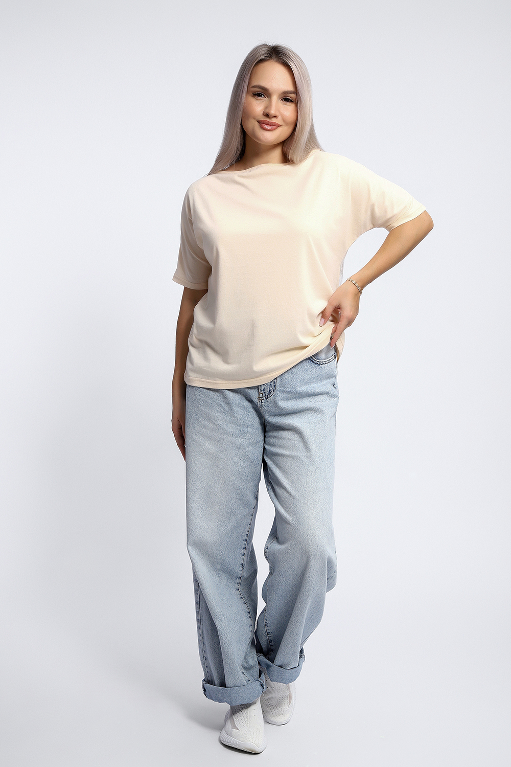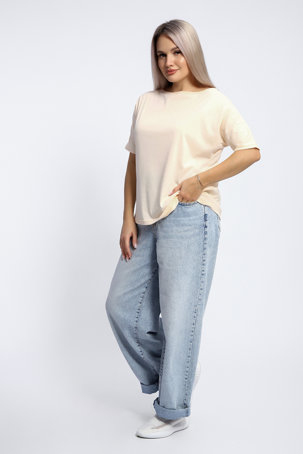 Футболка женская выполнена из мягкой хлопковой ткани. Модель со спущенной линией плеча, горловина обработана однотонным кантом. Цвет ткани нежно-персиковый, фото плохо передает.