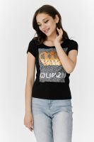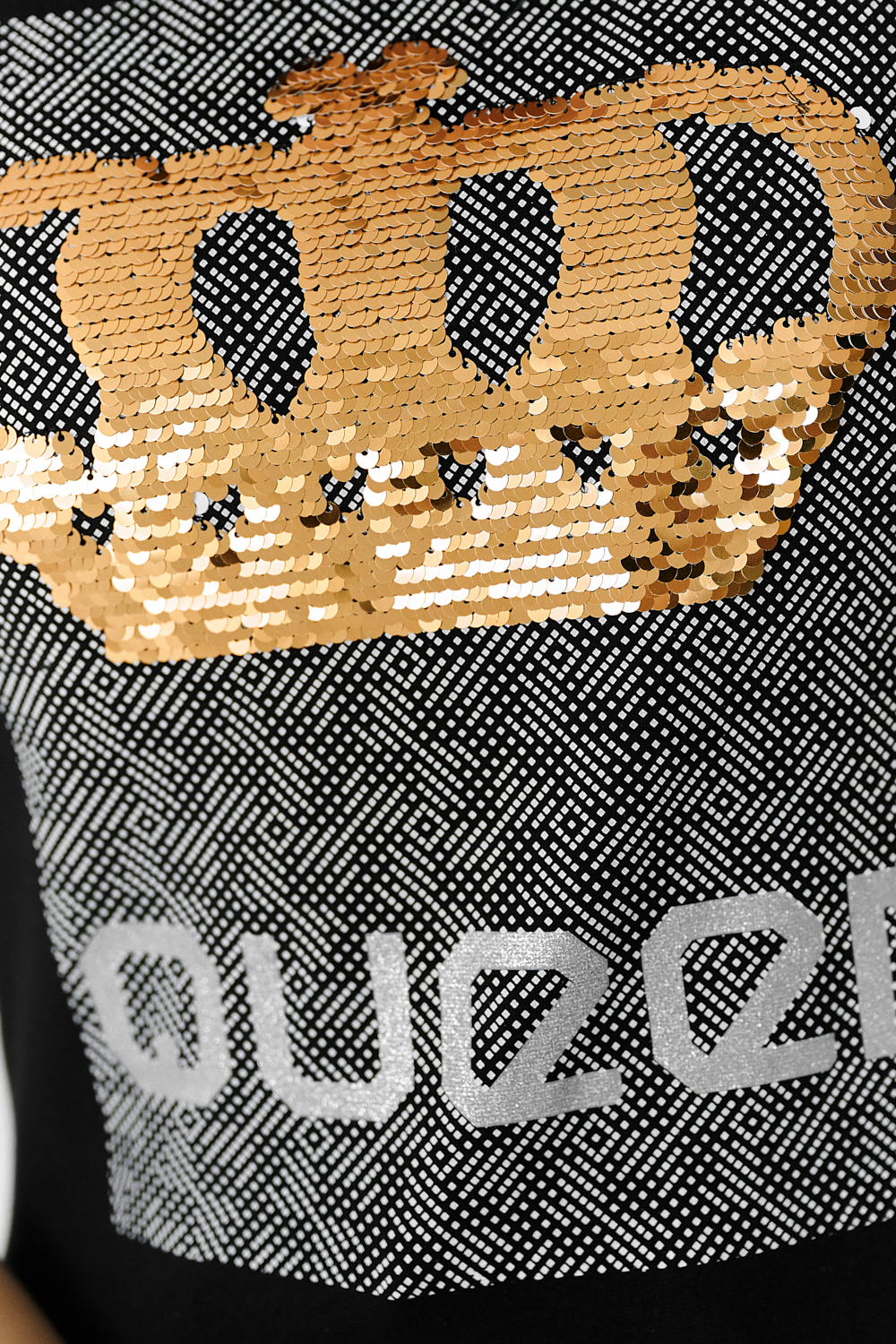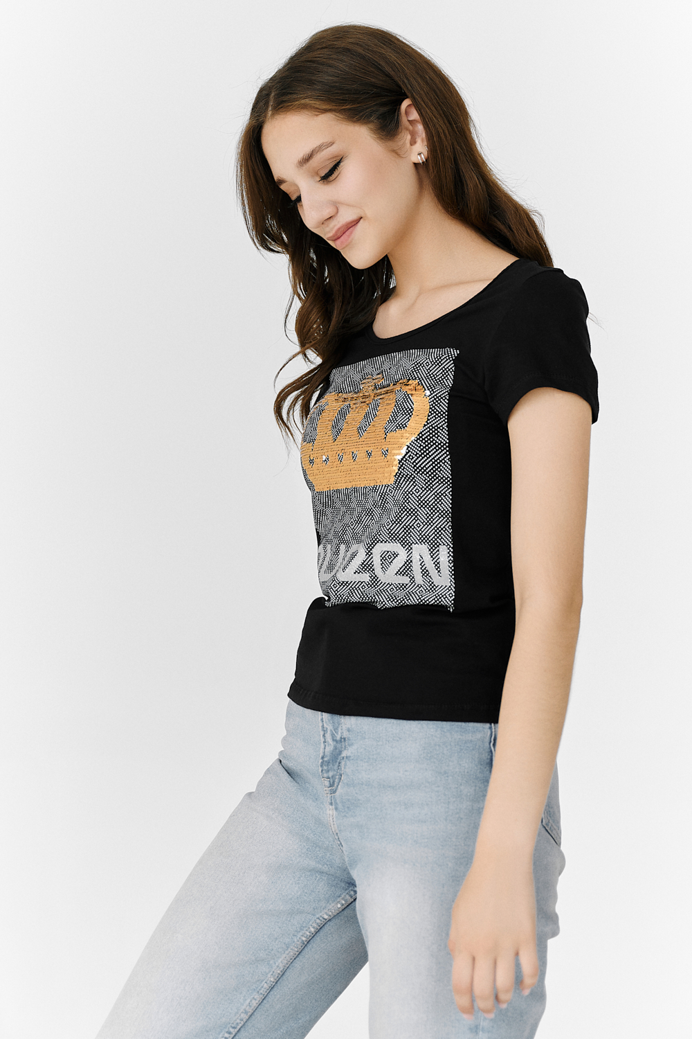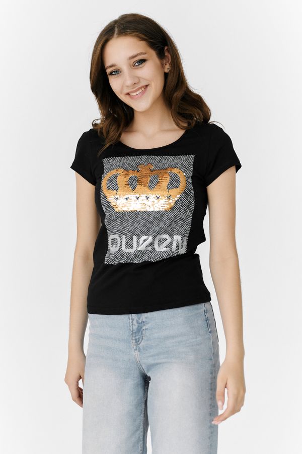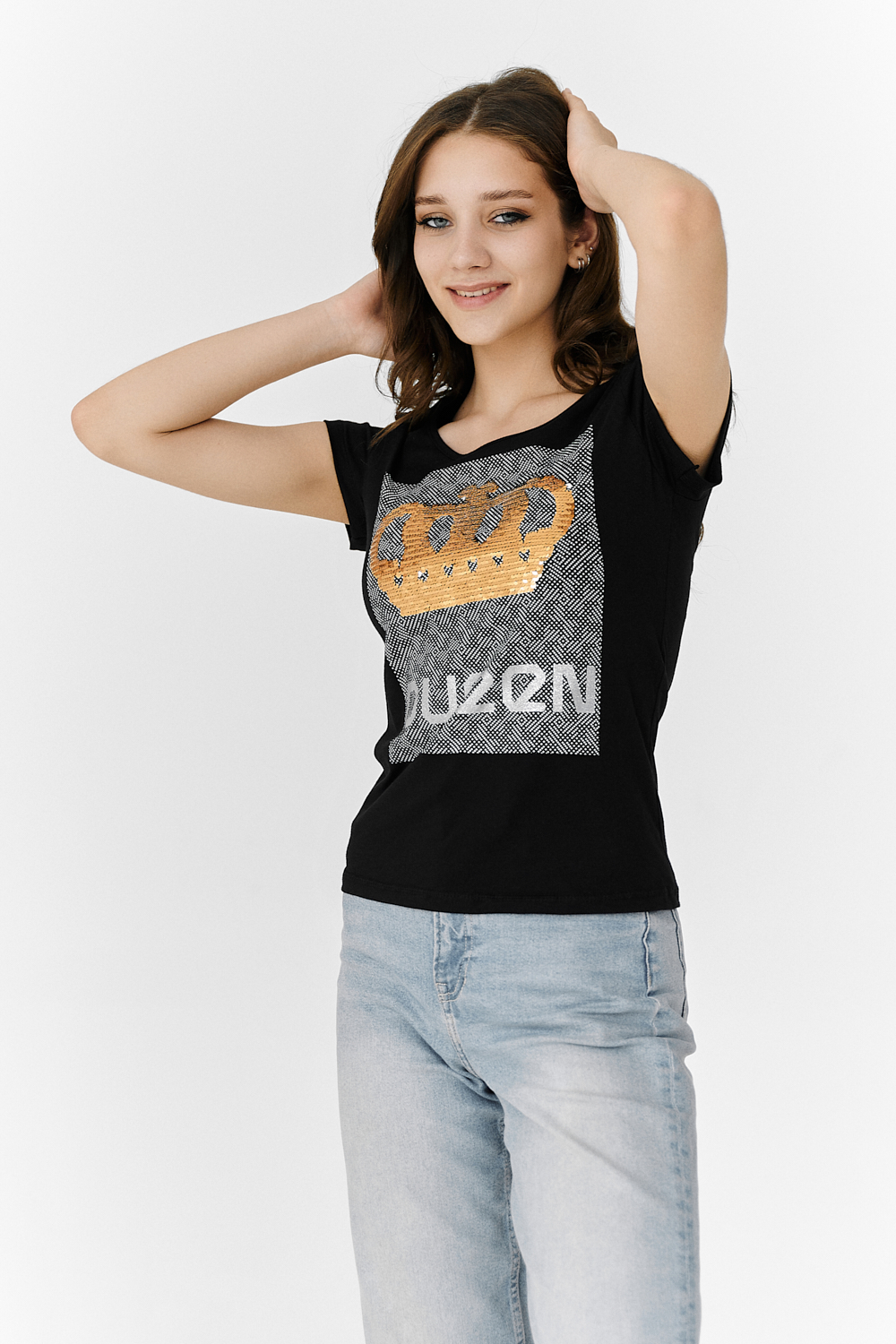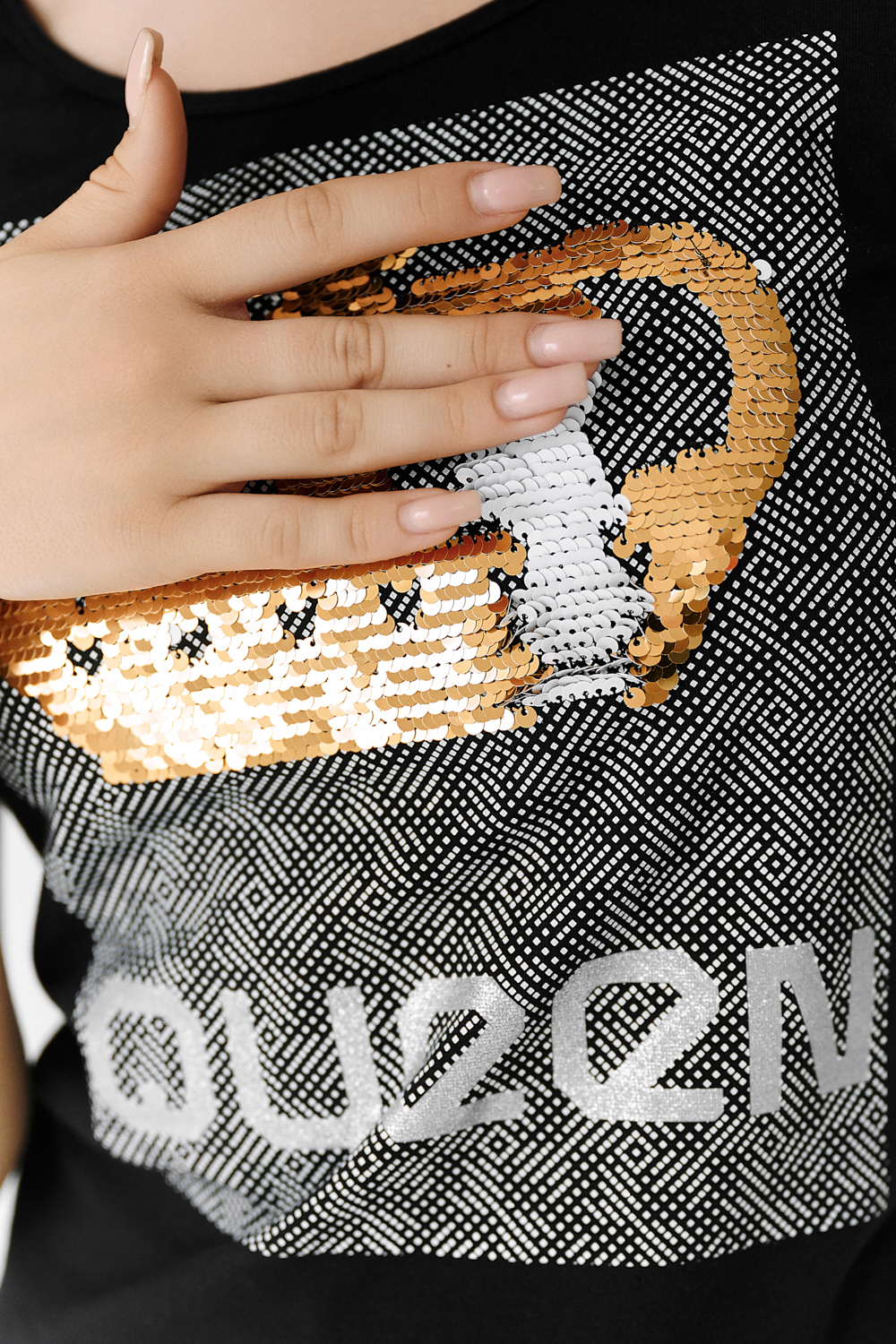 Футболка полуприлегающего силуэта, с округлой горловиной, длиной до середины бедра. Рукав втачной короткий. Горловина обработана бейкой из основного полотна. На полочке эффектная печать из пайеток