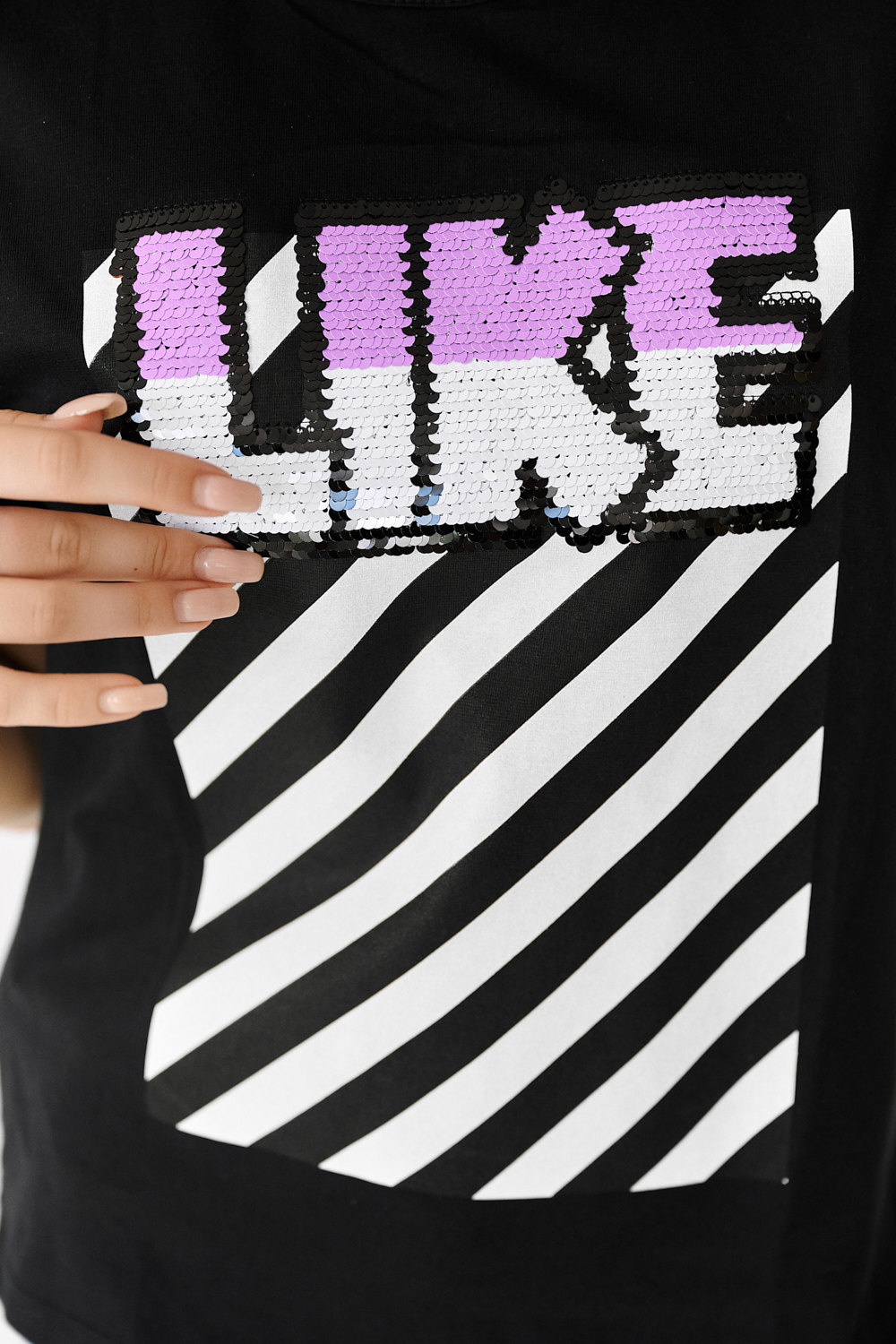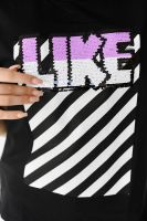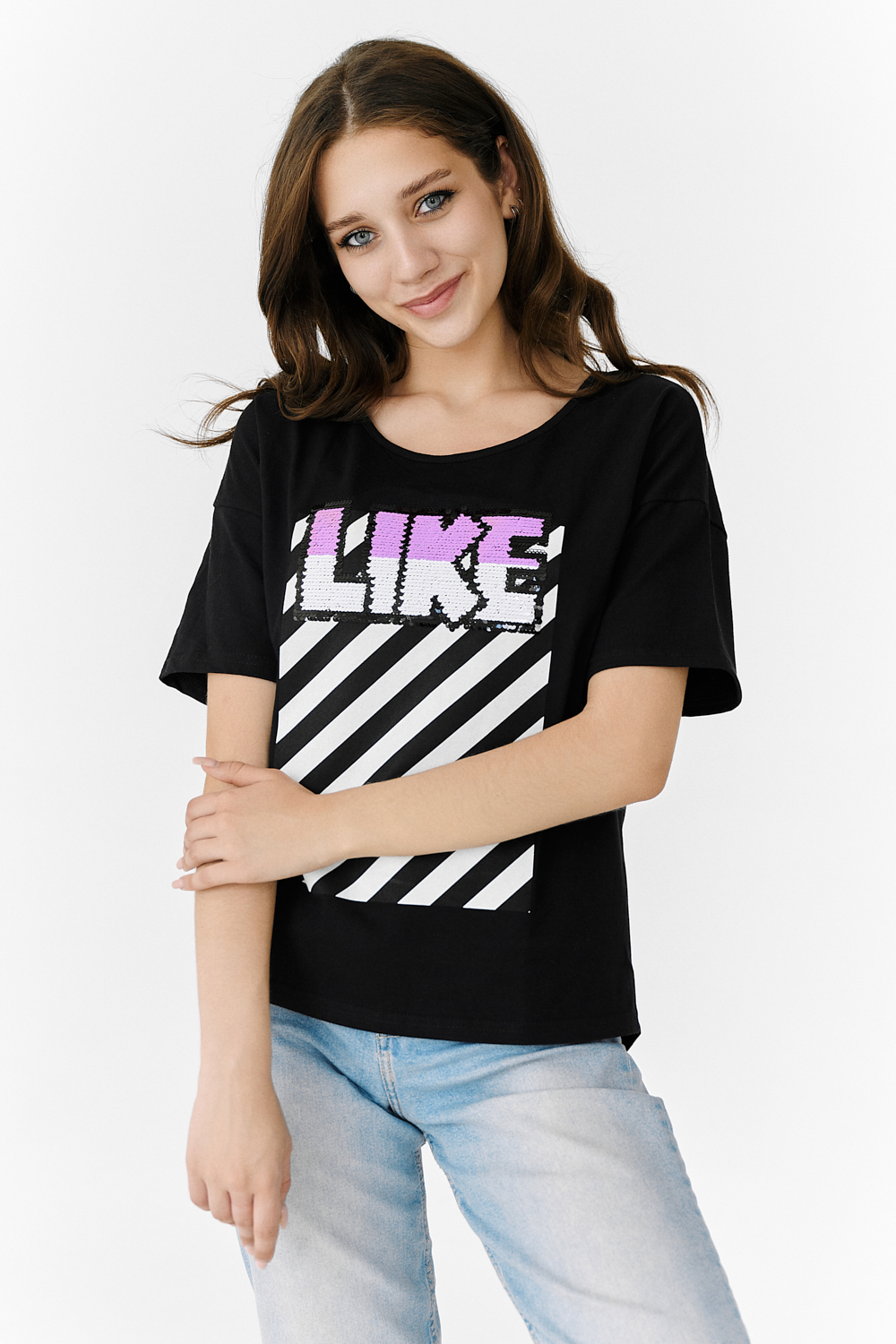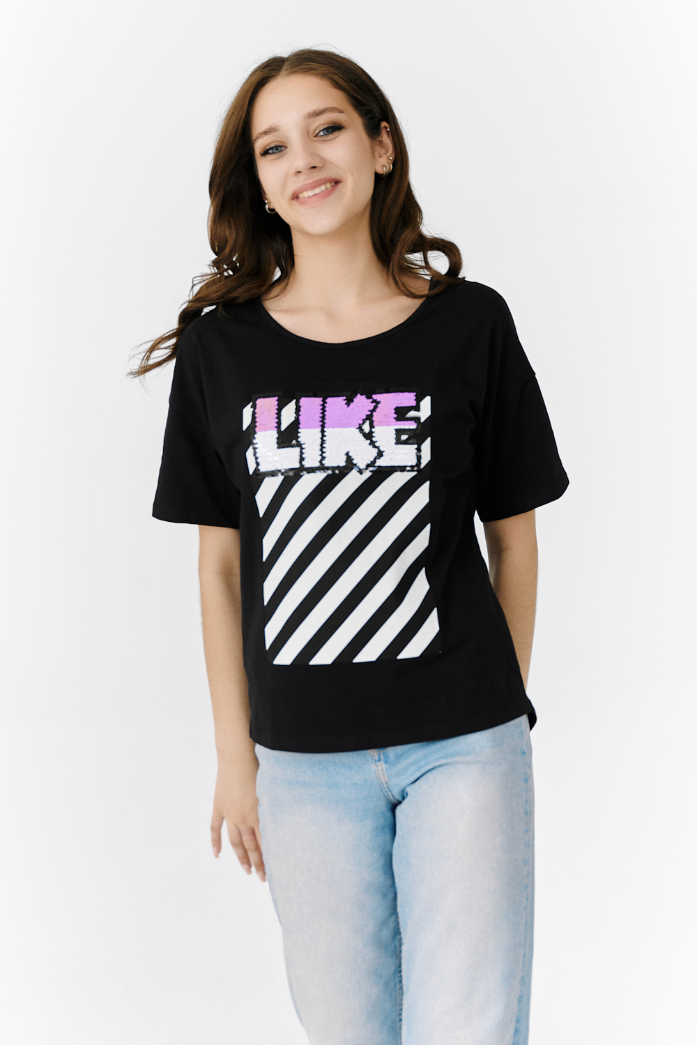 Футболка прямого силуэта, с округлой горловиной спереди и V-образной на спинке, с удлиненной спинкой. Рукав короткий. В верхней части спинки обработан фигурный вырез со шнуром. Горловина обработана бейкой из основного полотна. На полочке эффектная печать с пайетками