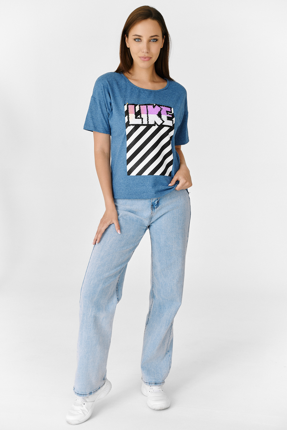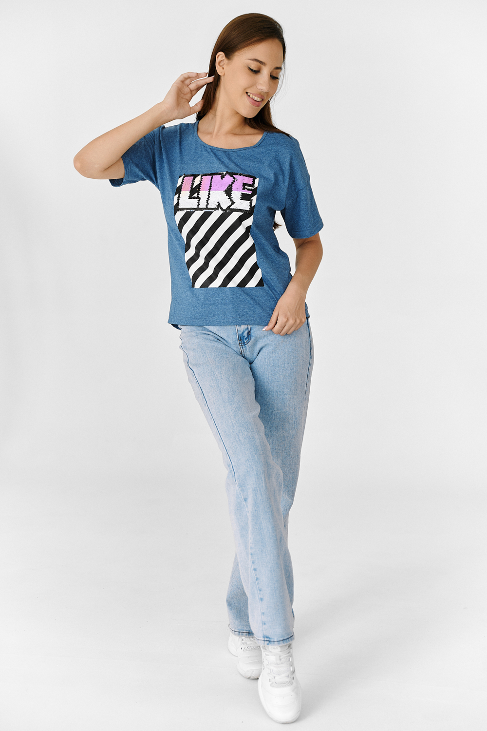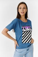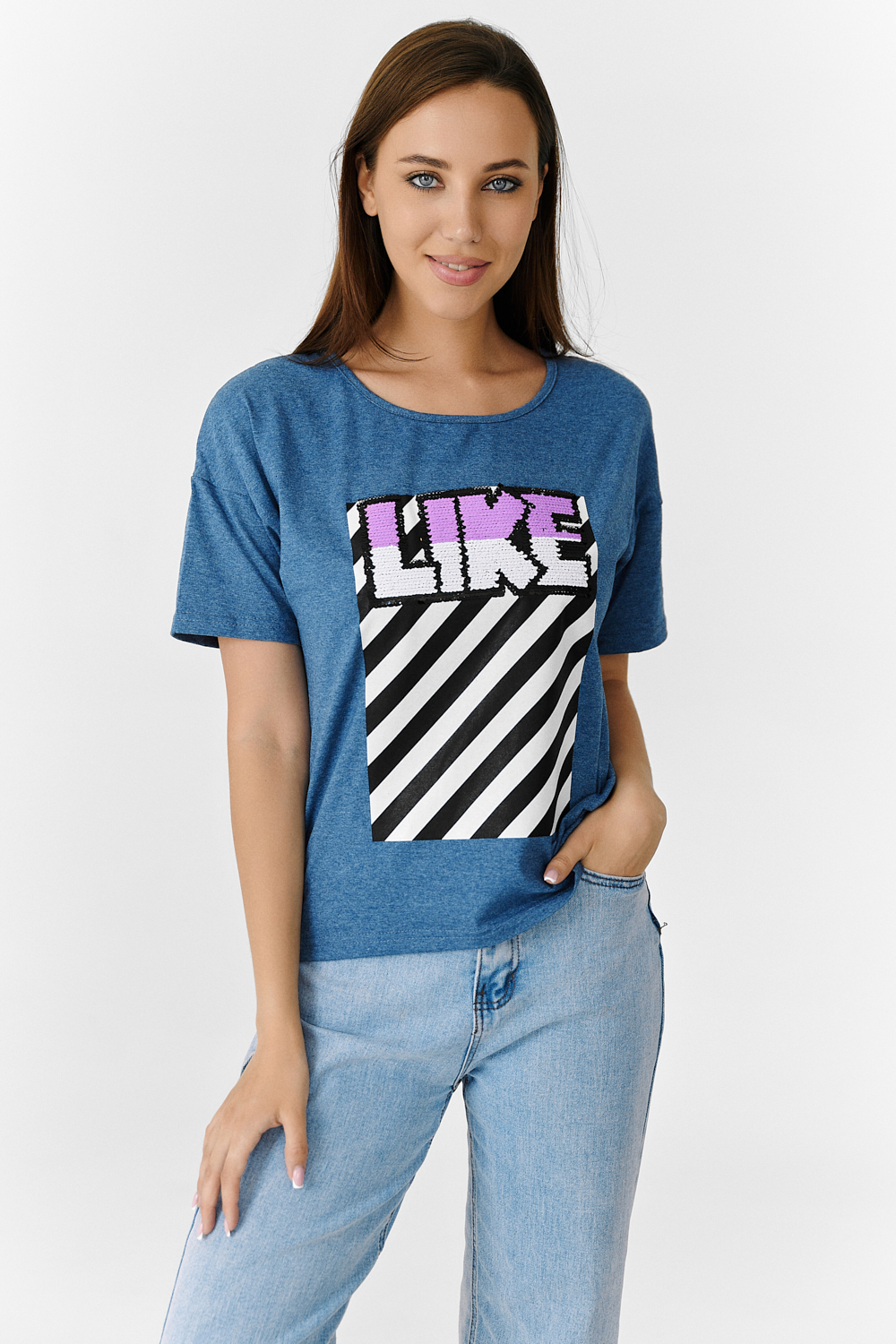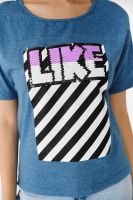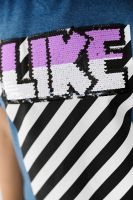 Футболка прямого силуэта, с округлой горловиной спереди и V-образной на спинке, с удлиненной спинкой. Рукав короткий. В верхней части спинки обработан фигурный вырез со шнуром. Горловина обработана бейкой из основного полотна. На полочке эффектная печать с пайетками