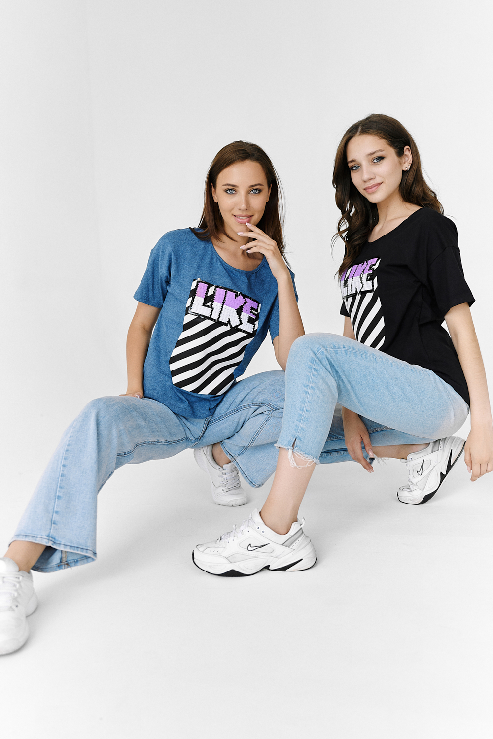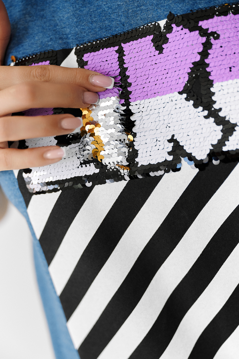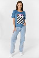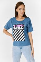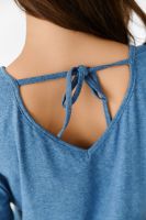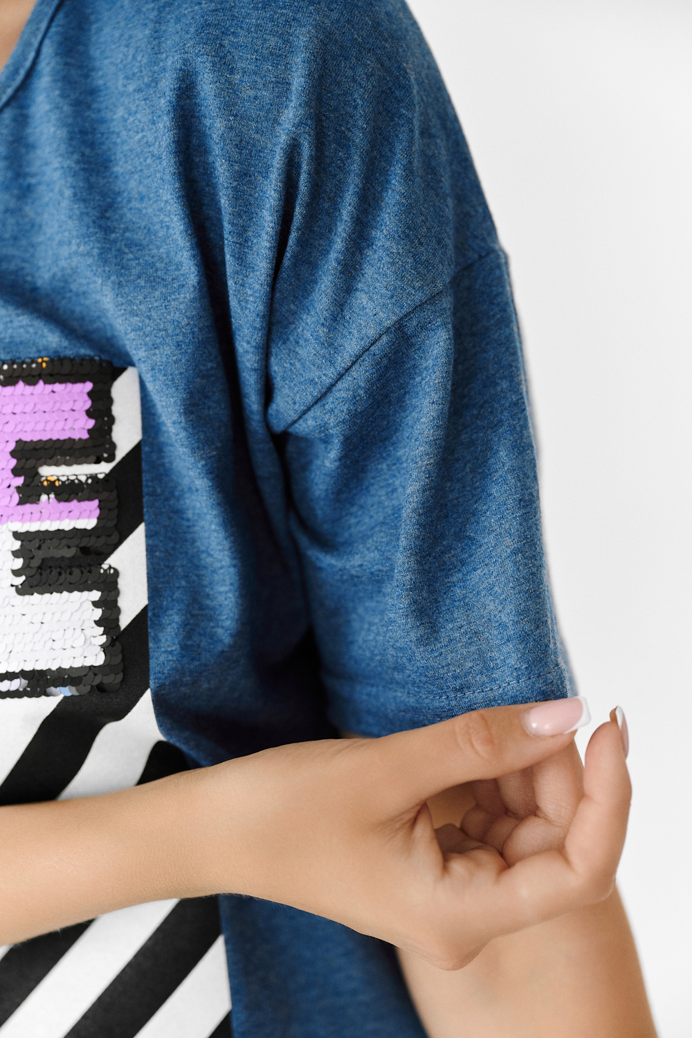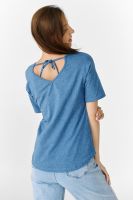 Футболка прямого силуэта, с округлой горловиной спереди и V-образной на спинке, с удлиненной спинкой. Рукав короткий. В верхней части спинки обработан фигурный вырез со шнуром. Горловина обработана бейкой из основного полотна. На полочке эффектная печать с пайетками