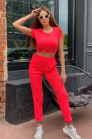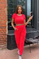 Футболка облегающая, с округлой горловиной, длиной выше талии. Рукав втачной, короткий. Горловина обработана бейкой из основного полотна.