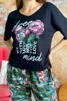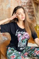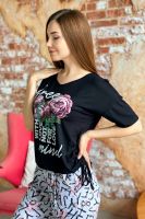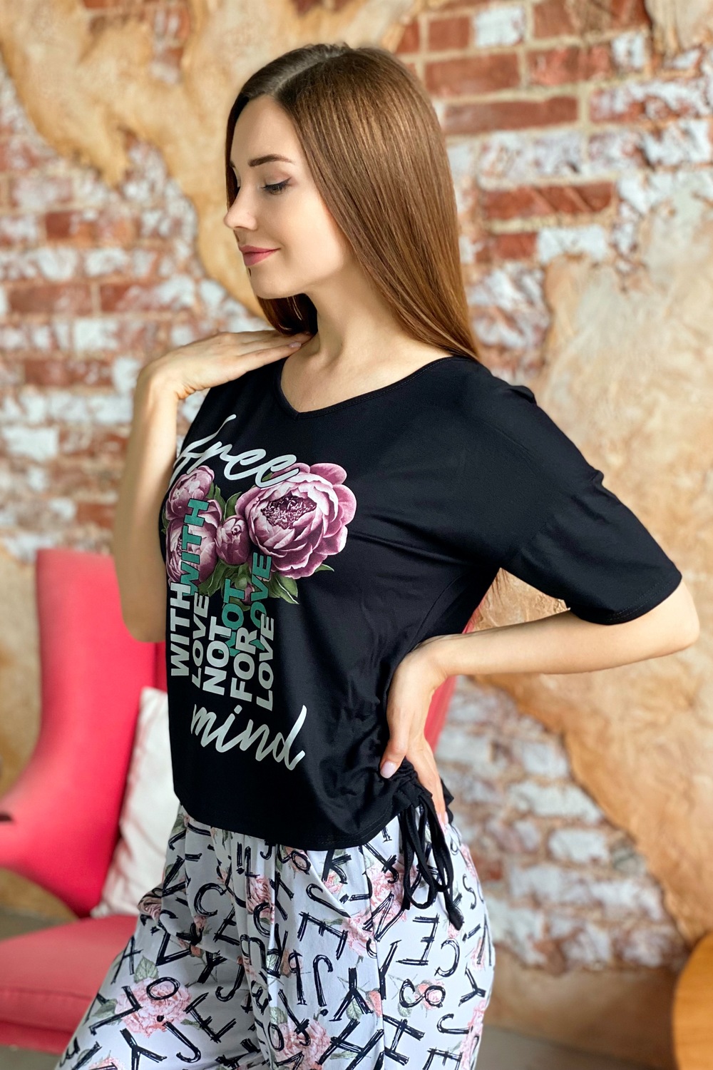 Футболка прямого силуэта, с V-образной горловиной. Рукав короткий. В нижней части боковых швов обработаны утяжки со шнурами. Горловина обработана бейкой из основного полотна