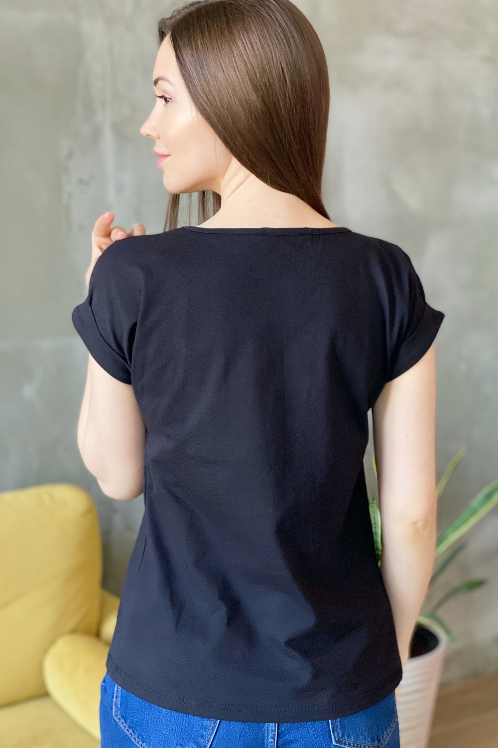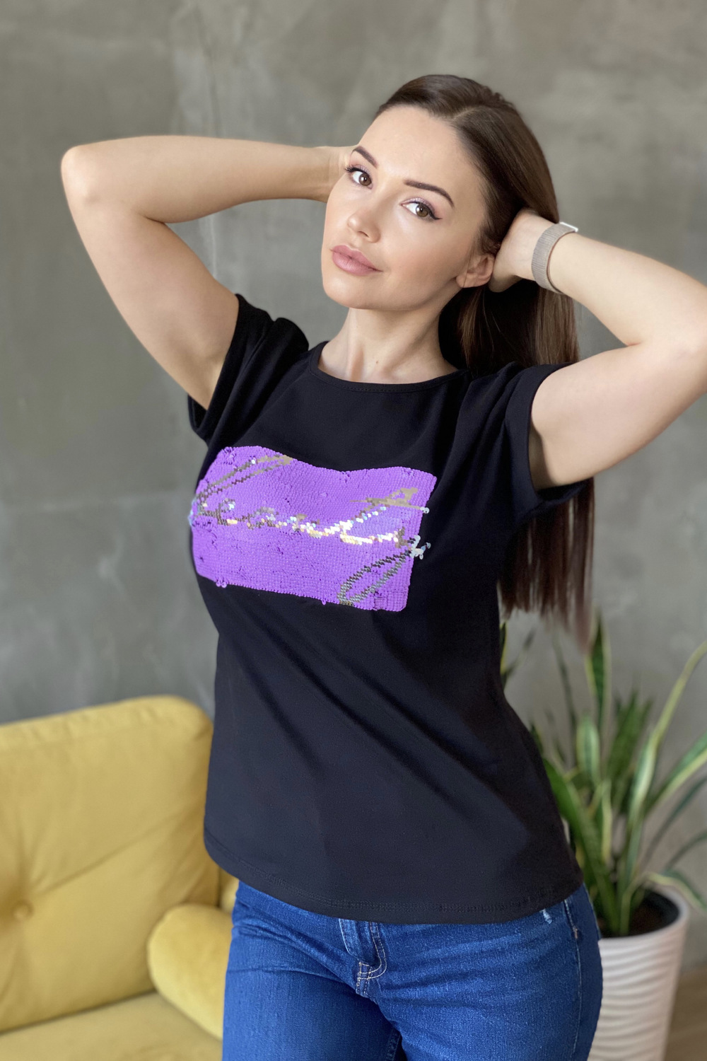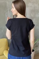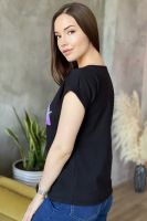 Футболка полуприлегающего силуэта, средней длины, с округлой горловиной. Рукав цельнокроеный, короткий, на манжете с отворотом. На полочке блестящая аппликация из пайеток