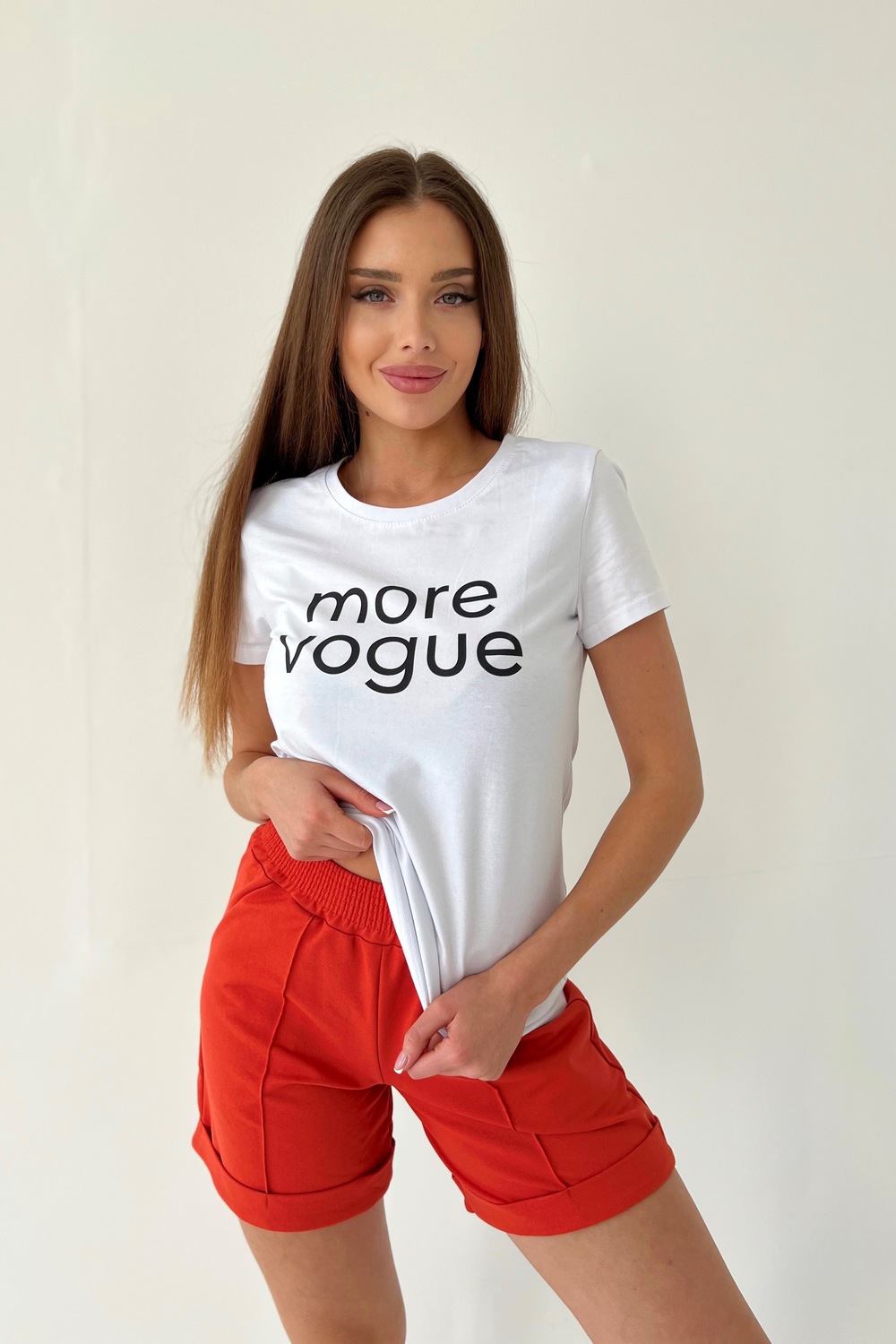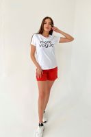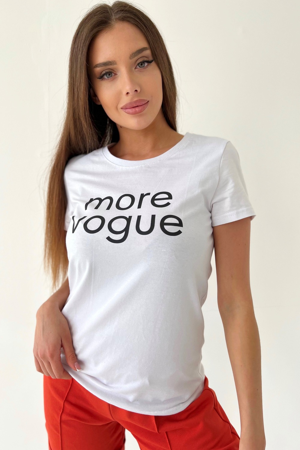 Футболка прямого силуэта, с округлой горловиной, длиной до середины бедра. Рукав втачной, короткий. Горловина обработана обтачкой из основного полотна.