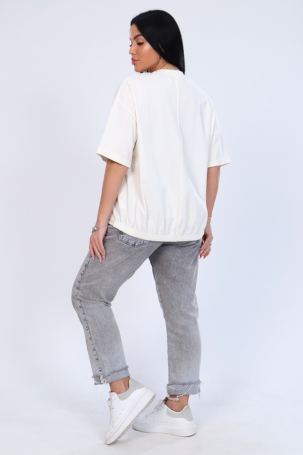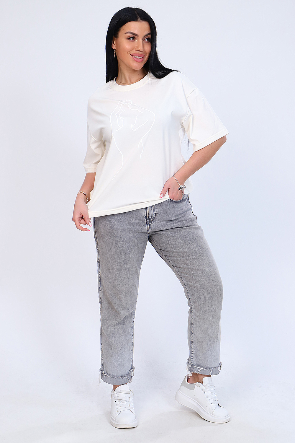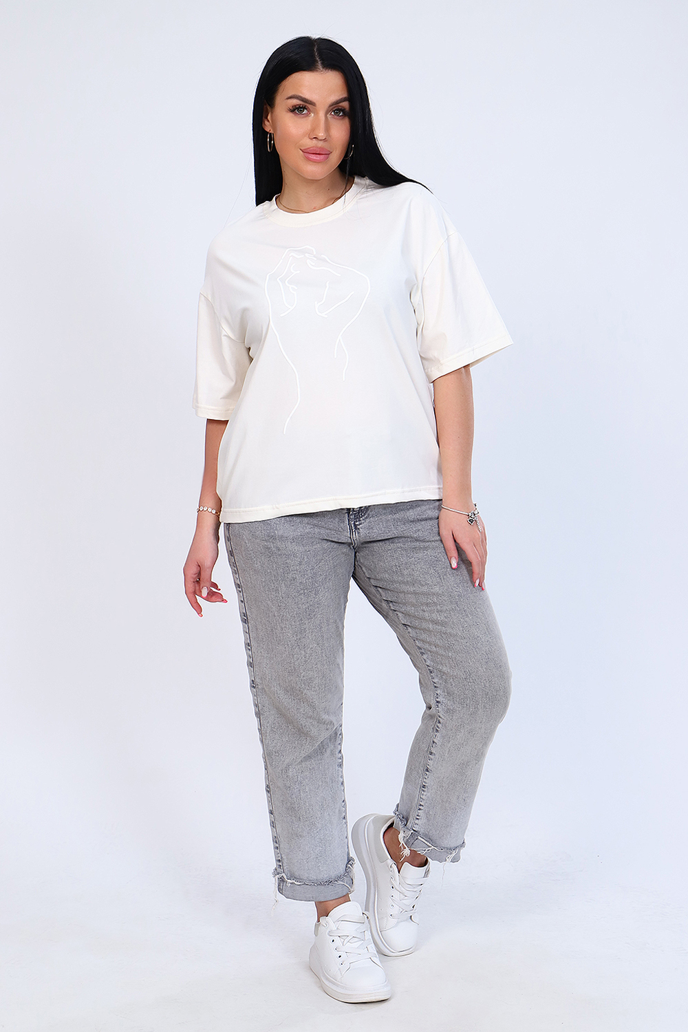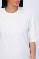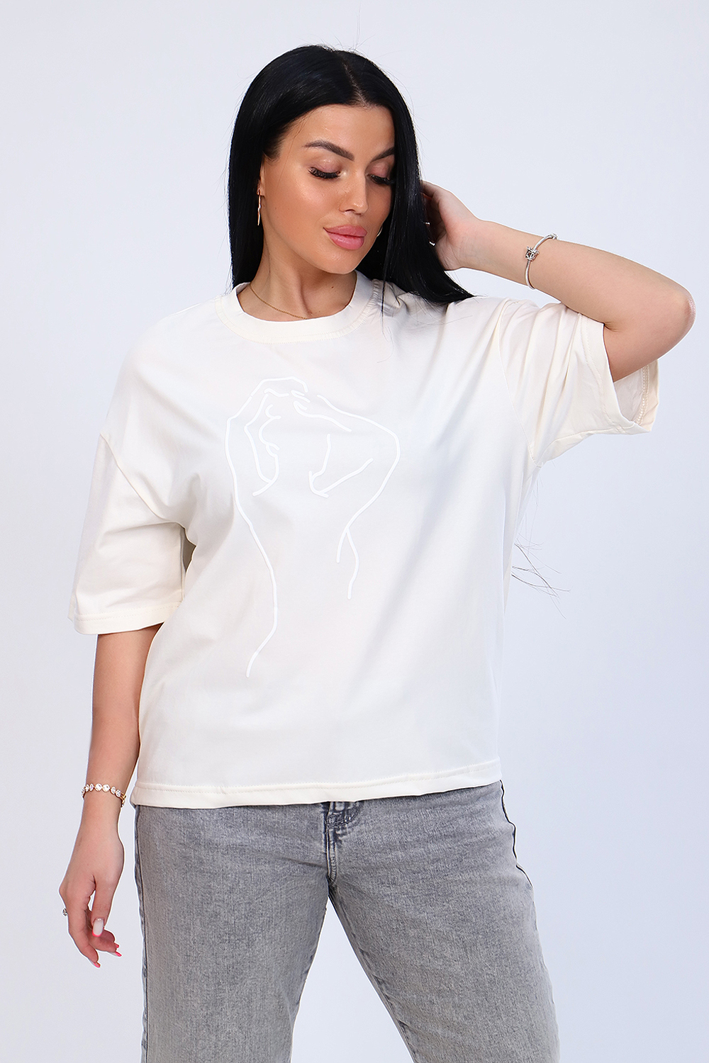 Футболка с нежным принтом из мягкого трикотажа с лайкрой высокого качества пенье. Модель свободного силуэта, круглая горловина обработана обтачкой, короткий широкий рукав, низ спинки слегка удлинён и собран на широкой резинке. Удобная и во многом универсальная вещь не только идеально дополняет комплекты одежды повседневного стиля, но и отлично комбинируется со строгими, классическими нарядами. Модель отлично смотрится на любом типе фигуры. Умеренный оверсайз - очень модно и практично, сочетается с джинсами, юбкой, в офис под кардиган или пиджак. Длина рукава в таблице измерений указана от плечевого шва.