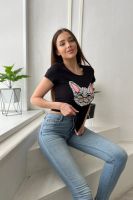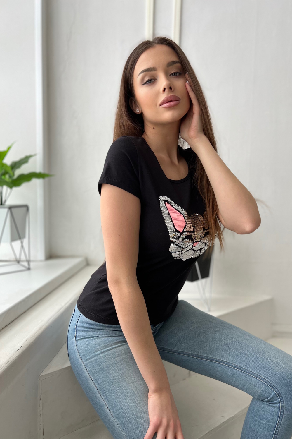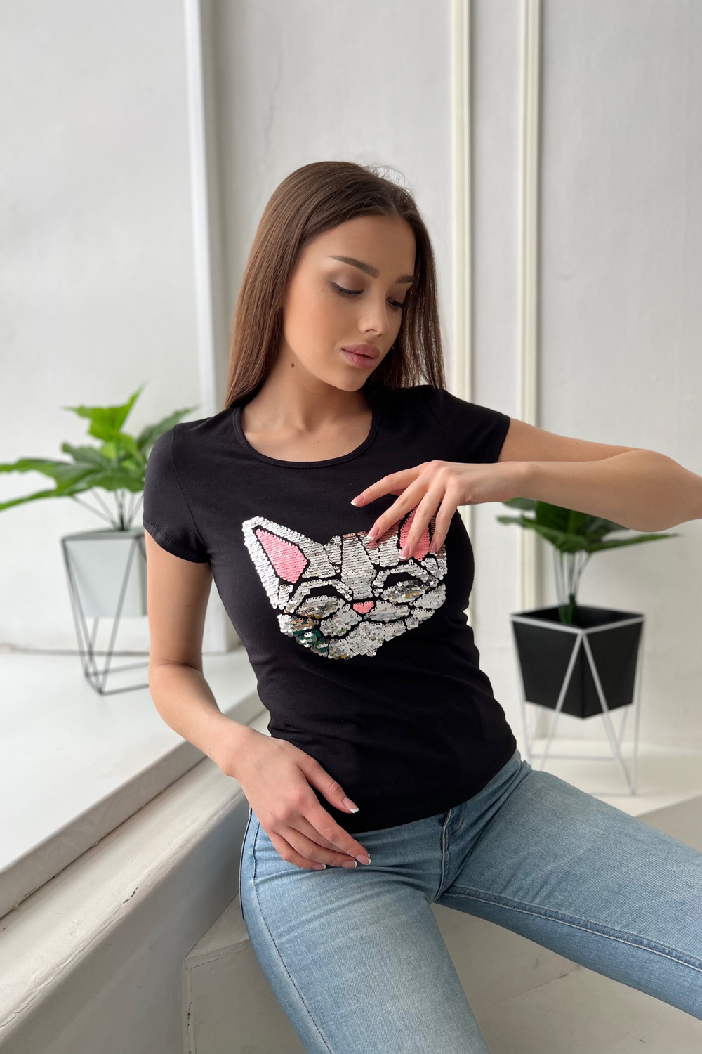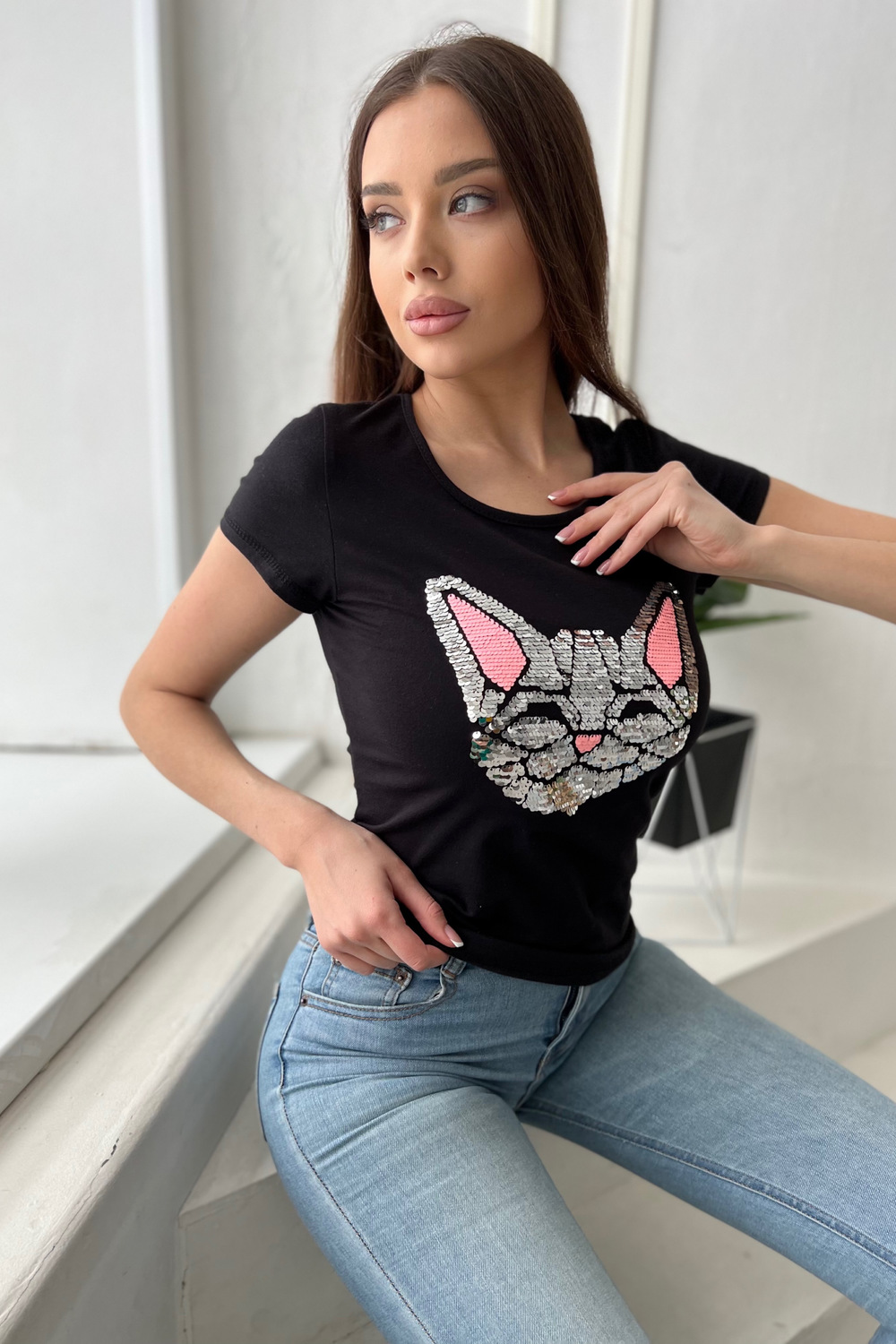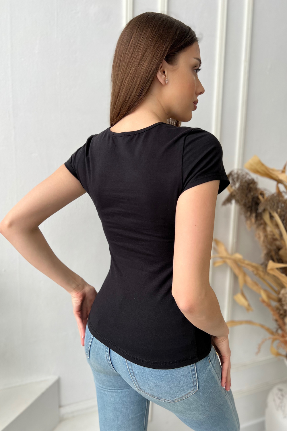 Футболка полуприлегающего силуэта, с округлой горловиной, длиной до середины бедра. Рукав втачной короткий. Горловина обработана бейкой из основного полотна.