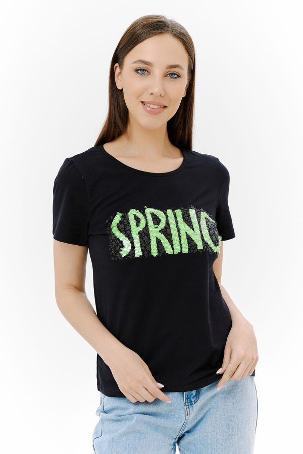 Футболка прямого силуэта, с округлой горловиной, длиной до середины бедра. Рукав втачной, короткий. Горловина обработана бейкой из основного полотна. На полочке эффектная переливающаяся аппликация с пайетками
