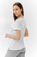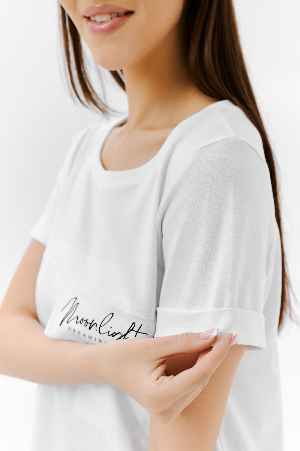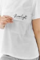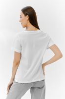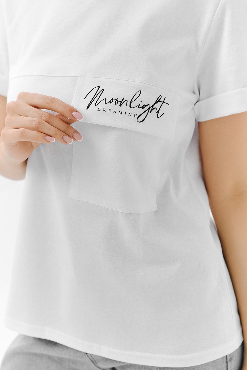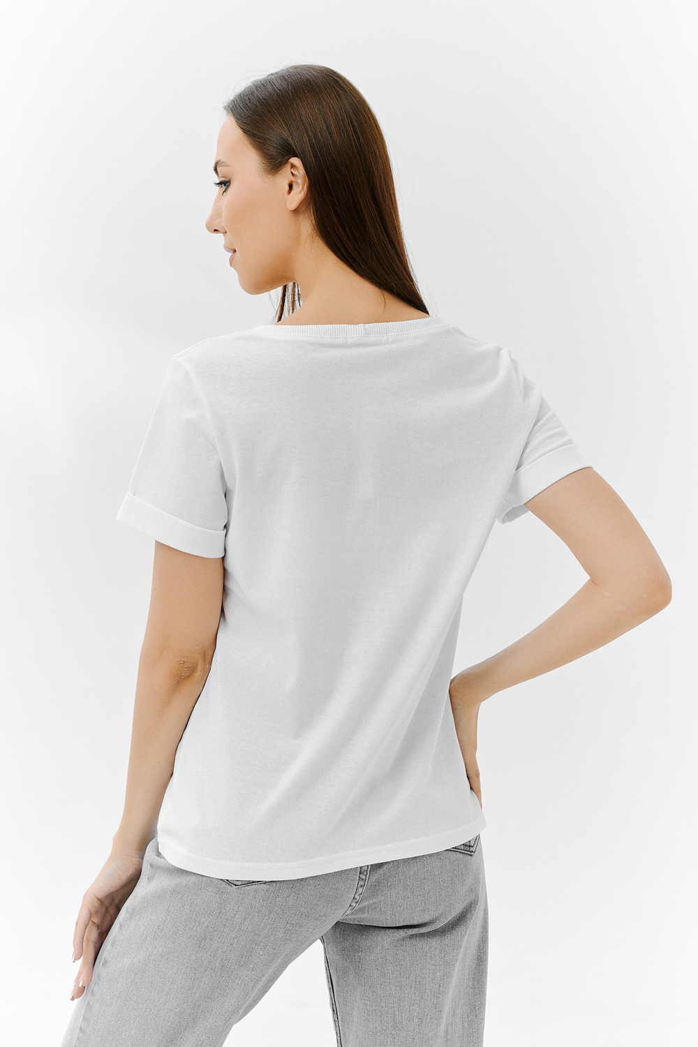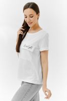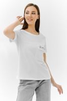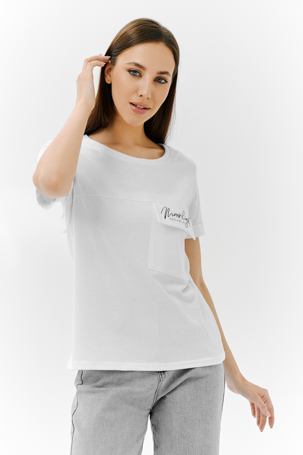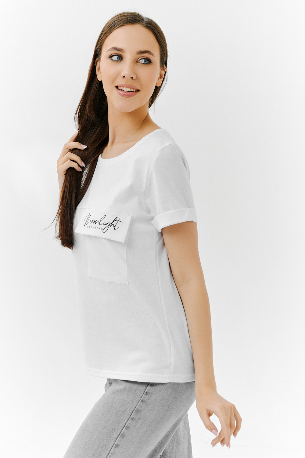 Футболка прямого силуэта, с округлой горловиной, длиной до середины бедра. Рукав втачной, короткий, с отворотом. На полочке расположен накладной карман с клапаном. Горловина обработана обтачкой из эластичного полотна.