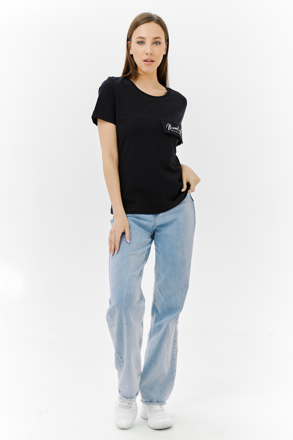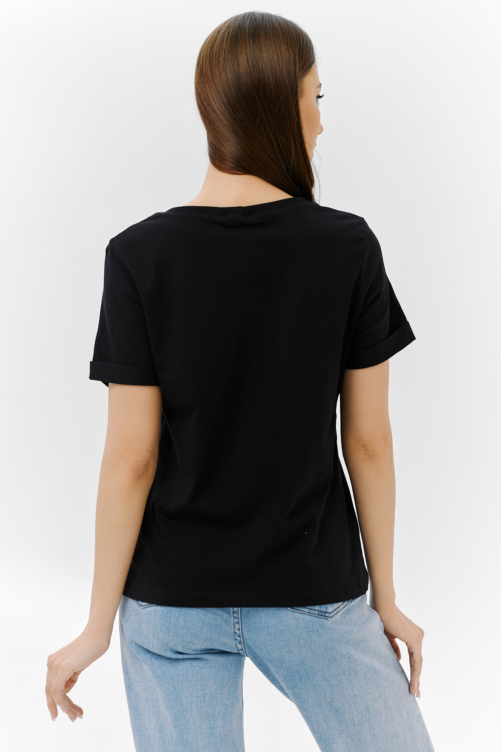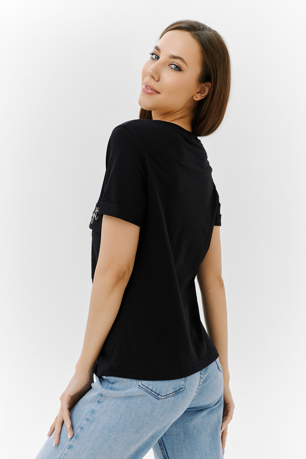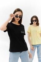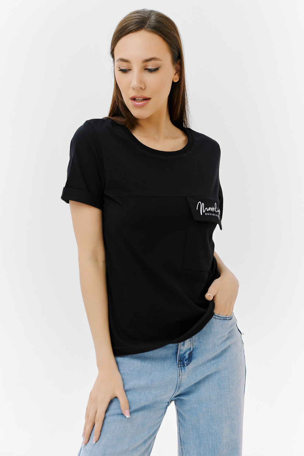 Футболка прямого силуэта, с округлой горловиной, длиной до середины бедра. Рукав втачной, короткий, с отворотом. На полочке расположен накладной карман с клапаном. Горловина обработана обтачкой из эластичного полотна.