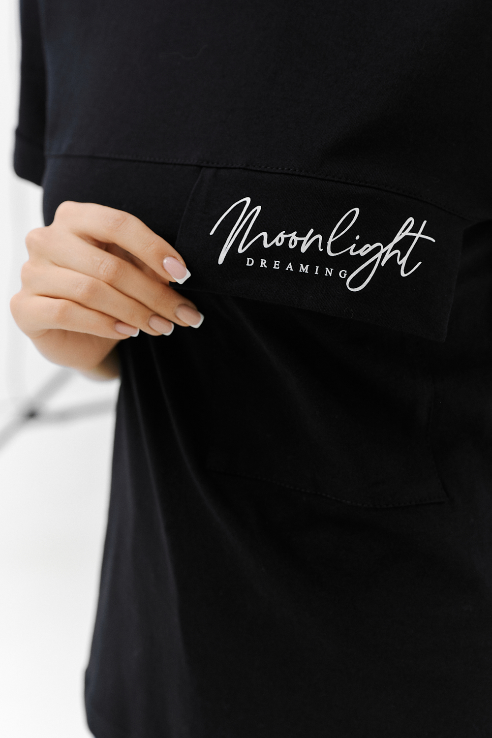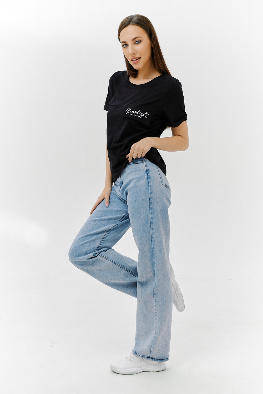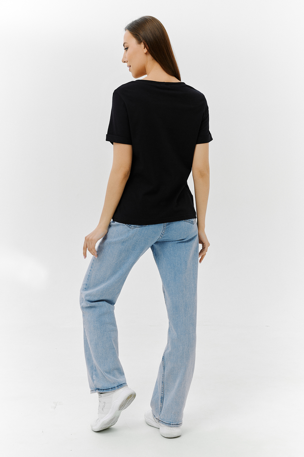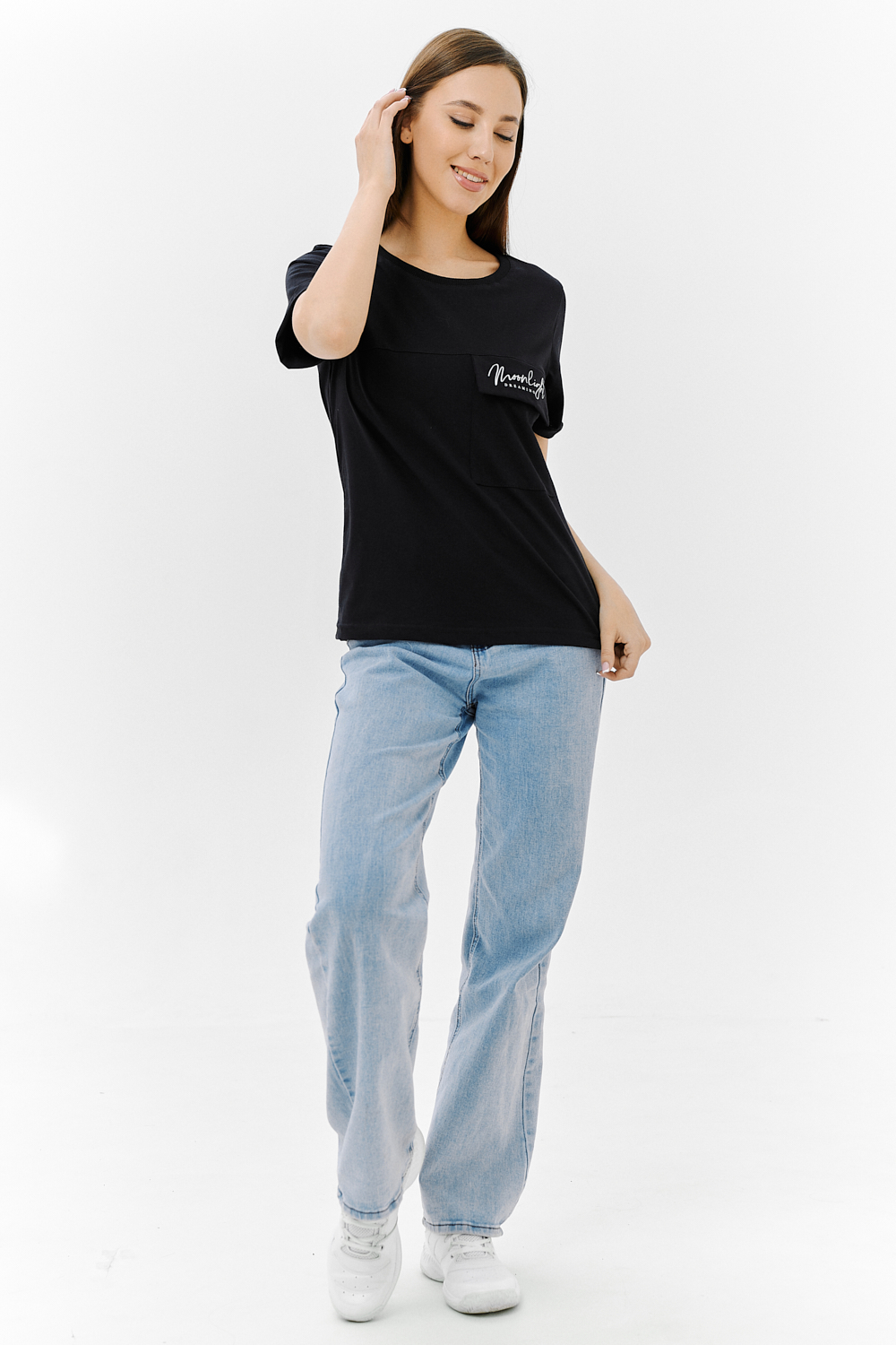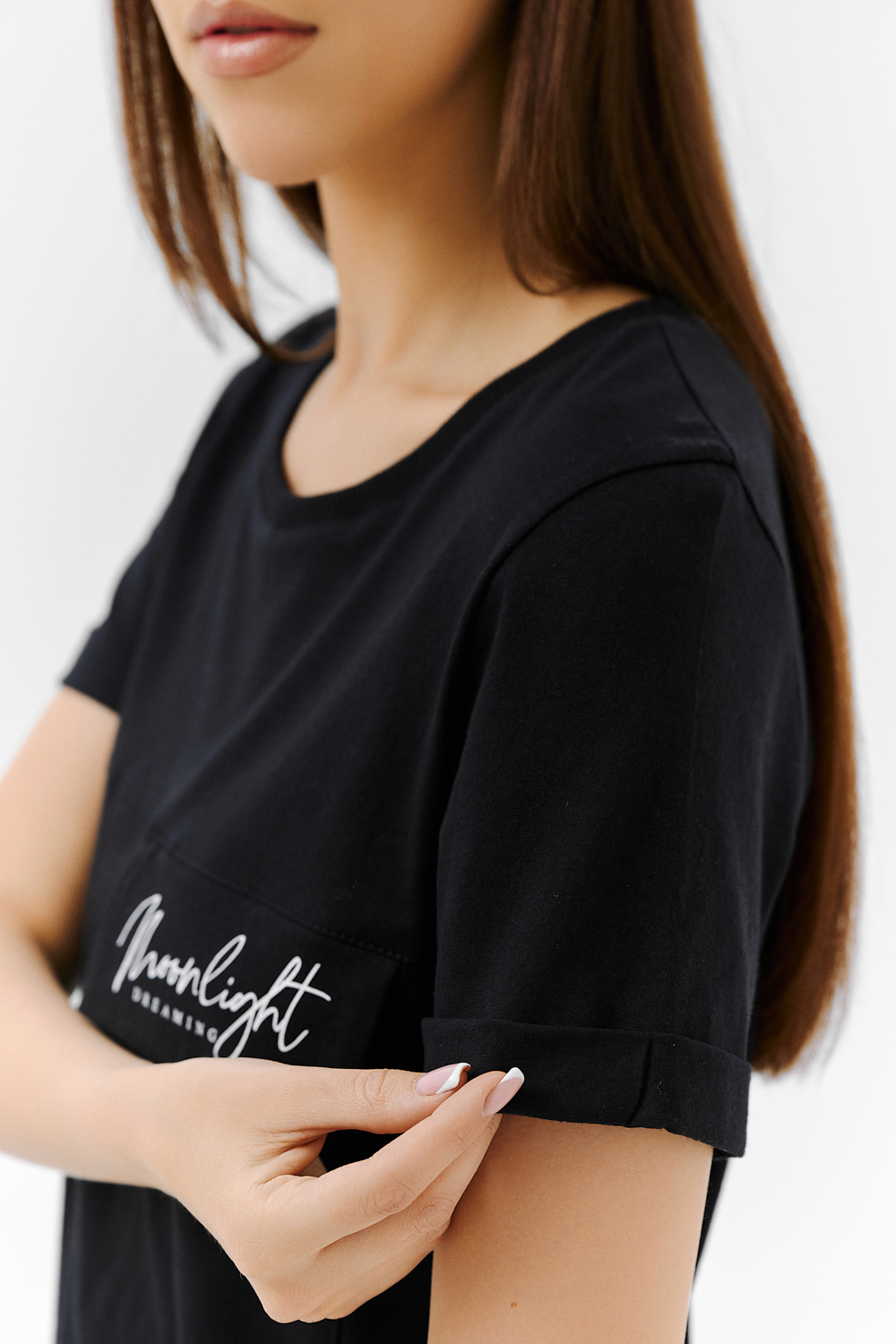Футболка прямого силуэта, с округлой горловиной, длиной до середины бедра. Рукав втачной, короткий, с отворотом. На полочке расположен накладной карман с клапаном. Горловина обработана обтачкой из эластичного полотна.