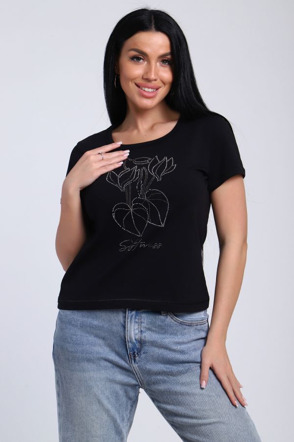 Футболка прямого силуэта, с округлой горловиной, с разрезами в нижней части боковых швов. Полочка с симметричными кокетками. Спинка с кокеткой, удлиненная. Горловина обработана обтачкой из основного полотна.