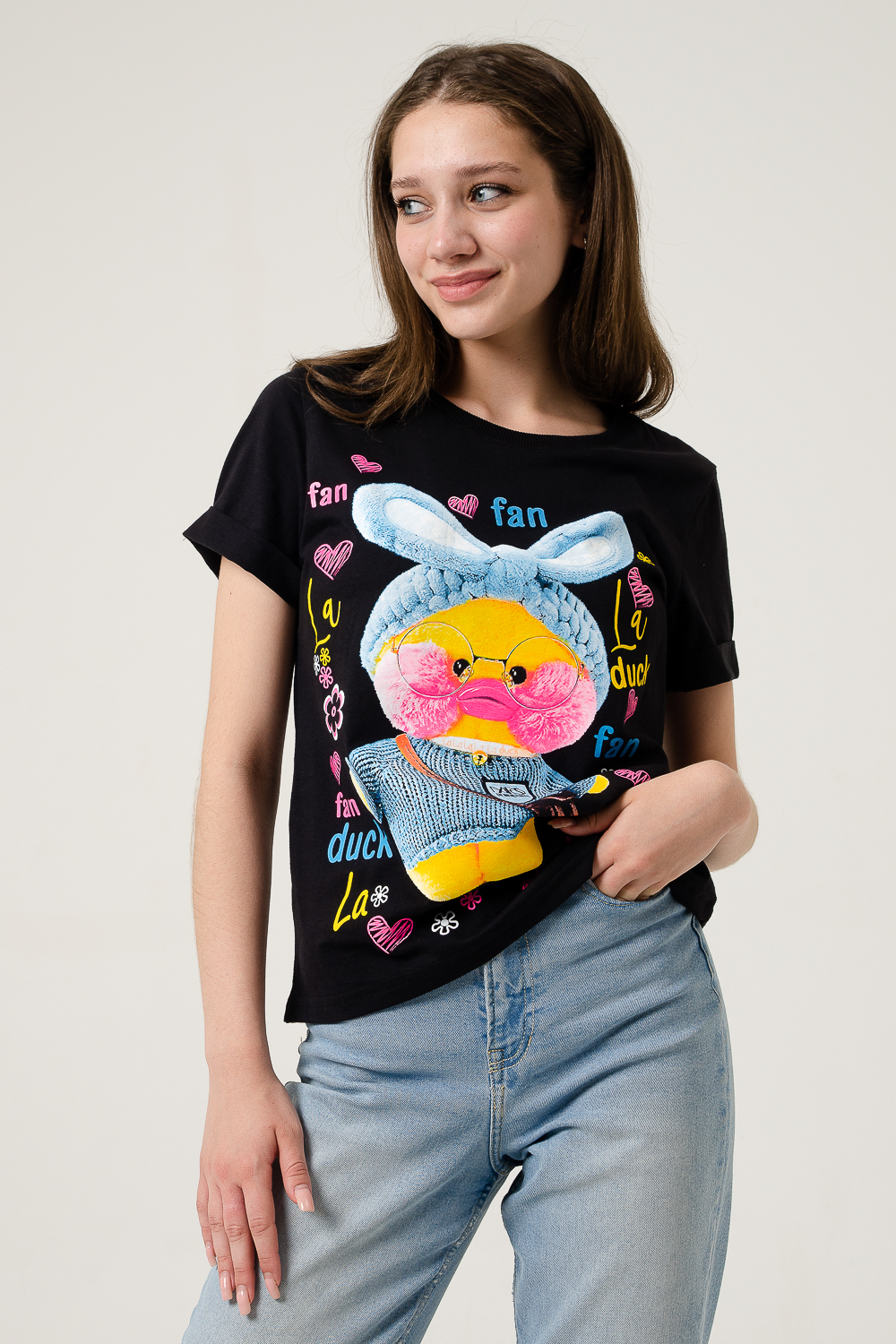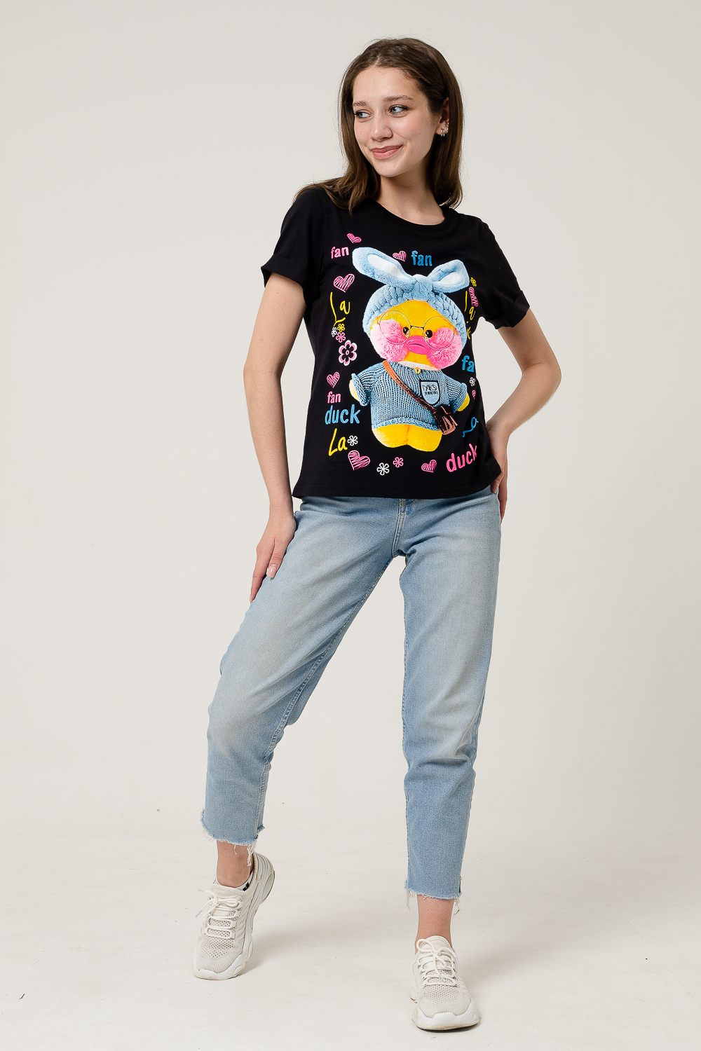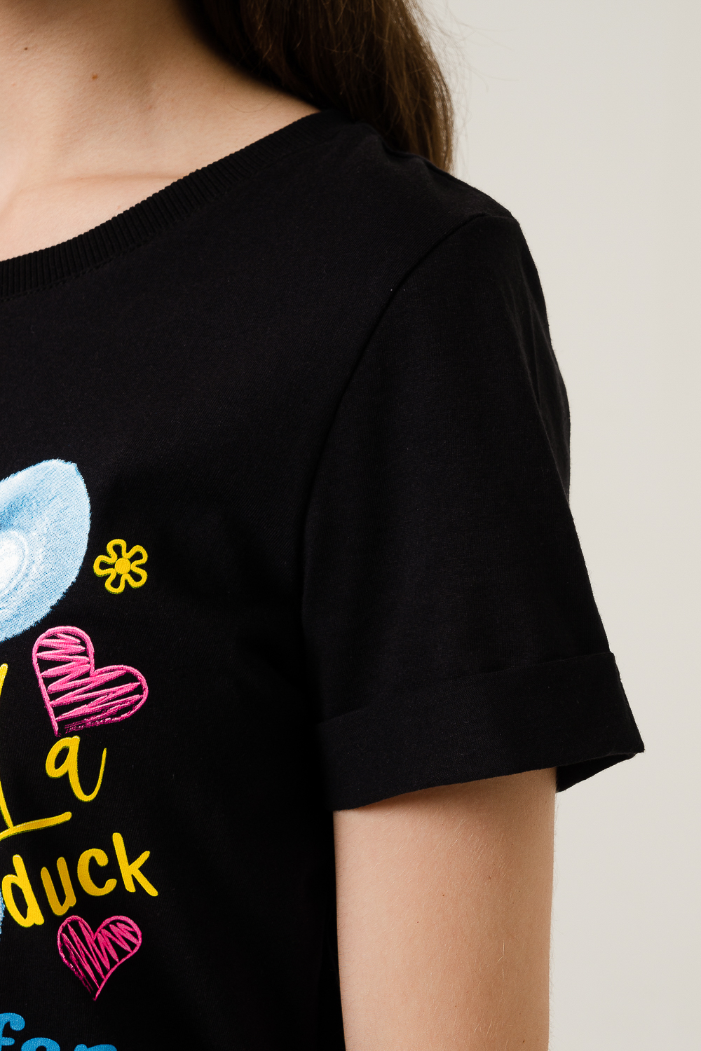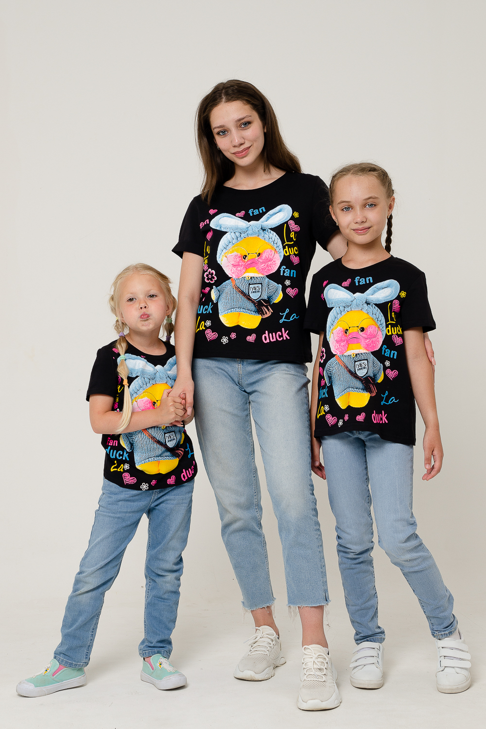 Футболка прямого силуэта, с округлой горловиной, длиной до середины бедра. Рукав втачной, короткий, с отворотом. Горловина обработана обтачкой из эластичного полотна. В продаже есть аналогичная детская футболка 5126