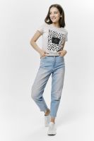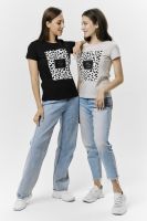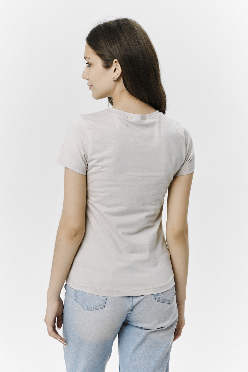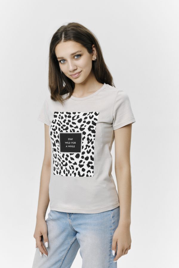 Футболка прямого силуэта, с округлой горловиной, длиной до середины бедра. Рукав втачной, короткий. Горловина обработана обтачкой из основного полотна.