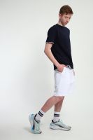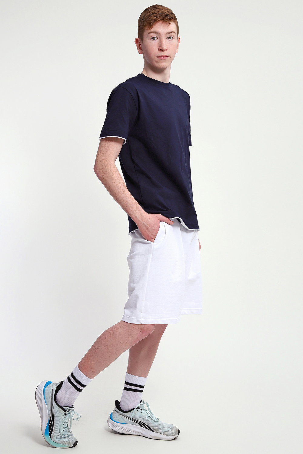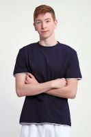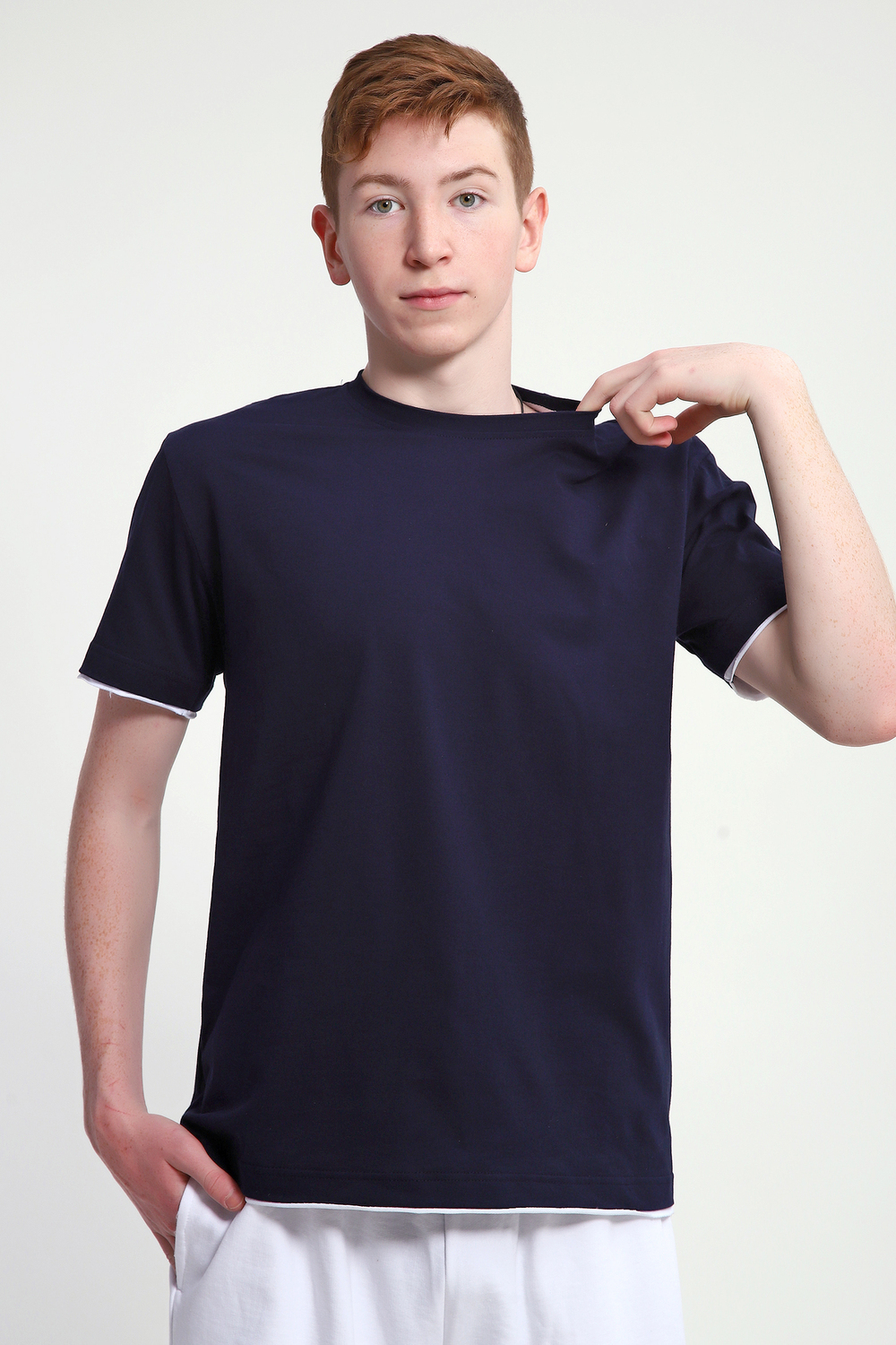 Футболка мужская выполнена из кулирки 100% хлопок. Горловина обработана обтачкой из основной ткани и х/б киперной лентой контрастного белого цвета. Низ изделия и рукава отделаны тканью контрастного белого цвета с необработанным краем. Футболка имеет комфортную посадку, отлично подойдет как для дома, так и для прогулок и спорта.