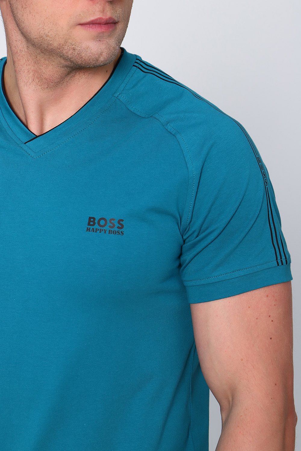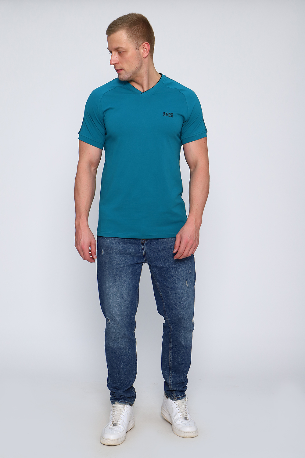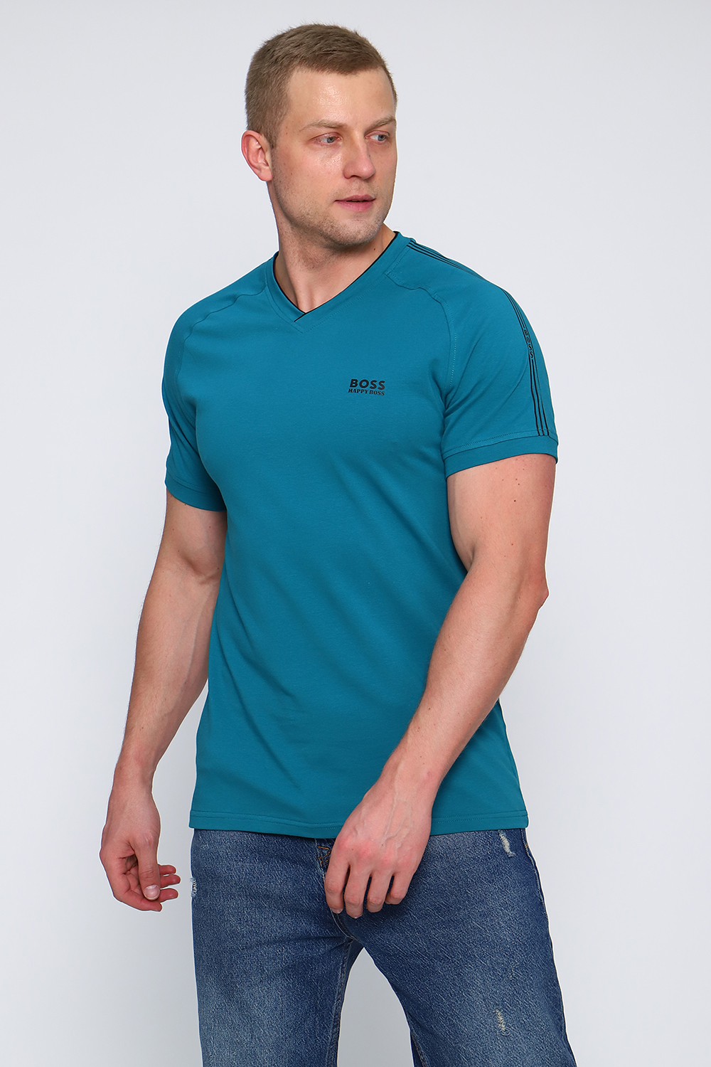 Мужская футболка представлена в пяти цветах, изготовлена из качественной кулирки с лайкрой; материал дышащий, крайне приятен к телу. Ворот футболки V-образный, обработан контрастной окантовкой, рукав-реглан на манжете. Изделие дополнено лаконичной печатью на груди, также печать нанесена вдоль по длине рукава. Футболка идеально садится на фигуру, не сковывает движения.