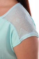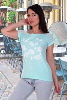 Футболка женская с принтом из комбинированного трикотажа - кулирки и ажурного трикотажа. Футболка слегка приталенная, горловина в виде лодочки, спущенная пройма, на плечах кокетка - "погоны" из ажурного трикотажа. Низ спинки удлинён и слегка закруглён. Футболка из натурального 100% хлопка - комфортная, приятная к телу, подойдёт как для повседневного гардероба, так и для активного отдыха.