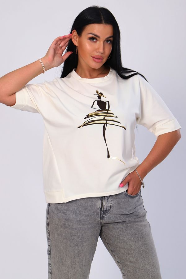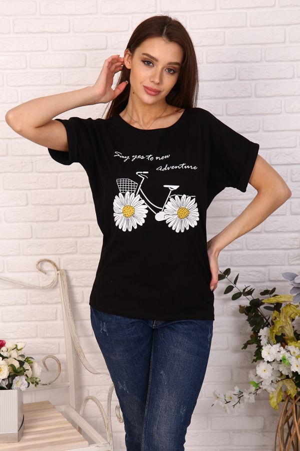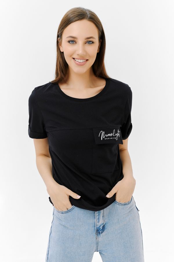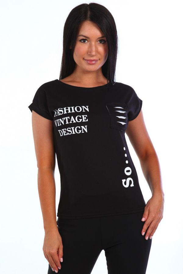 Элегантная женская футболка из кулирки. Две расцветки — белая и черная. Принт в виде надписей, спереди декоративный карман с разрезами. Размеры от 40 до 52.
