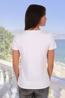 Футболка из кулирки с лайкрой пенье полуприлегающего силуэта, с округлой горловиной, длиной до середины бедра. Рукав втачной короткий. Горловина обработана бейкой из основного полотна.
