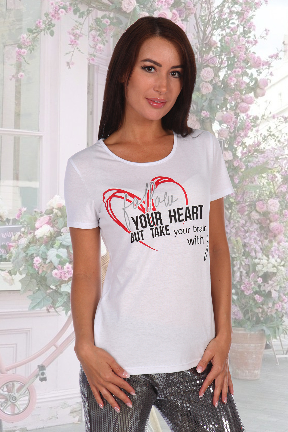 Футболка из кулирки полуприлегающего силуэта, с округлой горловиной, длиной до середины бедра. Рукав втачной короткий. Горловина обработана бейкой из основного полотна