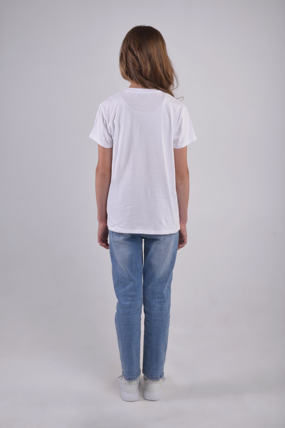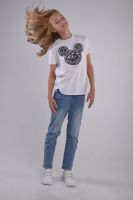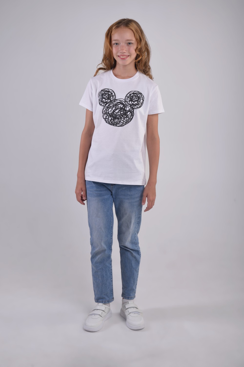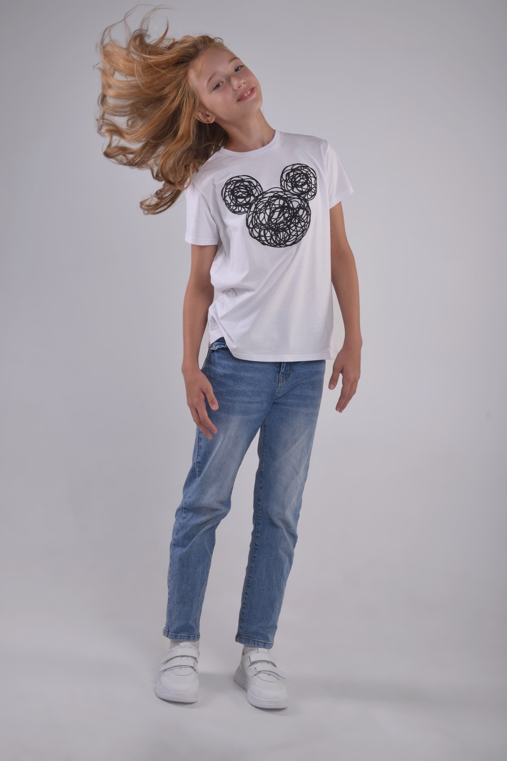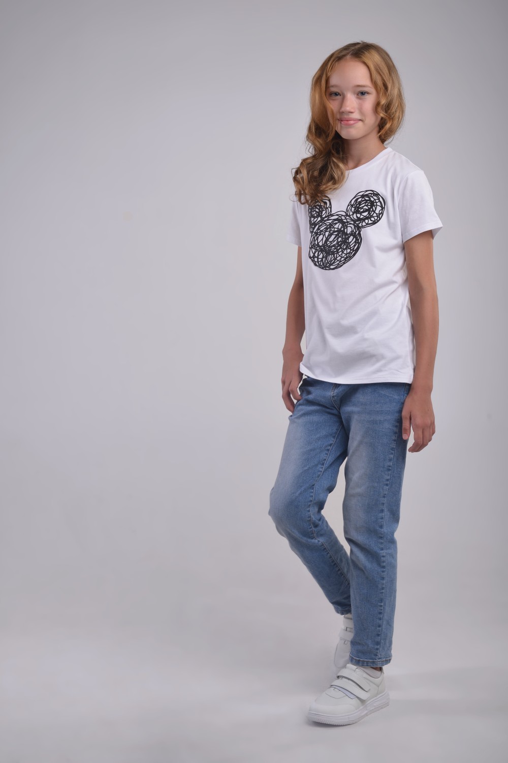 Футболка для девочки подростка белого цвета, свободного классического кроя, классической длины, модная, стильная, нарядная, озорная из мягкого хлопкового полотна 170 г/м2 с трендовым стильным принтом. Пафф принт - технология, позволяющая наносить рельефный рисунок на поверхность ткани, сохраняет свое качество после стирки и растяжения. Крупный объемный принт Микки черного цвета поможет создать модный образ, станет незаменимой частью гардероба самой стильной современной девчонки. Модель - скромница Саша, 11 лет, рост 158 см, размер футболки на девочке - 158-164 см