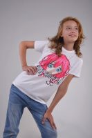 Футболка для девочки подростка белого цвета, свободного классического кроя, классической длины, модная, стильная, нарядная, озорная, аниме из мягкого хлопкового полотна 170 г/м2 с трендовым стильным неоновым принтом , выполненным в технологии вотер принт - нанесение рисунка безопасными сертифицированными красителями на водной основе, что позволяет изделию оставаться мягким, тонким и эластичным, долго сохранять яркость. Футболка с трендовым ярким принтом в стиле аниме, чрезвычайно популярном среди подростков, создаст неповторимый стильный образ, который позволит выглядеть модно и современно. Модель - 11 лет, рост 158 см, размер футболки на девочке - 158-164 см
