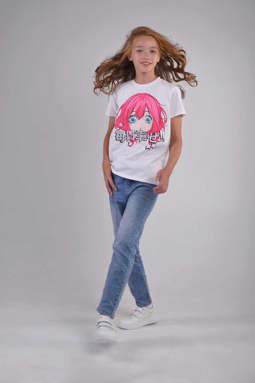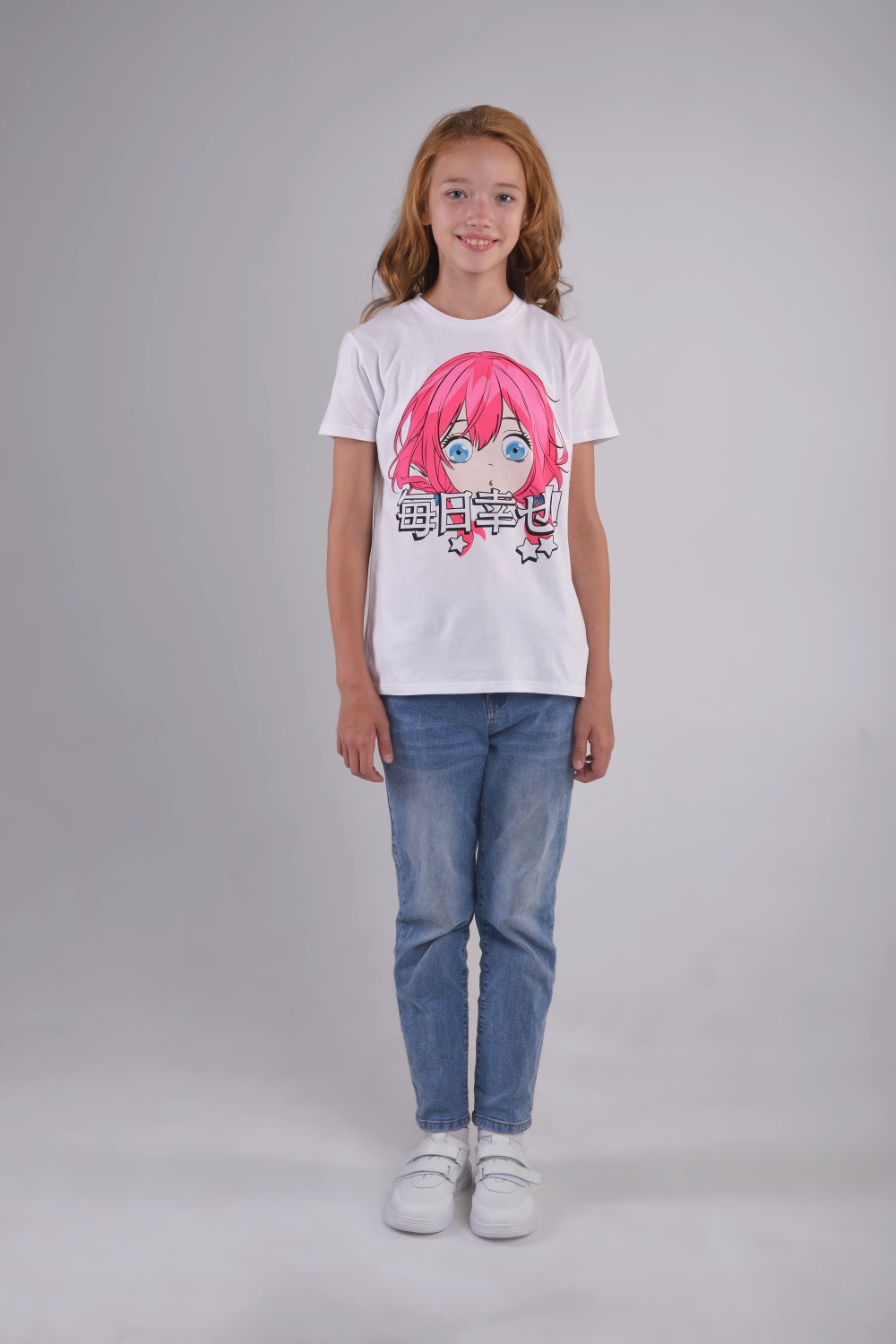 Футболка для девочки подростка белого цвета, свободного классического кроя, классической длины, модная, стильная, нарядная, озорная, аниме из мягкого хлопкового полотна 170 г/м2 с трендовым стильным неоновым принтом , выполненным в технологии вотер принт - нанесение рисунка безопасными сертифицированными красителями на водной основе, что позволяет изделию оставаться мягким, тонким и эластичным, долго сохранять яркость. Футболка с трендовым ярким принтом в стиле аниме, чрезвычайно популярном среди подростков, создаст неповторимый стильный образ, который позволит выглядеть модно и современно. Модель - 11 лет, рост 158 см, размер футболки на девочке - 158-164 см