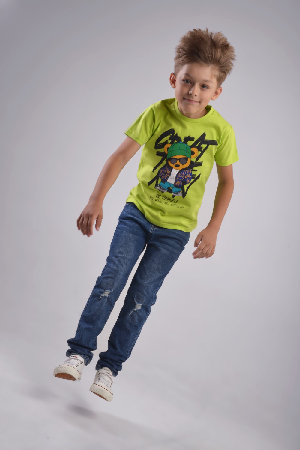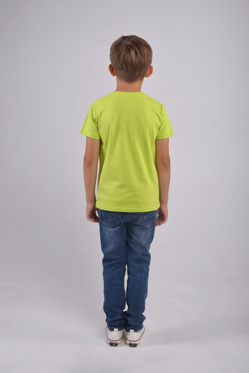 Футболка для мальчика подростка яркого салатового цвета, свободного классического кроя, классической длины, модная, стильная, нарядная, из качественного мягкого хлопкового полотна 170 г/м2 с принтом, выполненным в технологии вотер принт - нанесение рисунка безопасными сертифицированными красителями на водной основе, что позволяет изделию оставаться мягким, тонким и эластичным, долго сохранять яркость. Модная футболка с ярким рисунком в стиле граффити - выбор современных подростков и мальчика-модели на фотосессии. Модель - 9 лет, рост 137 см, размер футболки на мальчике - 134-140 см