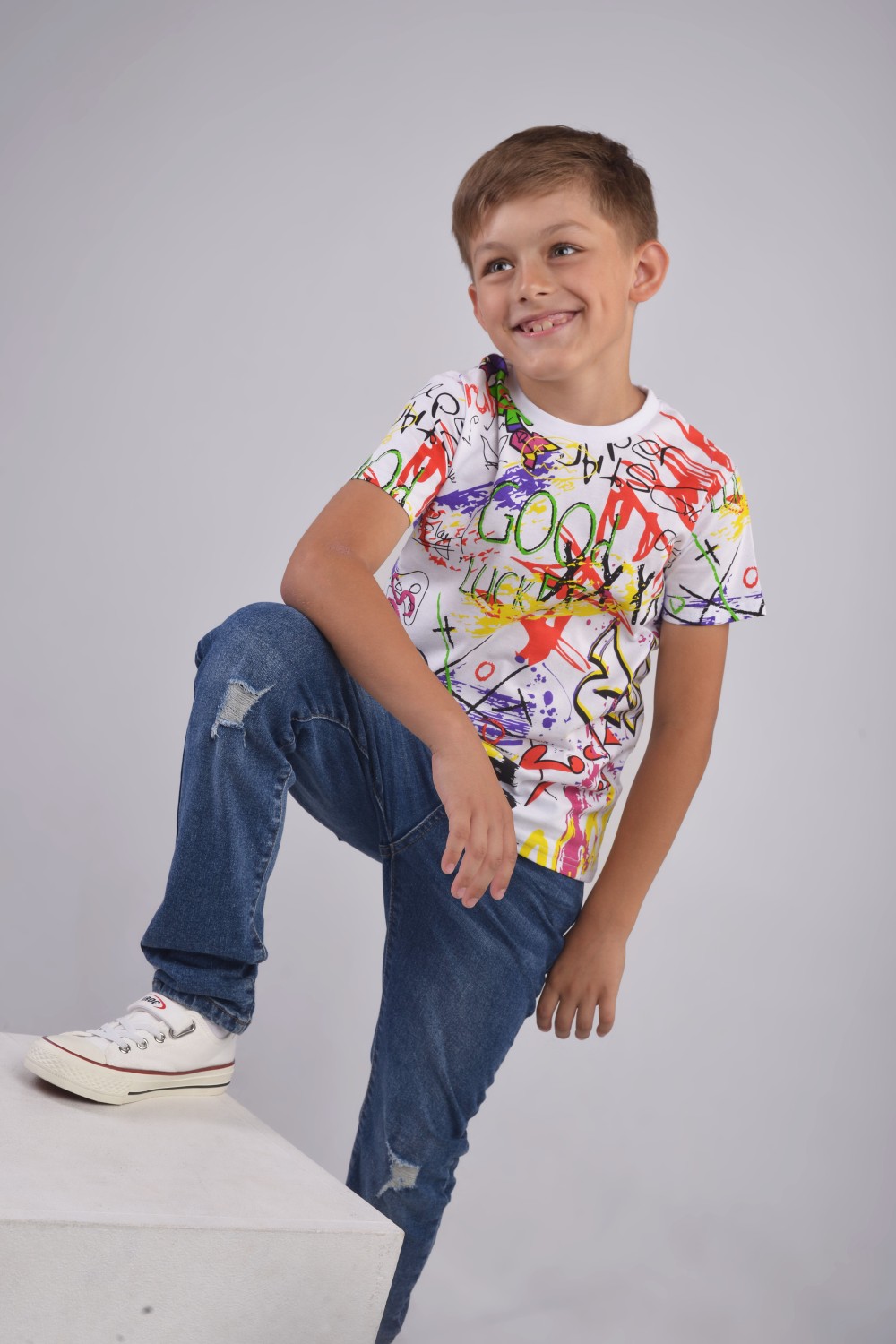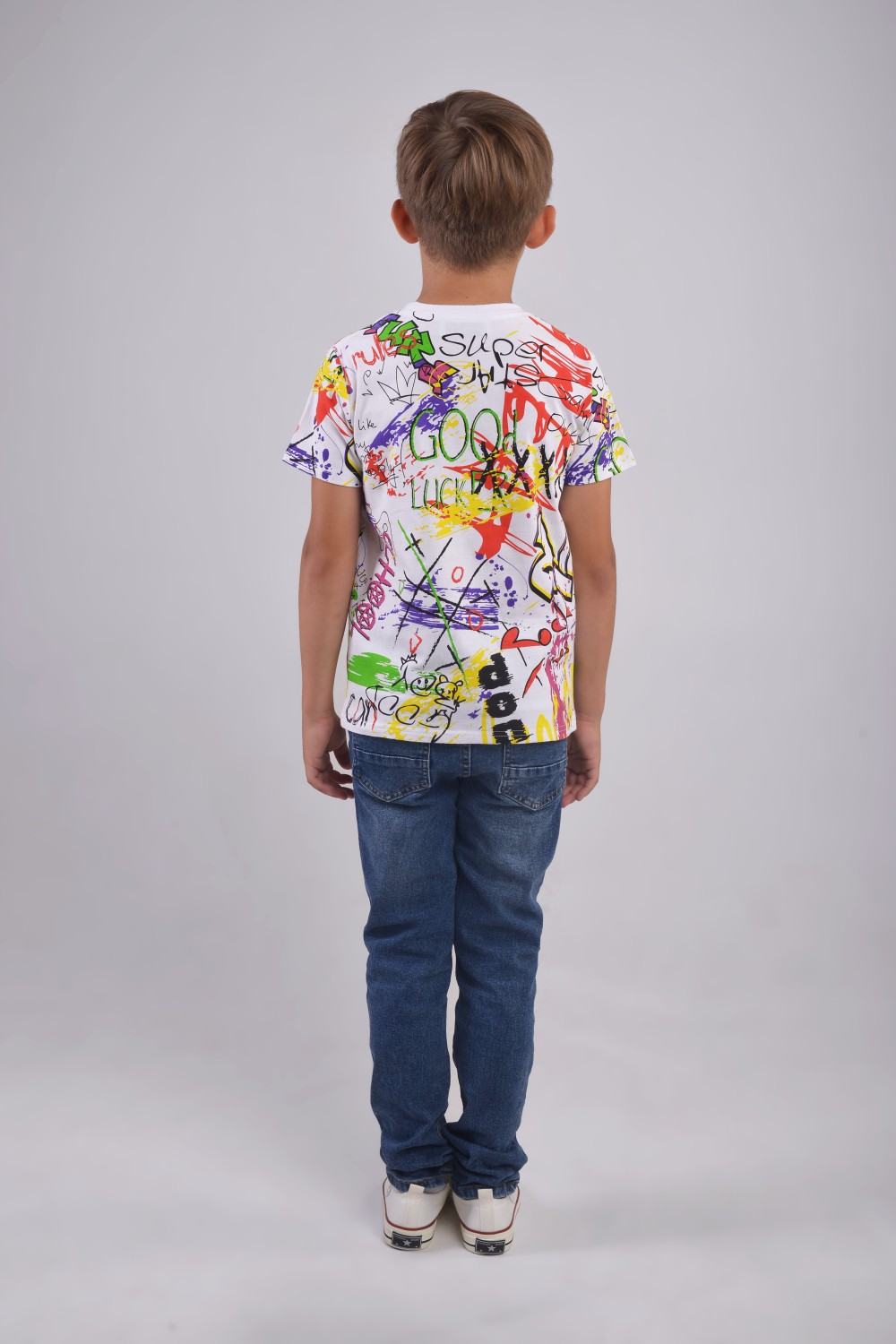 Футболка для мальчика подростка белая, свободного классического кроя, классической длины, модная, стильная, нарядная, из качественного мягкого хлопкового полотна 170 г/м2 с принтом, выполненным в технологии water print (вотер принт) - нанесение рисунка безопасными сертифицированными красителями на водной основе, что позволяет изделию оставаться мягким, тонким и эластичным, долго сохранять яркость. Модная футболка с ярким рисунком в стиле граффити - выбор современных подростков и мальчика-модели на фотосессии. Модель - 9 лет, рост 137 см, размер футболки на мальчике - 134-140 см