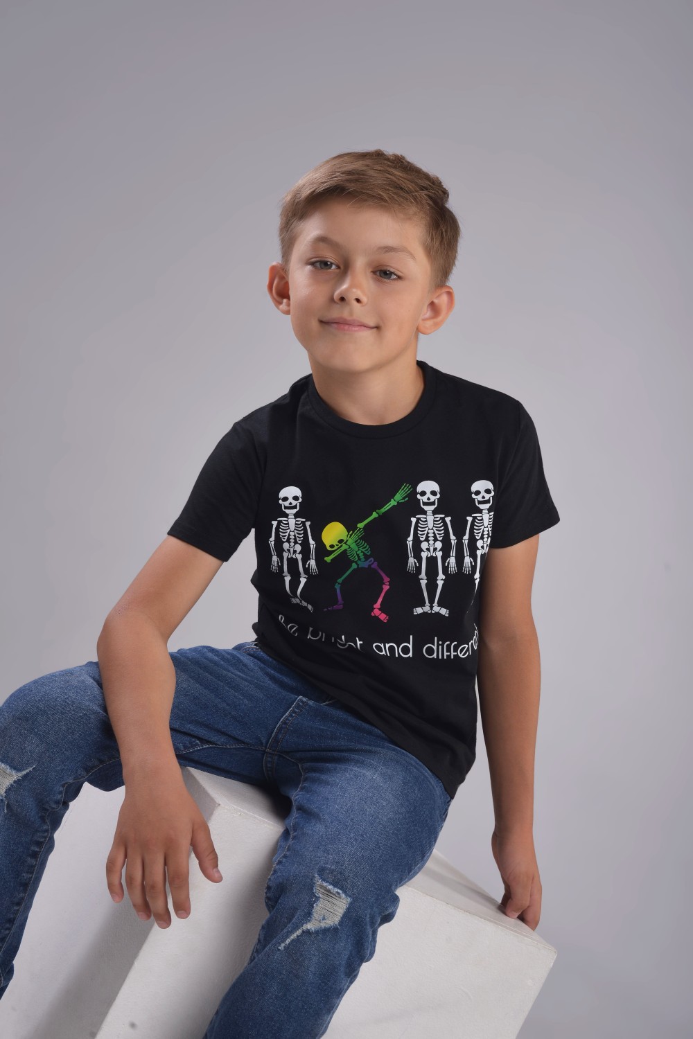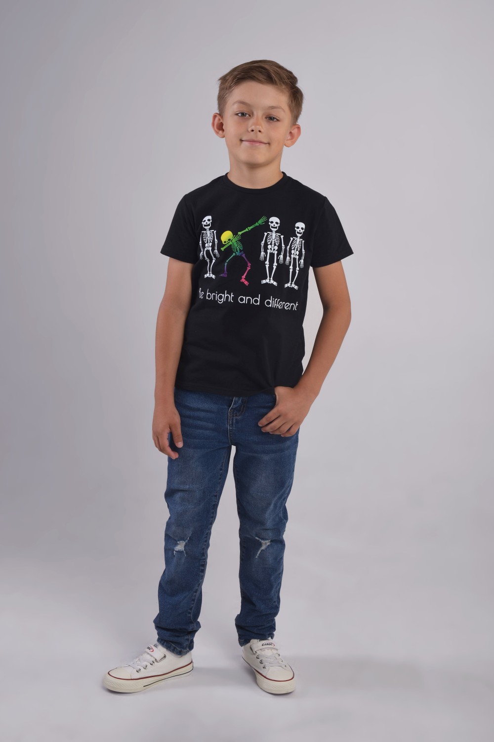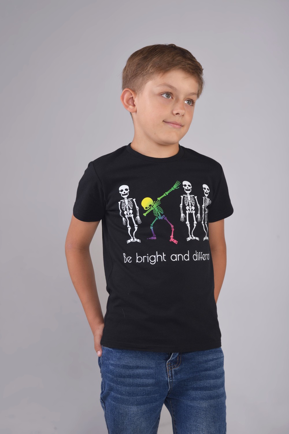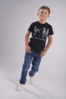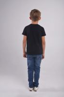 Футболка для мальчика подростка черная, свободного классического кроя, классической длины, модная, стильная, нарядная, из качественного мягкого хлопкового полотна 170 г/м2 с принтом, с transfer print (трансфер принт) - технологией нанесения картинки на изделие с использованием высоких температур. Хулиганский принт с танцующими скелетами и динамичный слоган - привлекательный элемент и яркий нестандартный ход в детской одежде. Модель - спортсмен Артем, 9 лет, рост 137 см, размер футболки на мальчике - 134-140 см